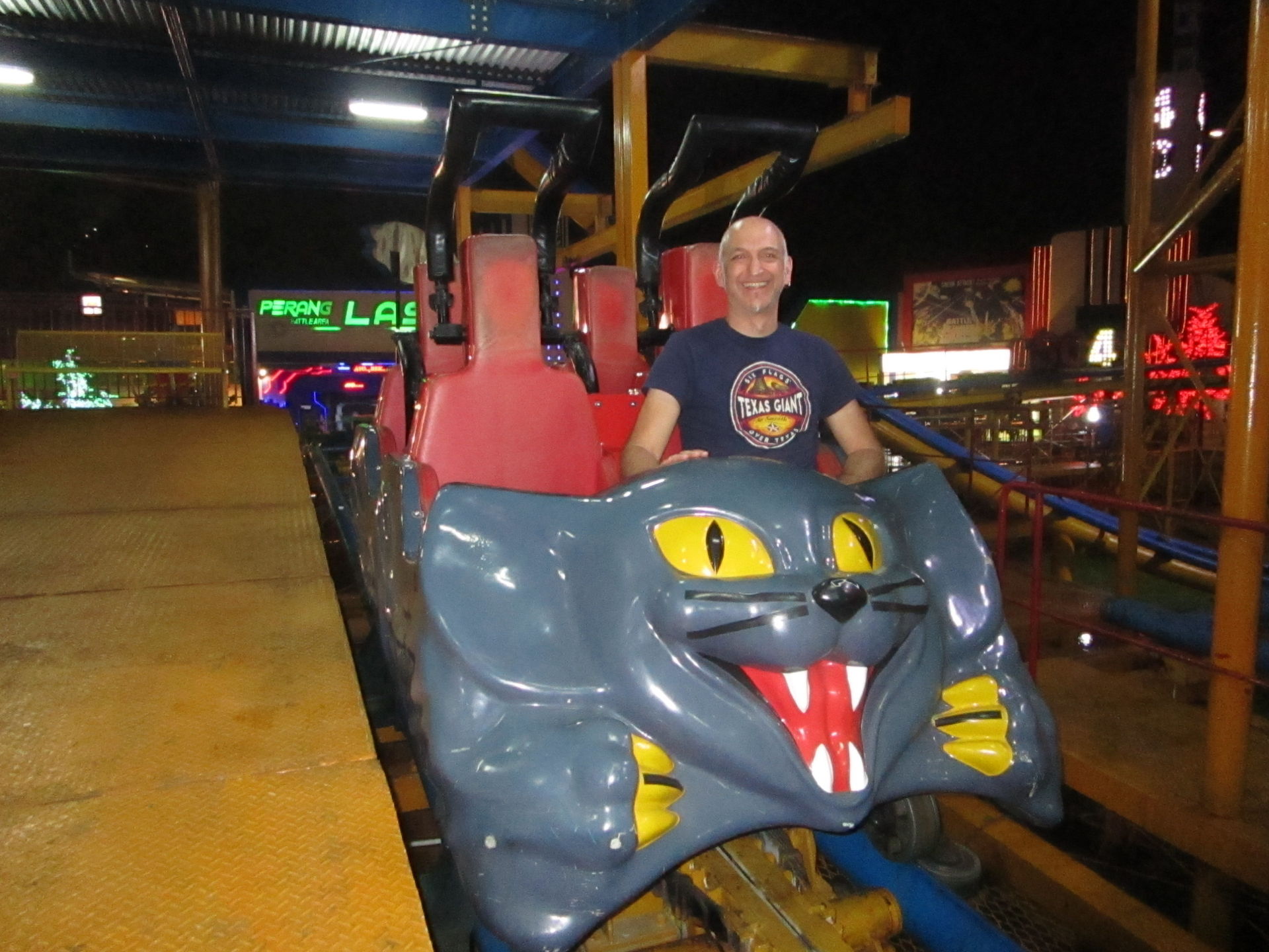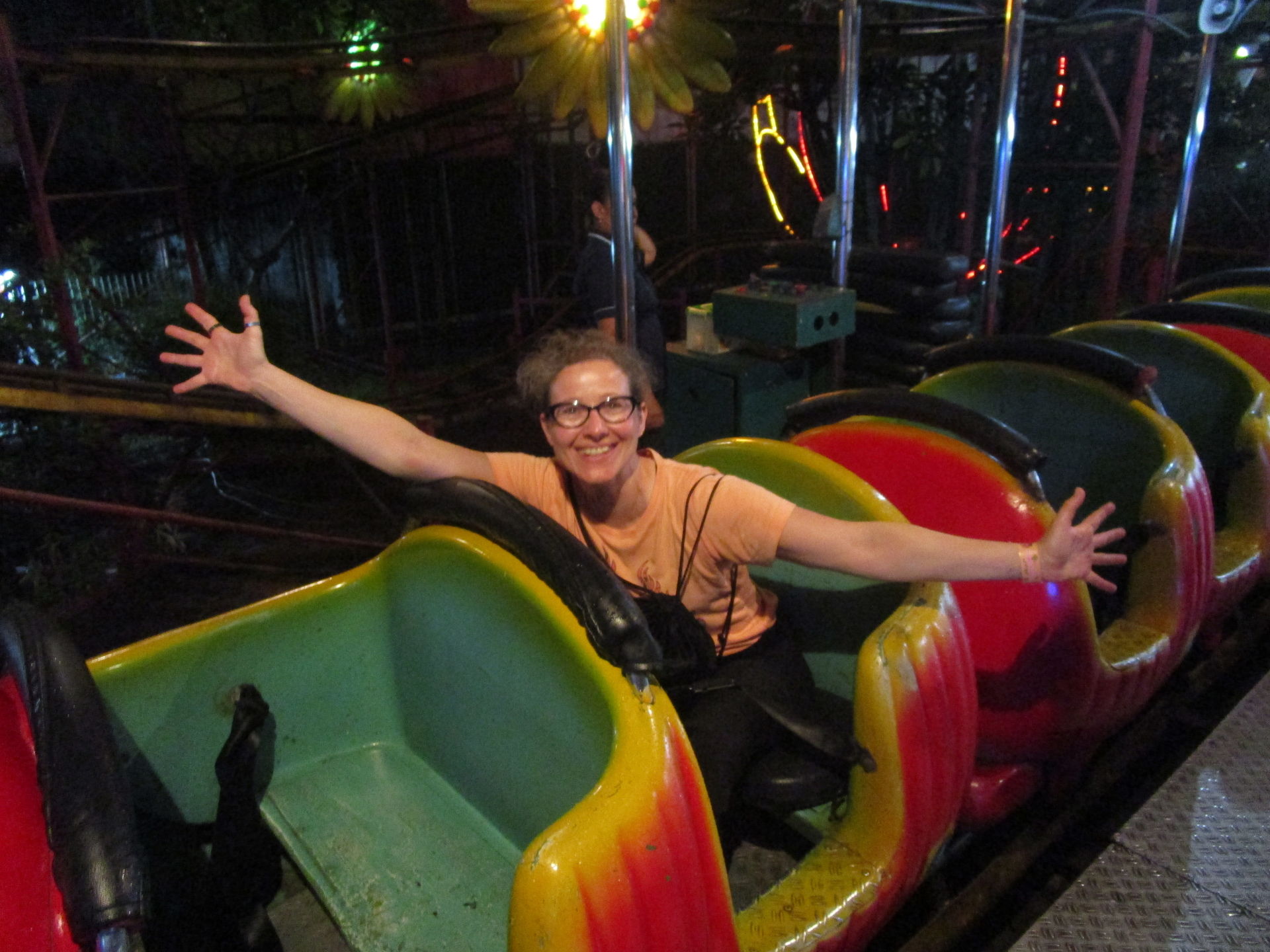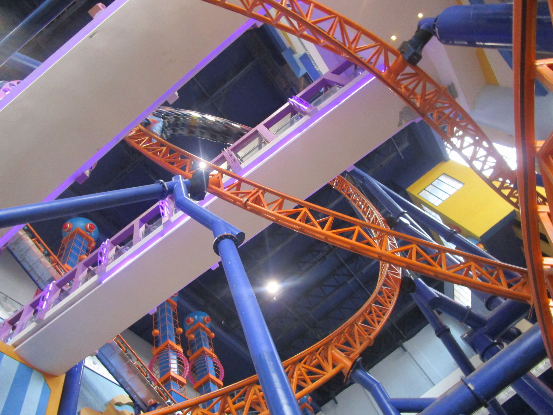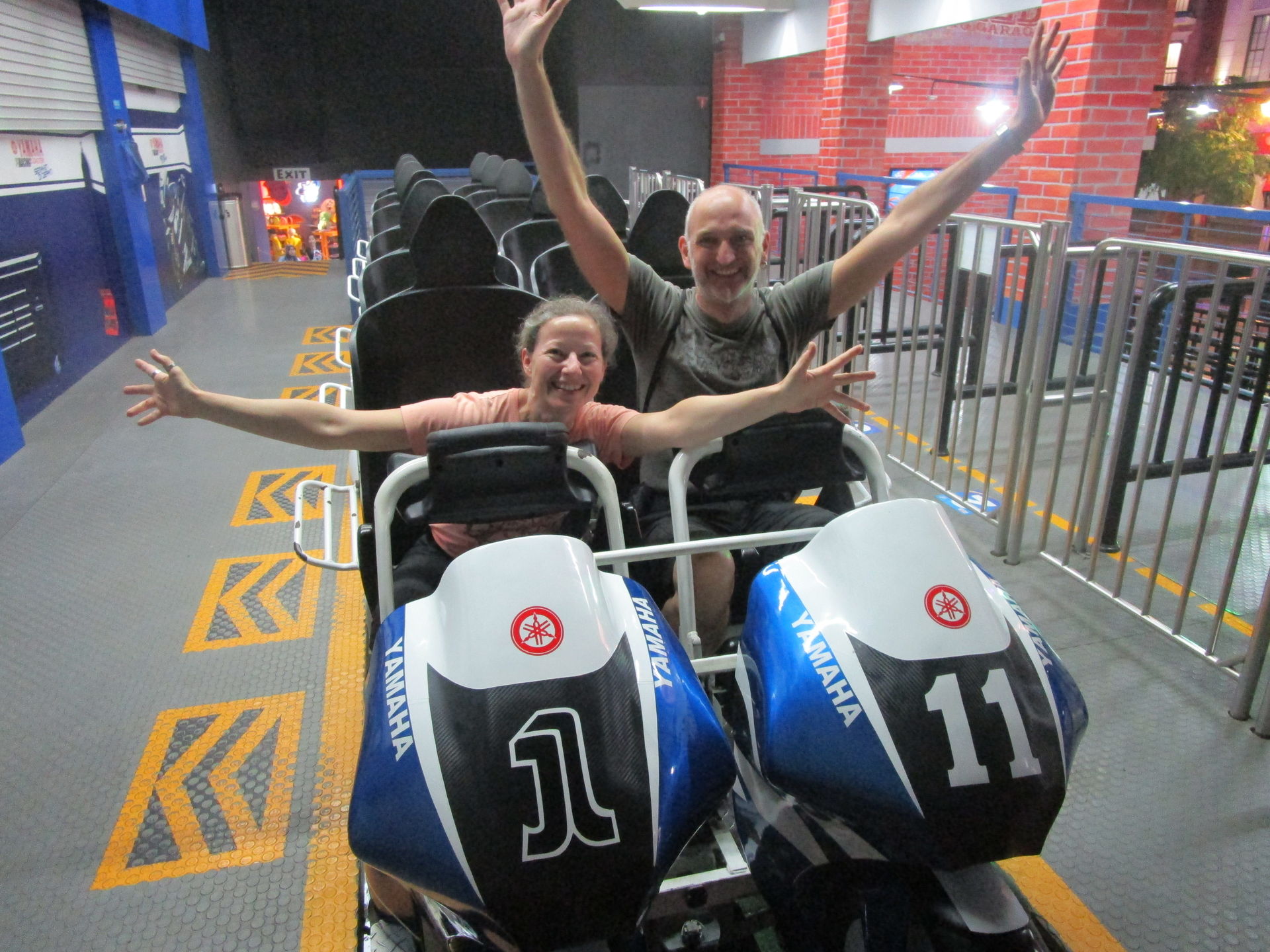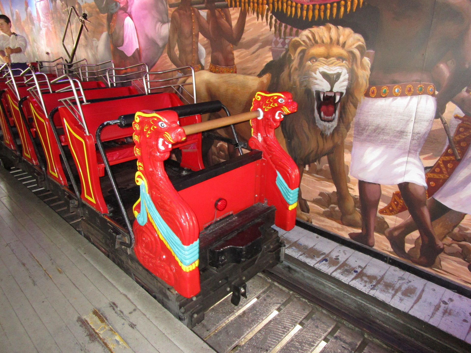 Dreimal nachfragen später finden wir uns in der Einkaufszentrumsspielzone mit allerlei elektrisch betriebenen Unterhaltungsapparaten für den Nachwuchs wieder und entdecken eine sehr skurrile, an einen Mack Spinning Coaster erinnernde Ausgabe einer solchen Drehbahn mit unfassbar langer Fahrdauer, die aber richtig viel Gaudi macht, was nicht zuletzt an der engen Mallarchitektur liegt, die man während der Fahrt mit den Händen ertasten könnte, wenn man wollte.