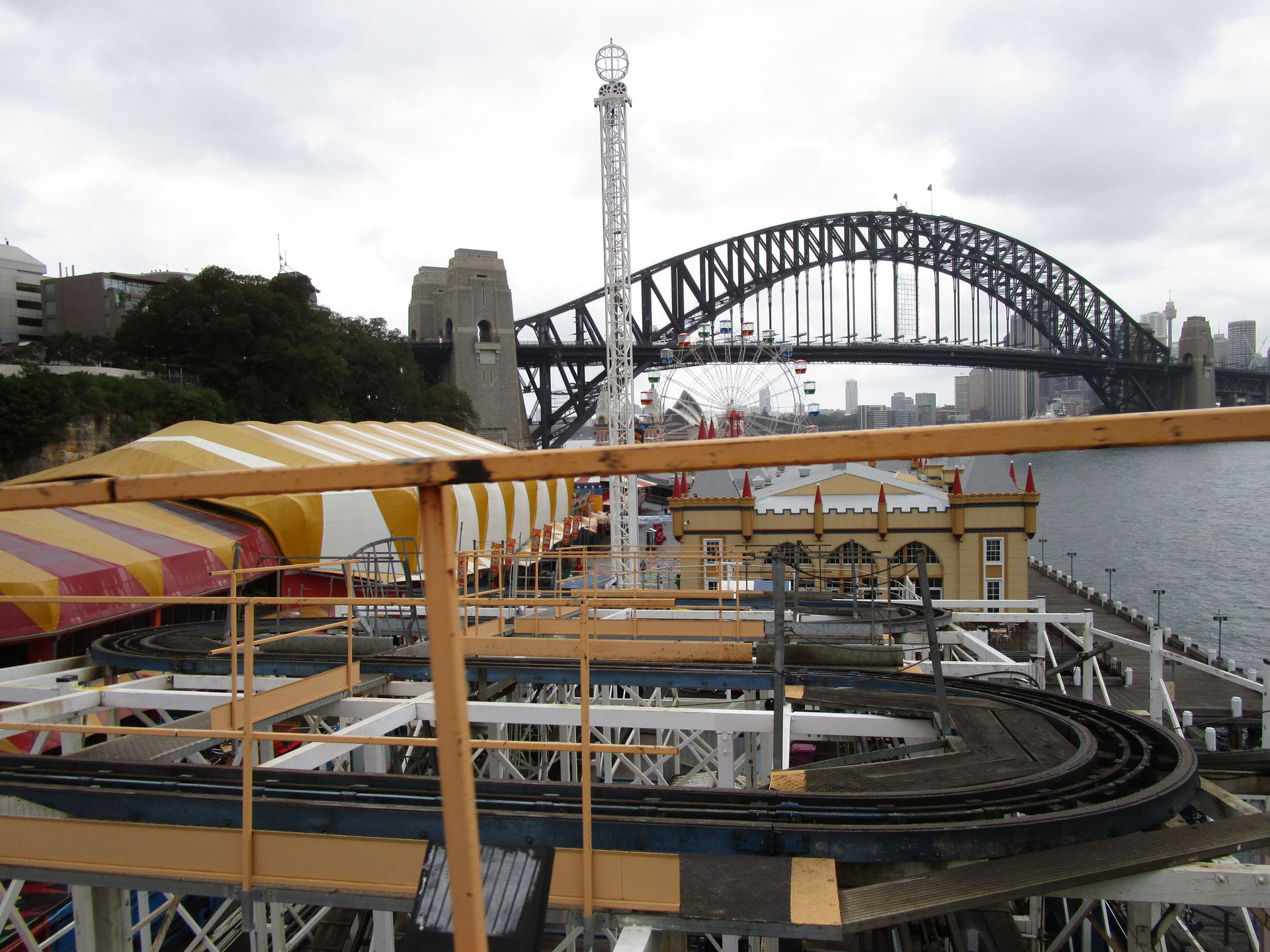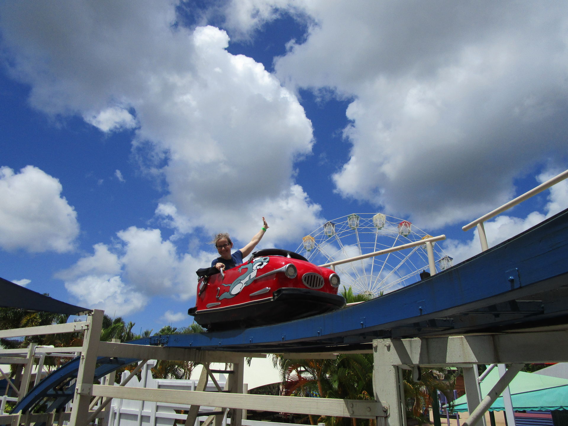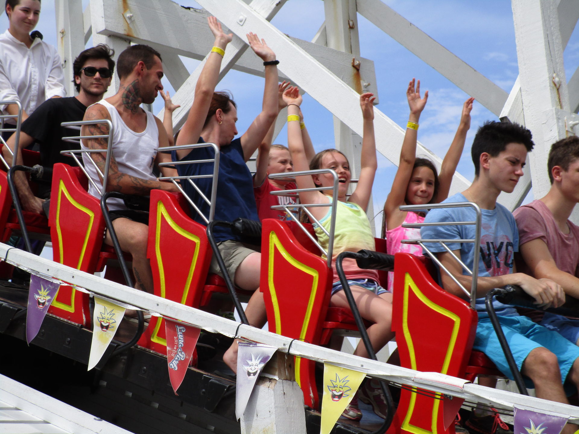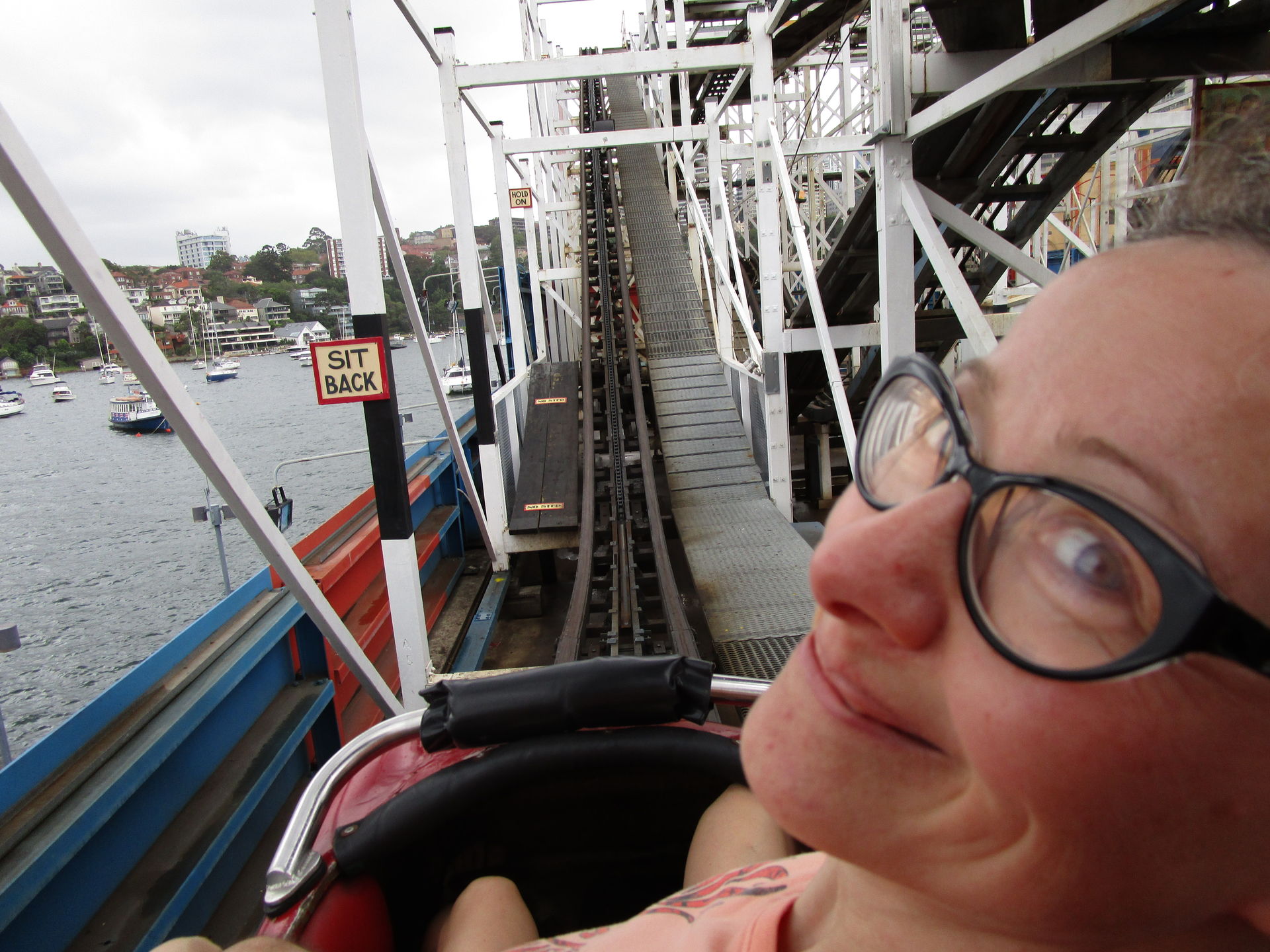 Nach diesem achterbahntechnischen Amuse-Gueule kommen wir im Luna Park jetzt direkt zum ersten Hauptgang der Tour. Die zweitälteste Achterbahn und man könnte auch sagen, der Grund, warum wir die Tour nicht in Sydney beginnen, steht auf dem Plan. Seine alten, wunderschön gepflegten Wagen sehen dem spanischen Verwandten Montana Suiza zum Verwechseln ähnlich. Wie auch bei den meisten anderen Aussichtsschienenbahnen befördert uns hier ein Seil zum erhabensten Punkt hinauf, um von dort in scheinbar harmonischen Wellenformen und vermutlich zart gebremst zwei Mal die äußere Parkbegrenzung entlang zurück zur Station zu rollen. So denken wir jedenfalls.
