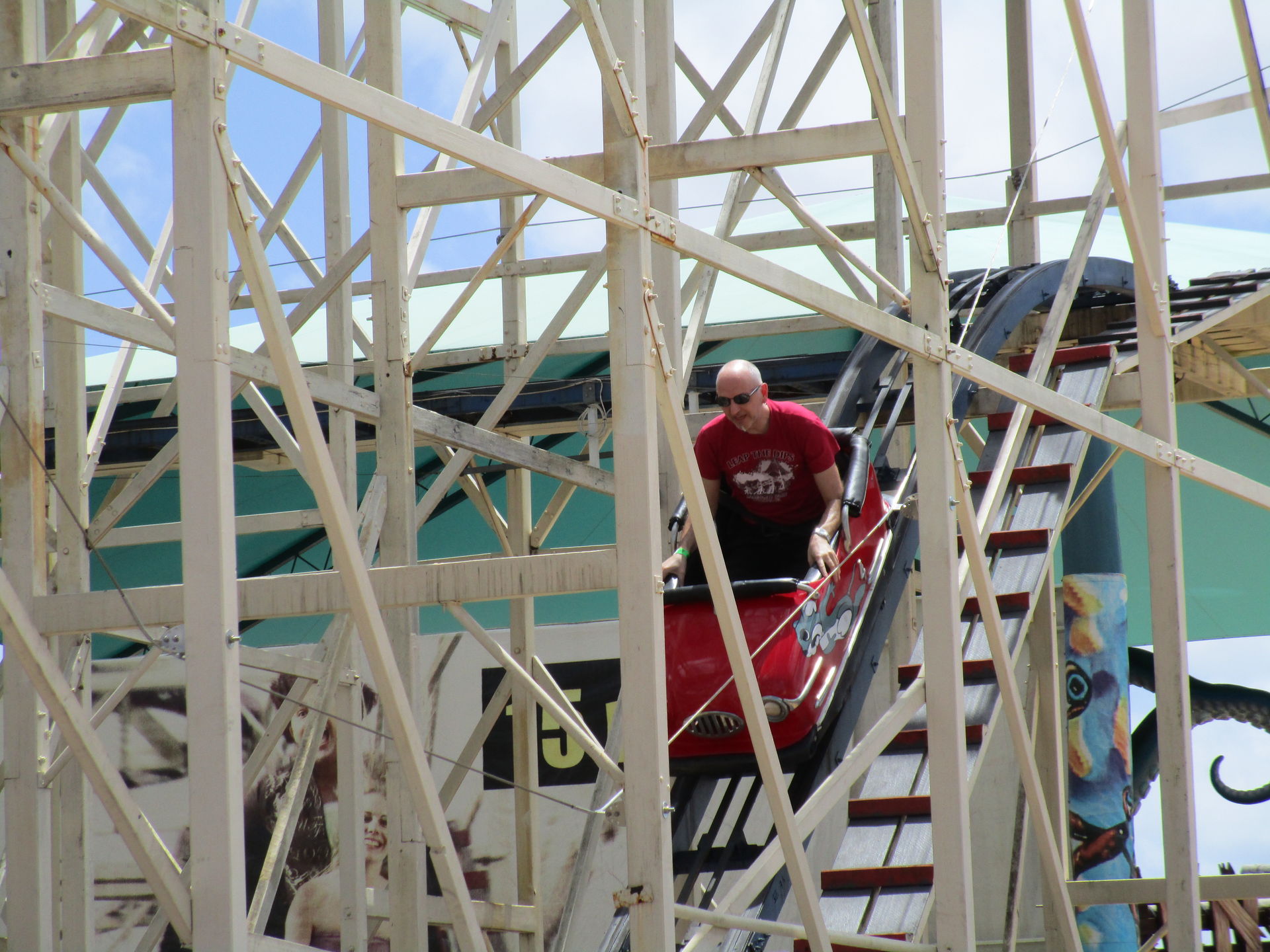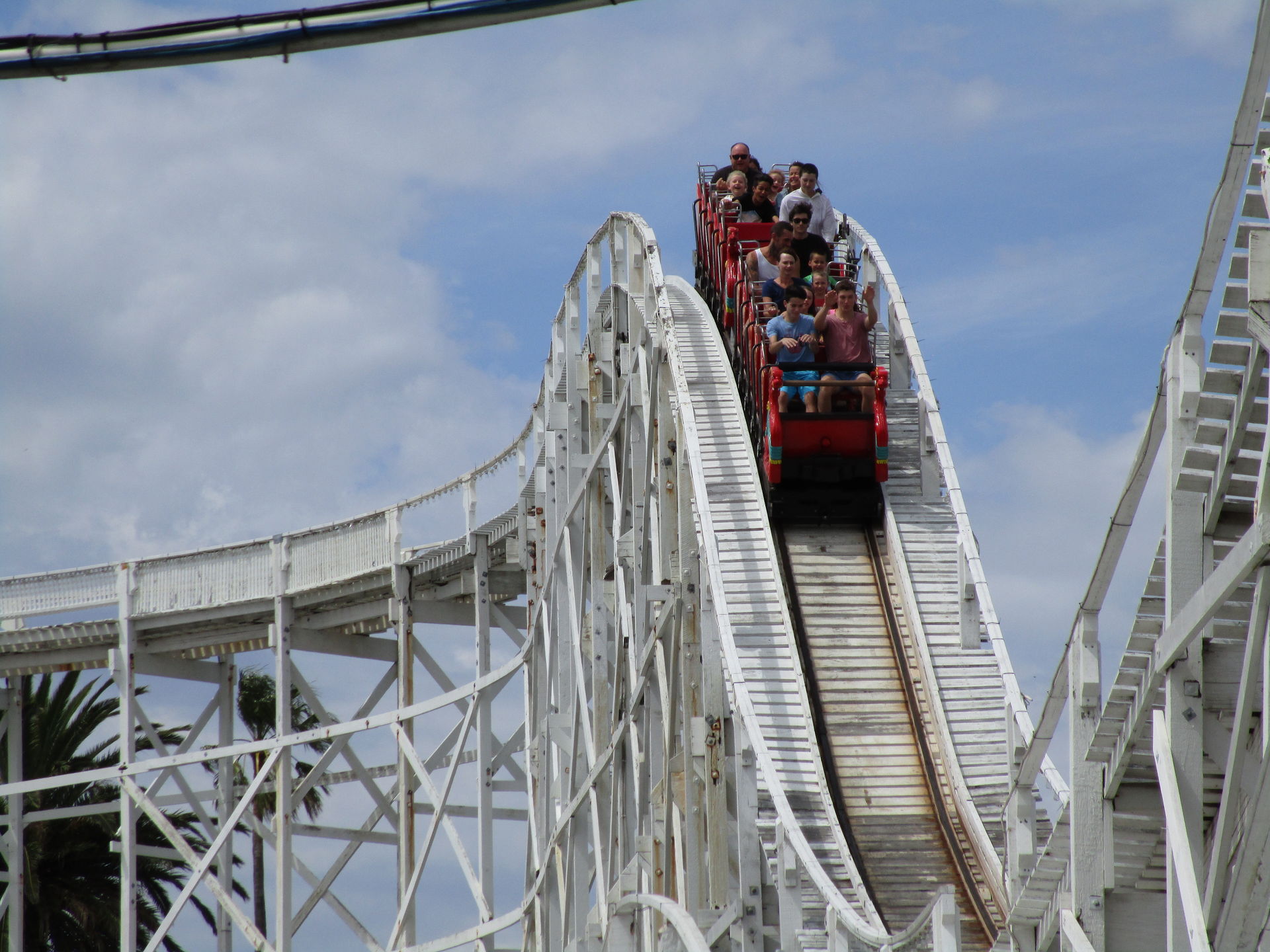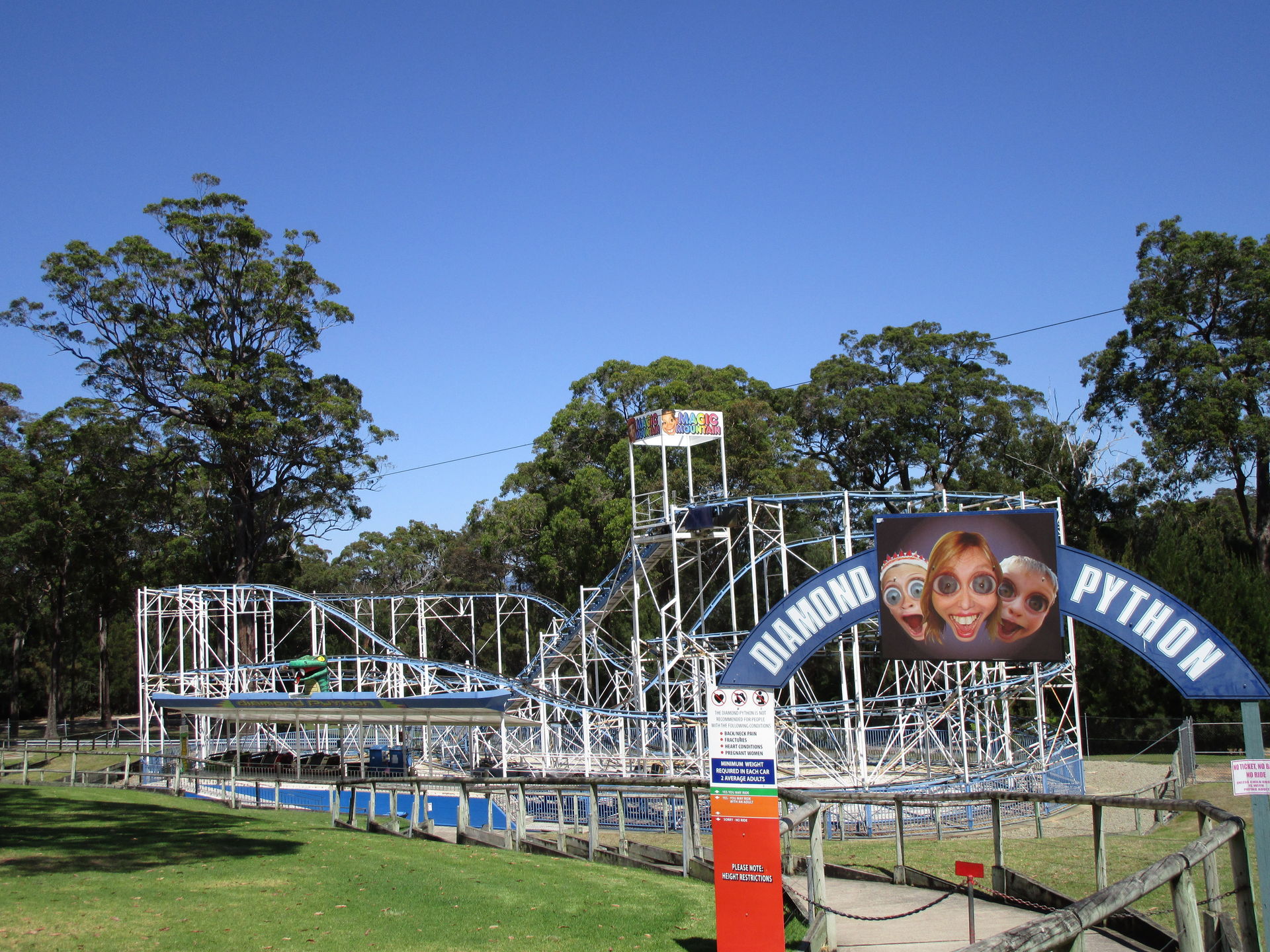Nach diesem achterbahntechnischen Amuse-Gueule kommen wir im Luna Park jetzt direkt zum ersten Hauptgang der Tour. Die zweitälteste Achterbahn und man könnte auch sagen, der Grund, warum wir die Tour nicht in Sydney beginnen, steht auf dem Plan. Seine alten, wunderschön gepflegten Wagen sehen dem spanischen Verwandten Montana Suiza zum Verwechseln ähnlich. Wie auch bei den meisten anderen Aussichtsschienenbahnen befördert uns hier ein Seil zum erhabensten Punkt hinauf, um von dort in scheinbar harmonischen Wellenformen und vermutlich zart gebremst zwei Mal die äußere Parkbegrenzung entlang zurück zur Station zu rollen. So denken wir jedenfalls.