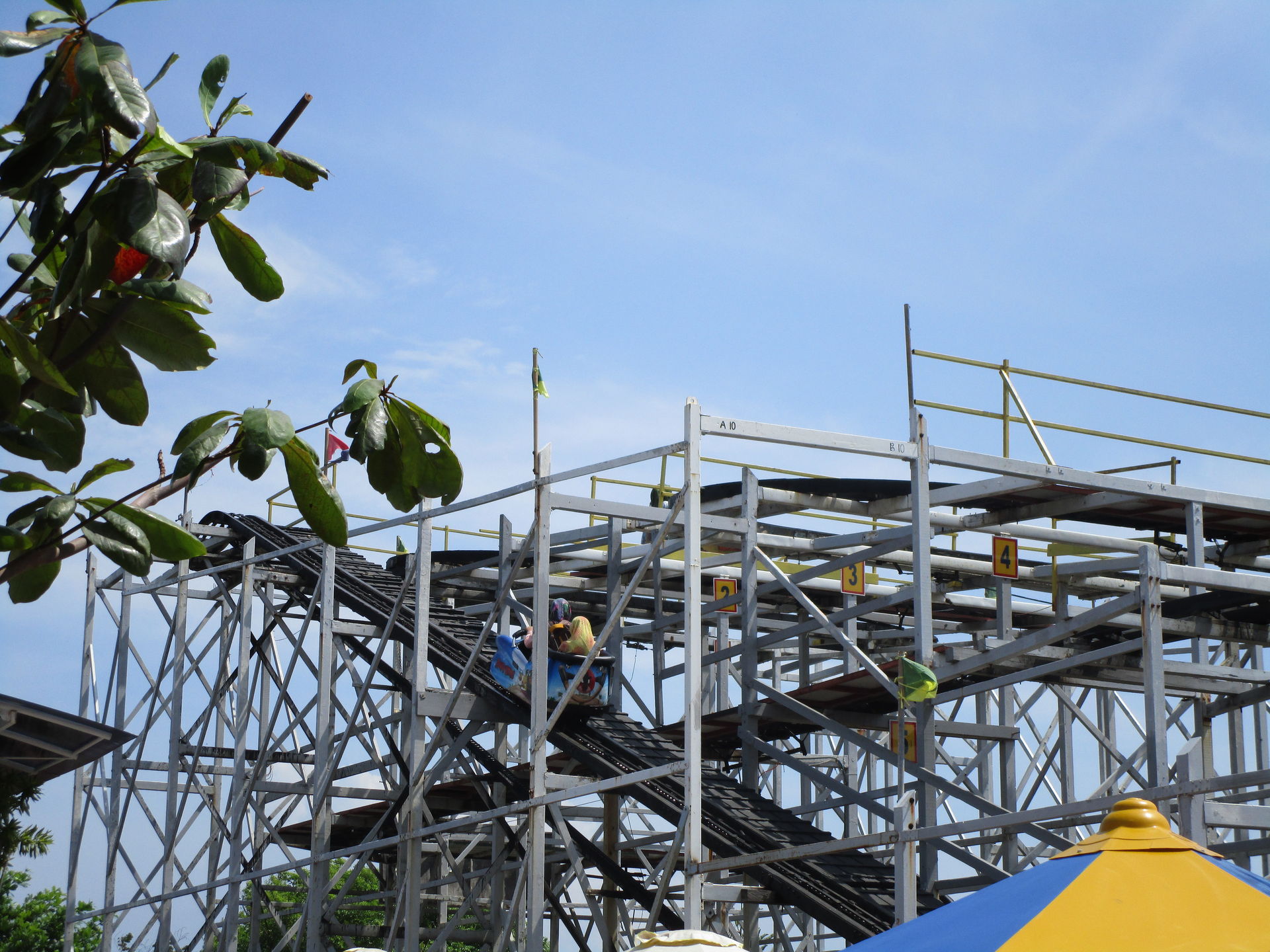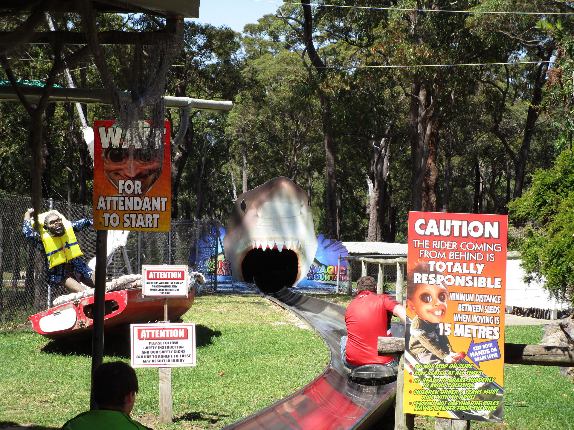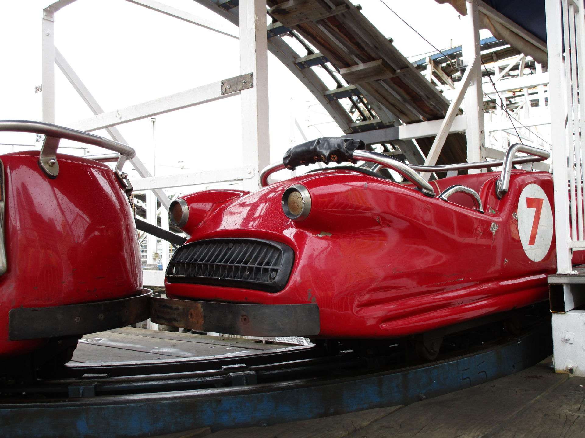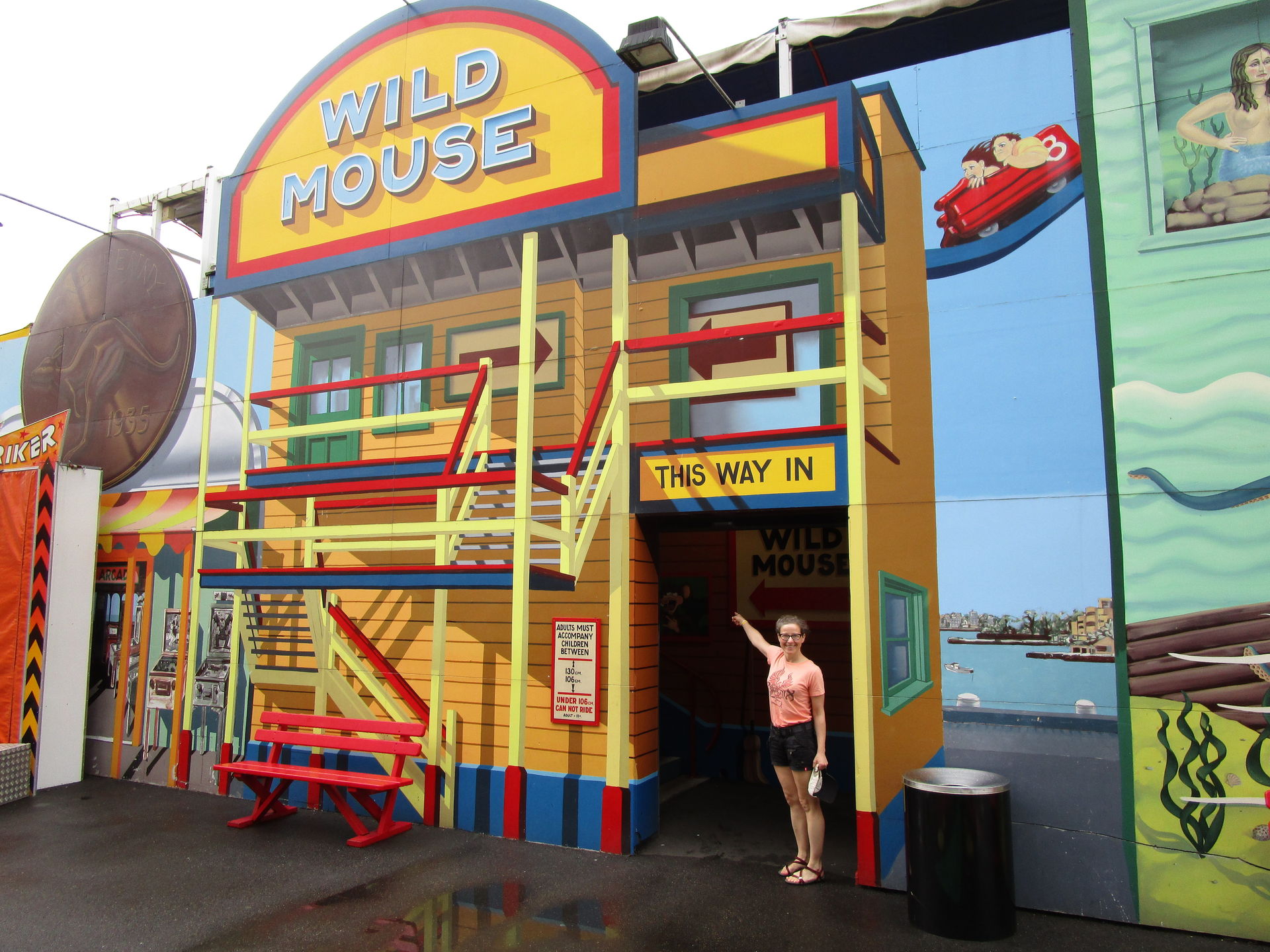Nach diesem achterbahntechnischen Amuse-Gueule kommen wir im Luna Park jetzt direkt zum ersten Hauptgang der Tour. Die zweitälteste Achterbahn und man könnte auch sagen, der Grund, warum wir die Tour nicht in Sydney beginnen, steht auf dem Plan. Seine alten, wunderschön gepflegten Wagen sehen dem spanischen Verwandten Montana Suiza zum Verwechseln ähnlich. Wie auch bei den meisten anderen Aussichtsschienenbahnen befördert uns hier ein Seil zum erhabensten Punkt hinauf, um von dort in scheinbar harmonischen Wellenformen und vermutlich zart gebremst zwei Mal die äußere Parkbegrenzung entlang zurück zur Station zu rollen. So denken wir jedenfalls.