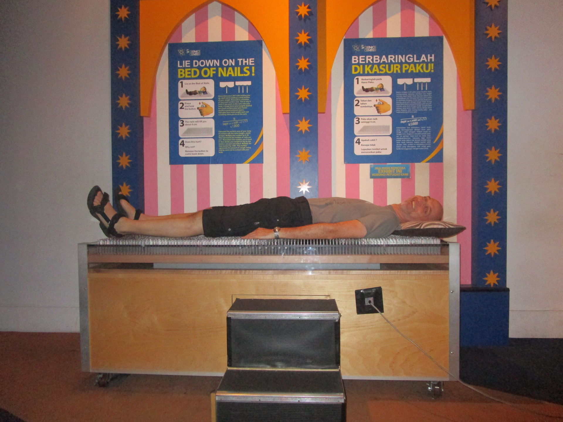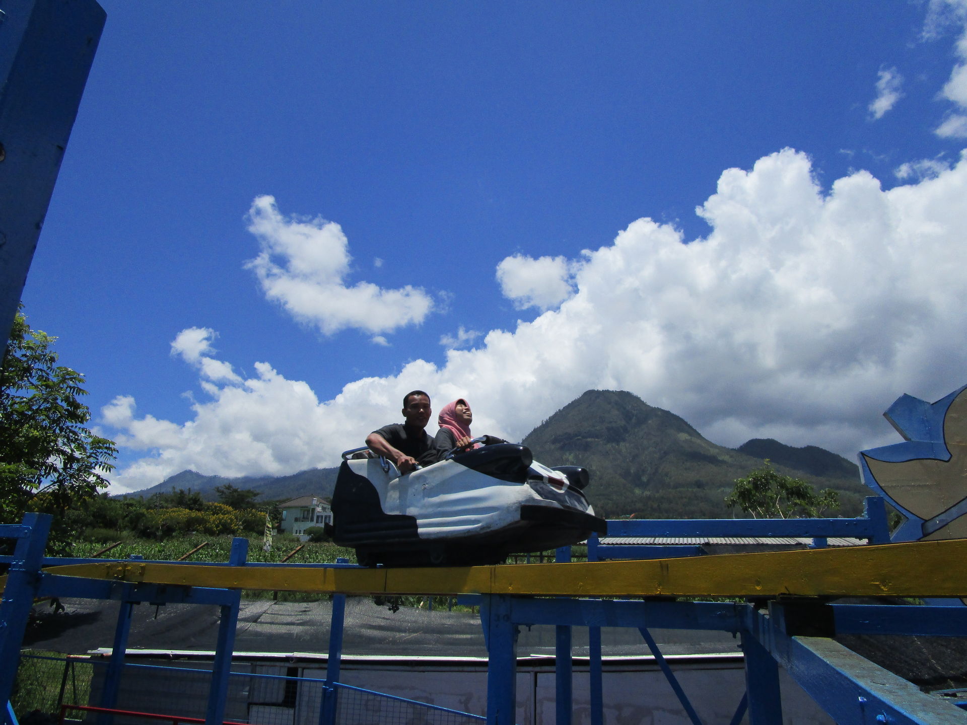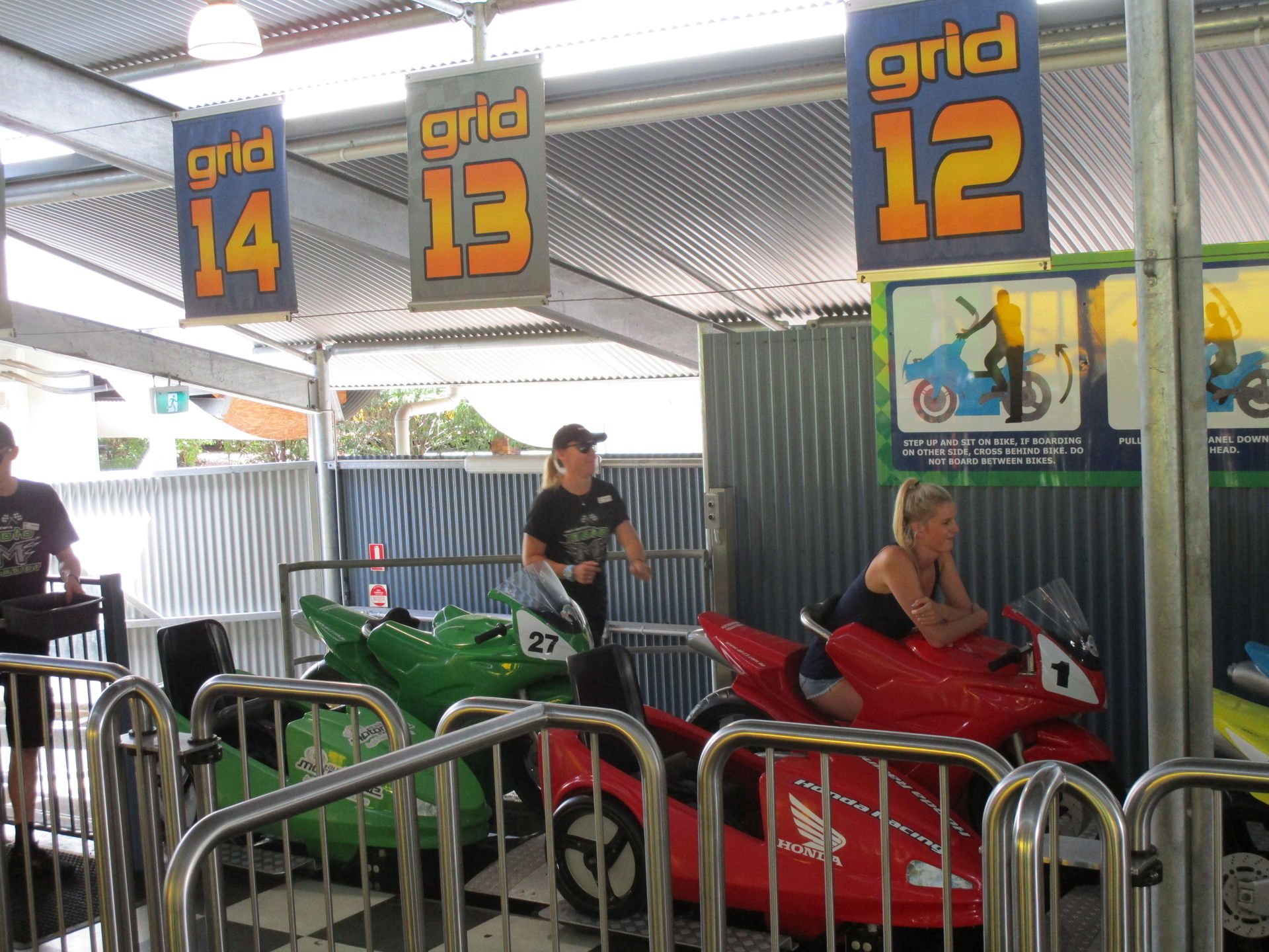 Während wir mit traumwandlerischer Sicherheit unseren Nissan Sunny strategisch optimal auf dem Parkdeck platzieren, haben wir innerhalb dieses gigantischen Einkaufstempels mit sich ständig wiederholenden identischen Gängen und Balustraden deutlich weniger Erfolg beim Auffinden der für uns interessanten Belustigungsabteilung. Aber wer dreimal nachfragt, dem kann geholfen werden und ehe wir es uns versehen, sind wir mit Schulterbügeln in diesem Kinderböhnchen mit Griffonspurweite fixiert.