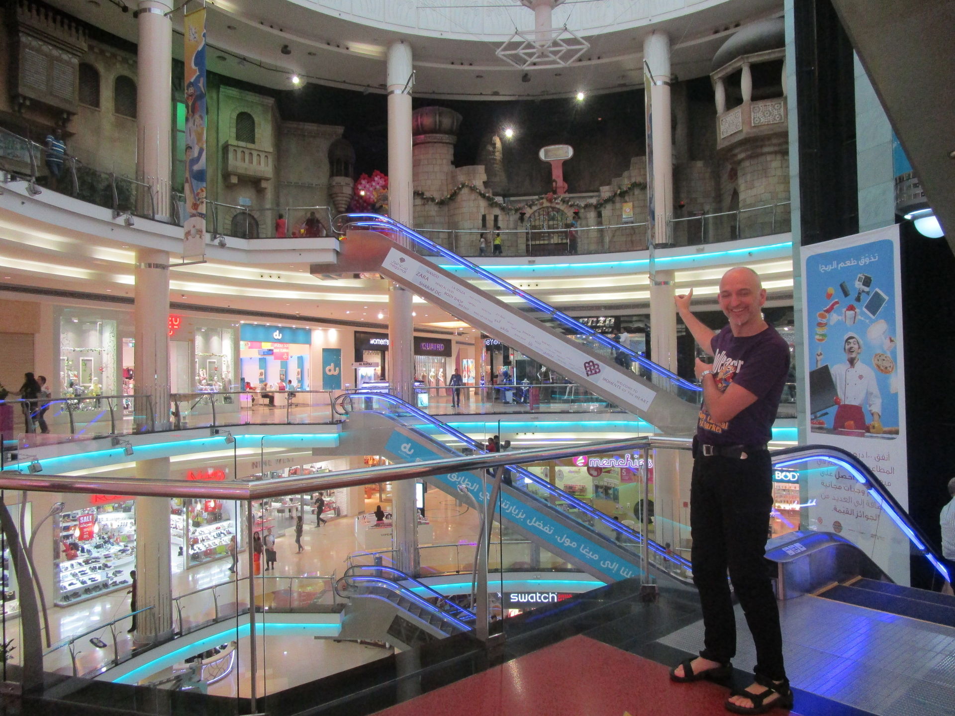 Ursprünglich waren wir der Meinung, jede Menge Zeit zwischen der Landung in Dubai (sechs Uhr morgens) und der Öffnung der ersten geplanten Mall totschlagen zu müssen, doch das bei der Autovermietung ausgeliehene Navigationssystem der Marke "ganz große Grütze" nimmt uns die Entscheidung kurzerhand durch verwirrende Menüführung, kryptische Icons, anfänglicher Satellitenfindungsschwäche und Sprachlosigkeit ab, sodass wir nicht zu früh, sondern genau pünktlich zur Öffnung in der Yas Mall in Abu Dhabi ankommen.