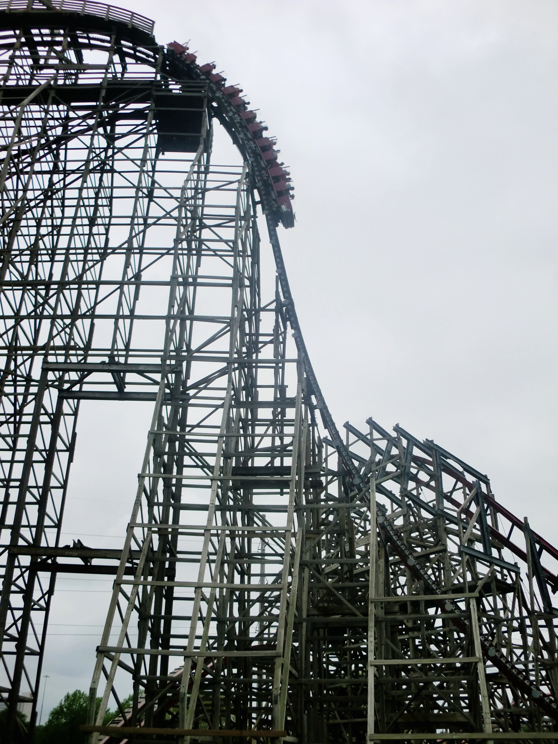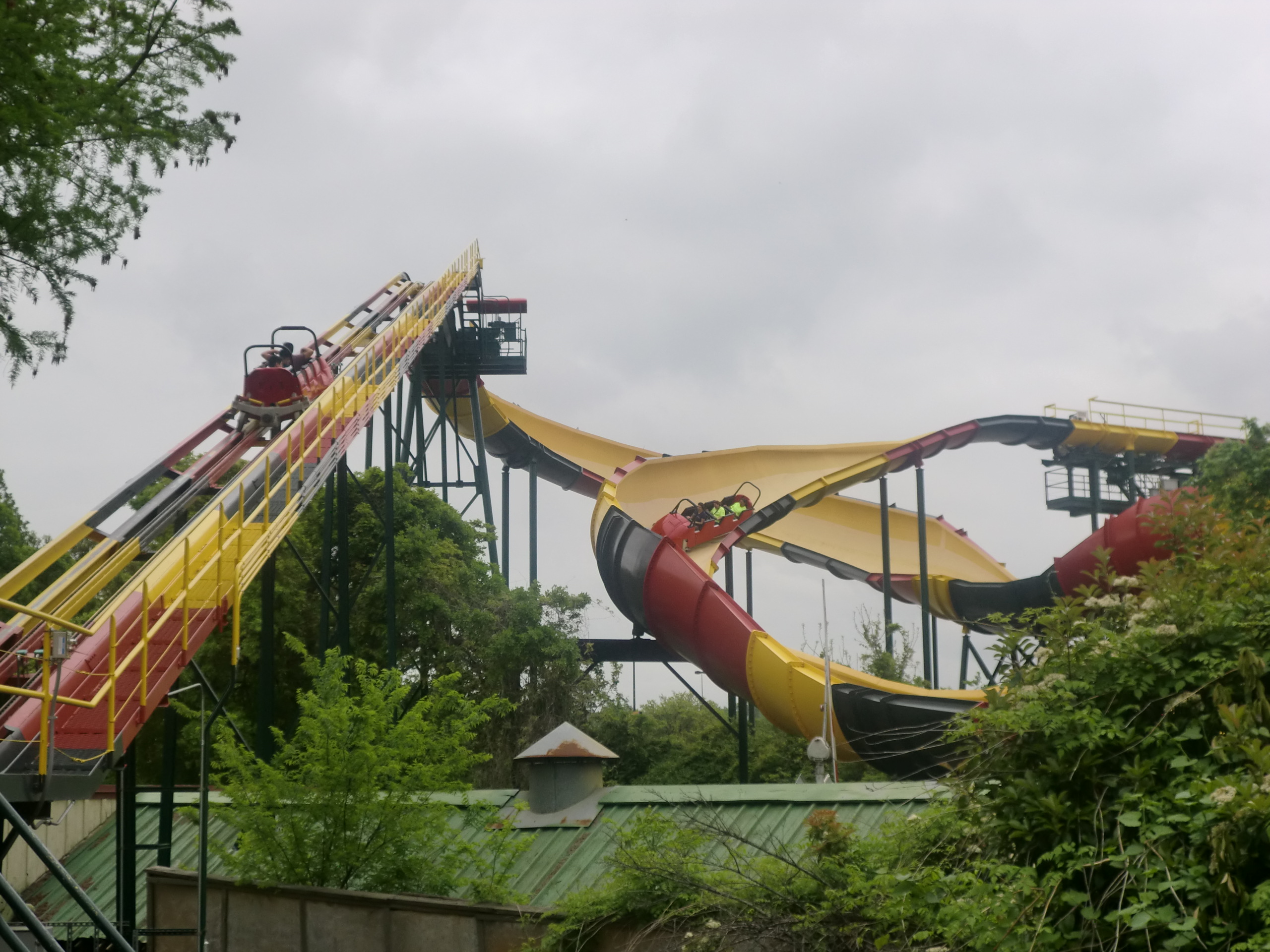 Etwas versteckt liegt der Zugang in einer hinteren Ecke des Parks. In einem kleinen Tunnel unterquert man die mehrspurige Zufahrtsstraße. Die Bahn verläuft abseits des eigentlichen Parks und ist neben dem See wirklich schön plaziert. Auch hier hatte ich schon einige Stimmen gelesen, dass die Bahn mittlerweile etwas unangenehm wäre. Der Firstdrop wurde zur diesjährigen Saison retrackt. Keine Ahnung ob das noch weiter ging. Die Bahn fährt sich wunderbar. Schönes, aber nie unangenehmes, Woody Feeling. Dank der warmen Temperaturen und des vollbeladenen Zuges gab es auch etwas, wenn auch eher sanfte