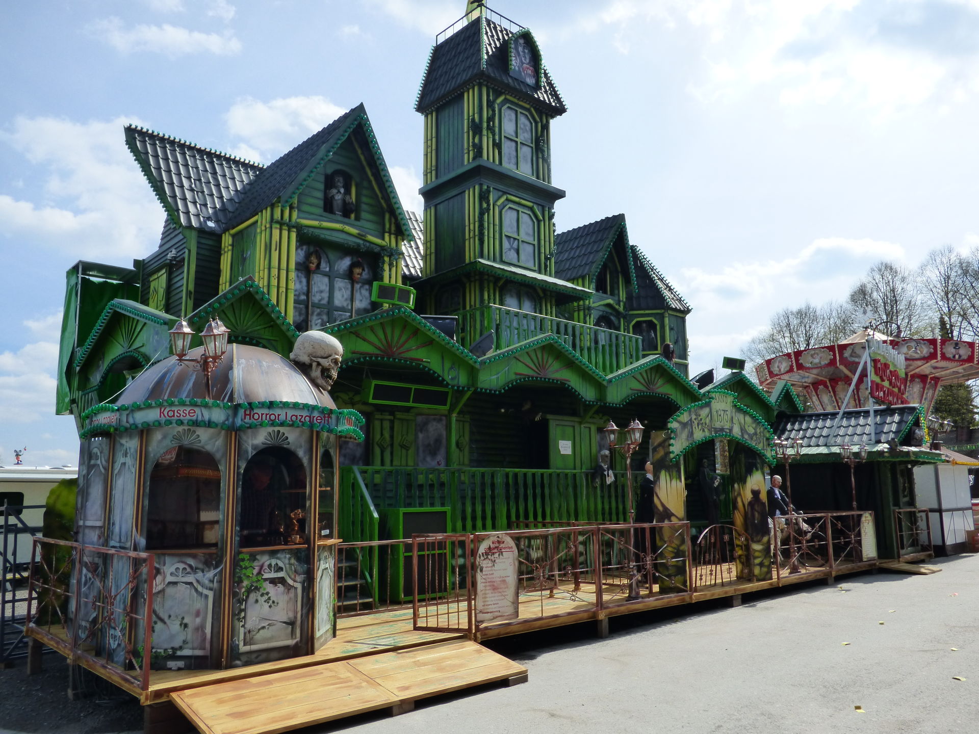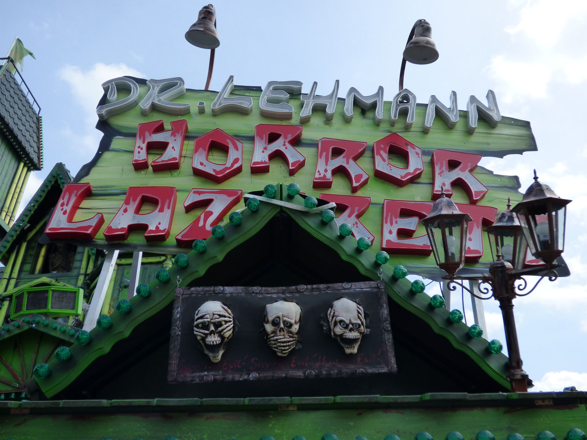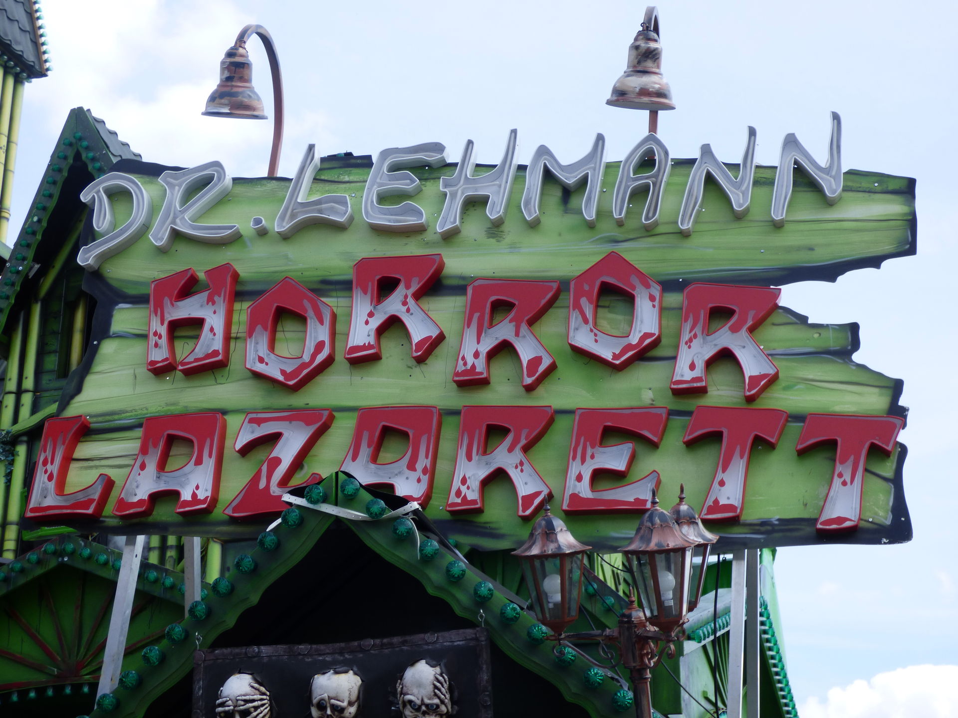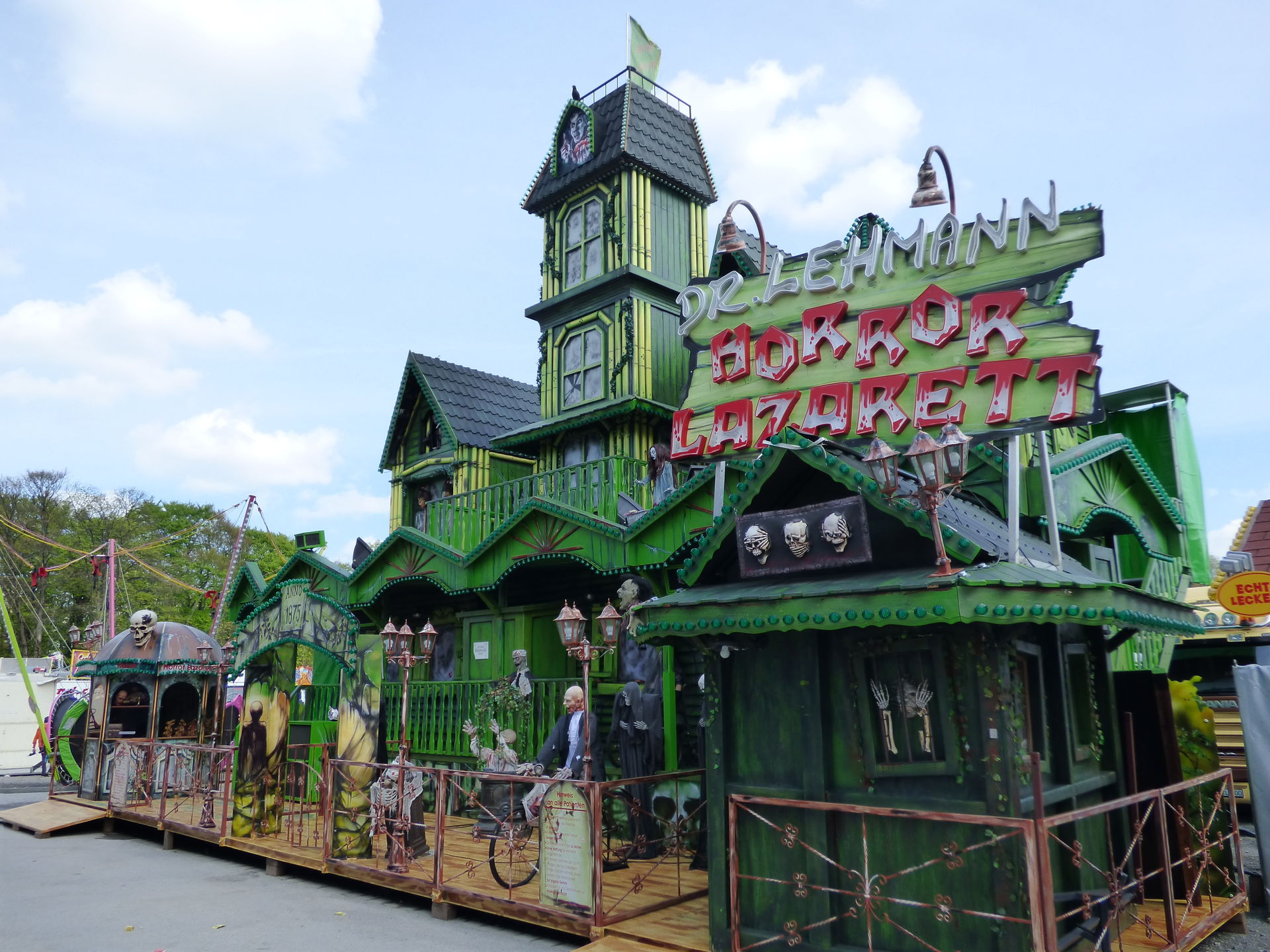 Das Horror Laufgeschäft sieht von außen wirklich klasse aus mit vielen Details und schön schaurig. Ich bin jetzt schon gespannt auf einen Besuch, Himmelfahrt soll das Lazarett laut Homepage in Witten auf der Kirmes stehen. Dann werde ich es dort mal testen.