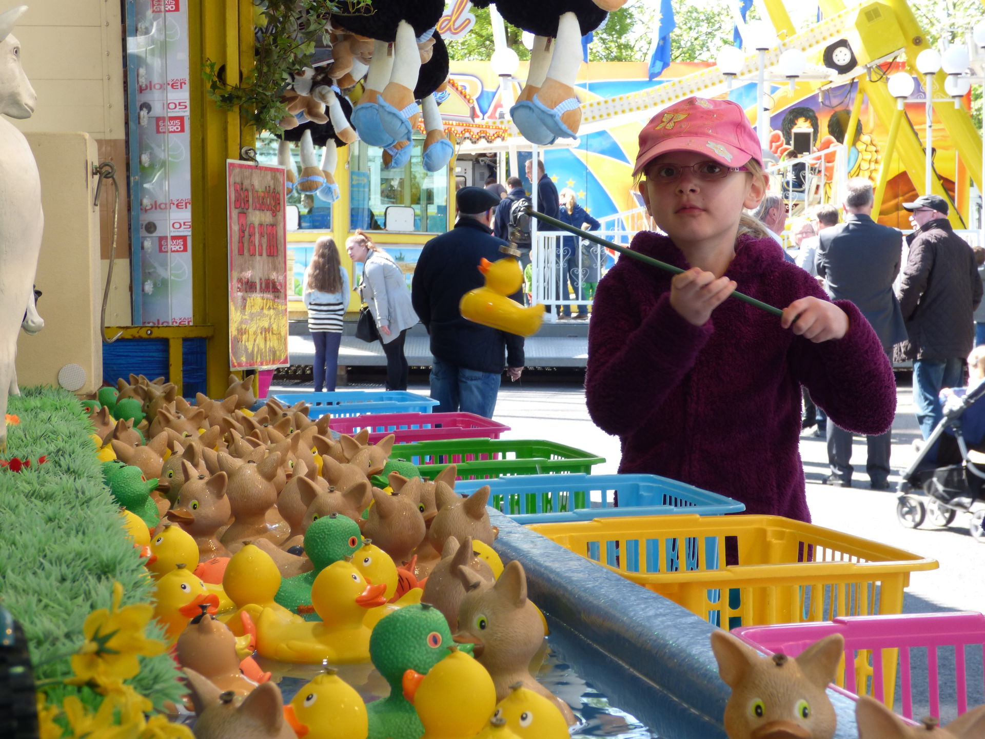 Nach der Fahrt mit dem Riesenrad ging es dann erstmal an einem Weg mit Reihengeschäften vorbei. Mia hatte mal wieder Lust, auf Enten angeln, außerdem gab es ein nettes Pläuschchen mit einem Schießbudenschausteller über onride und Youtube bevor es am