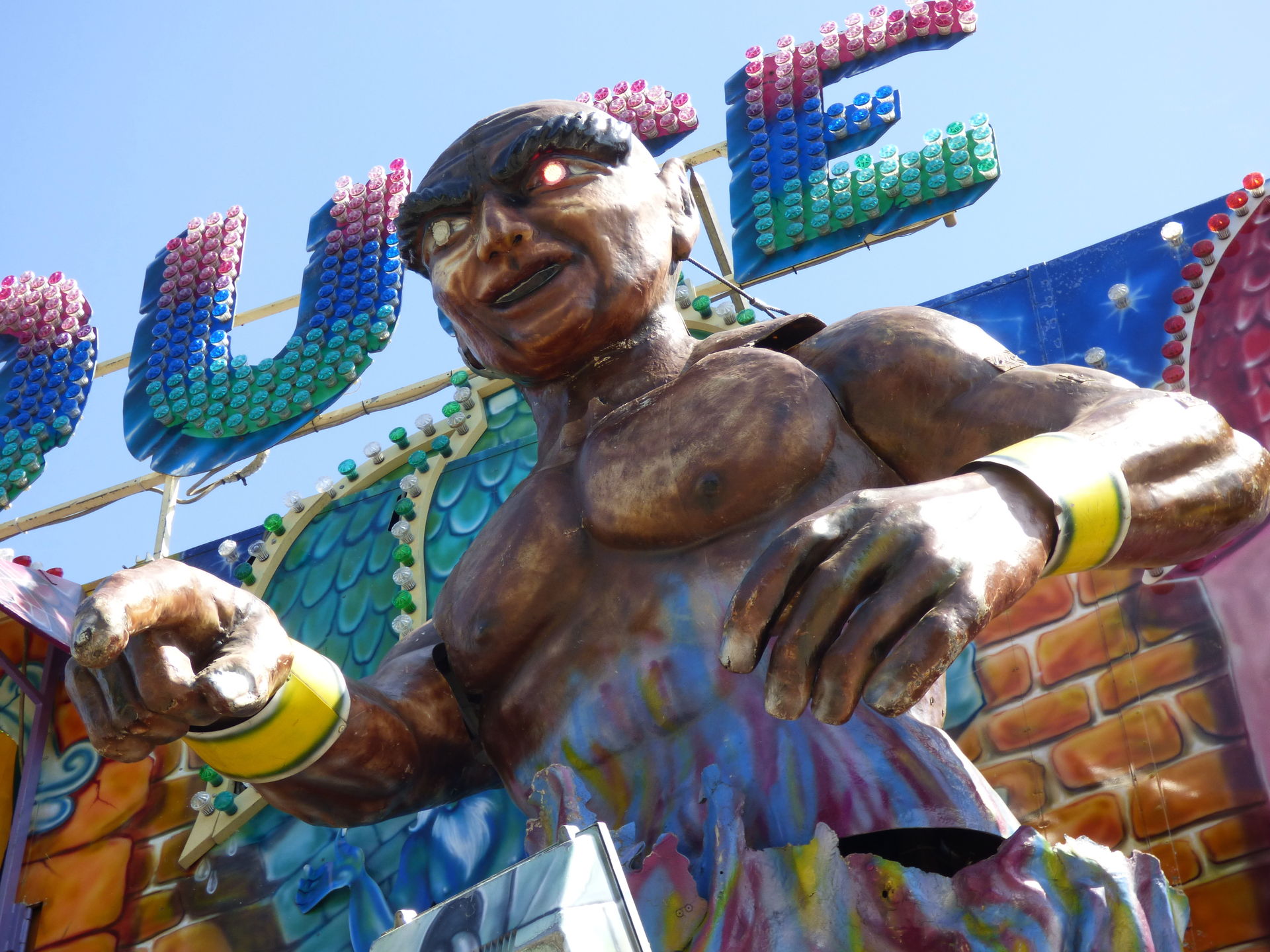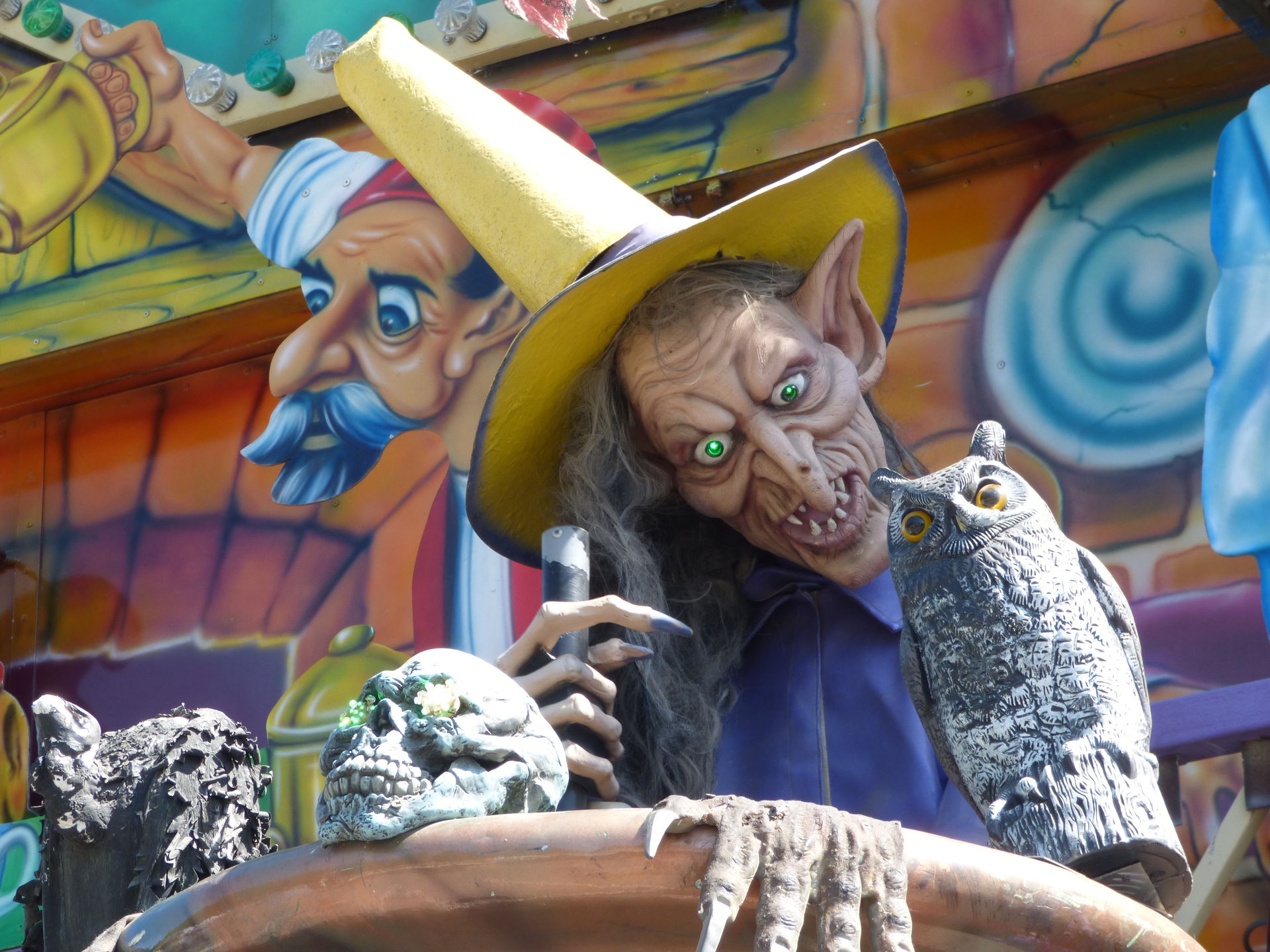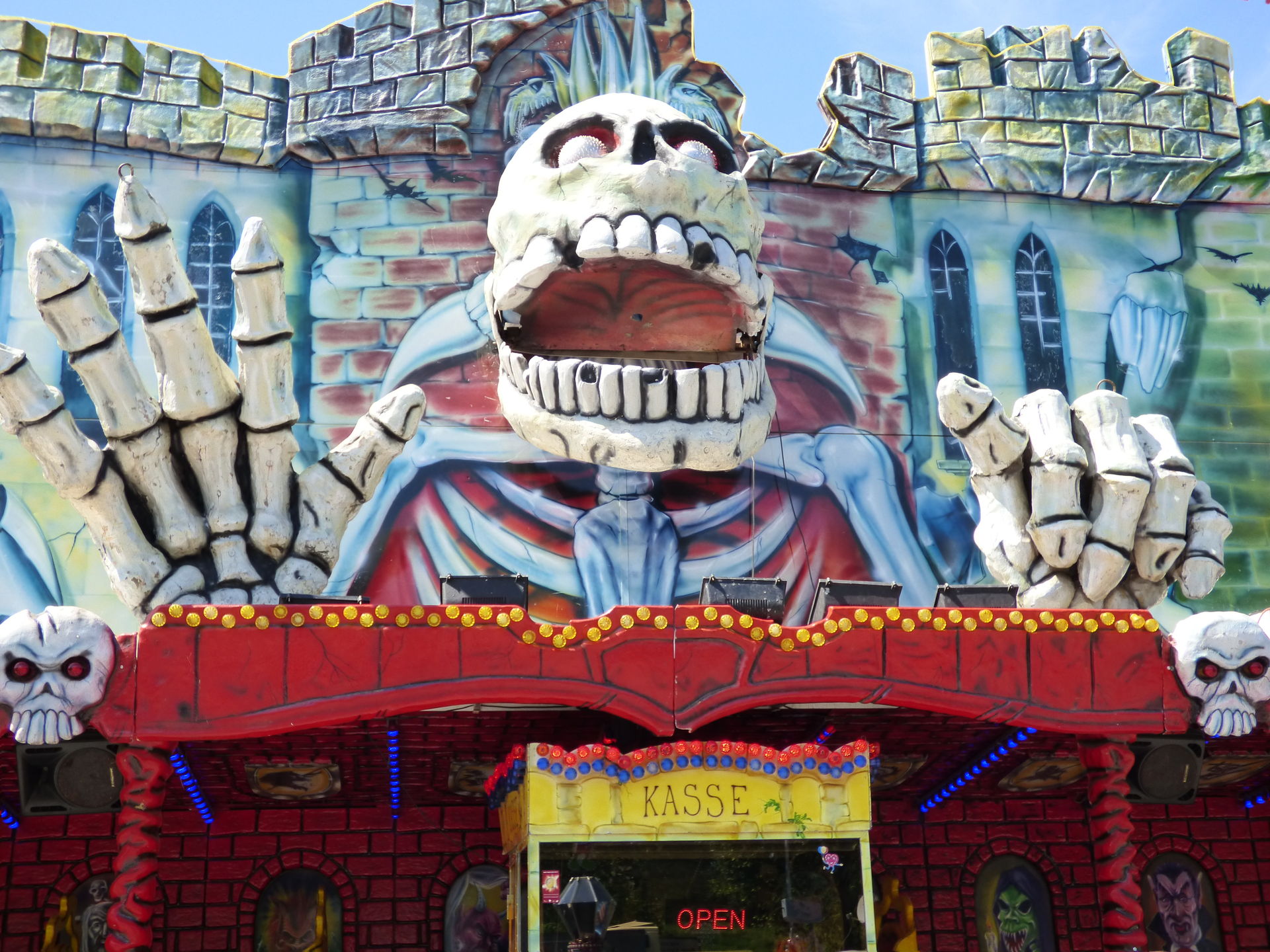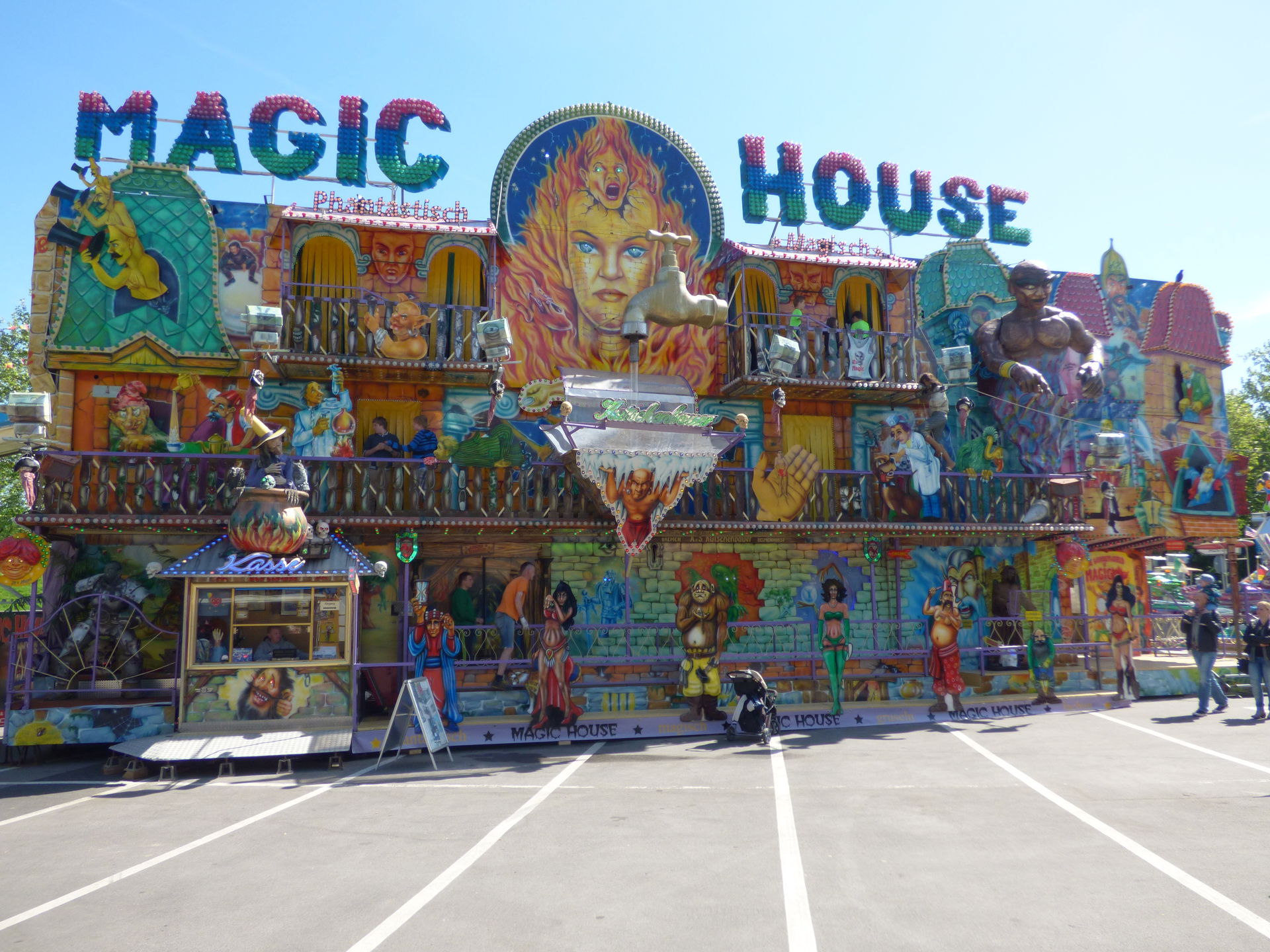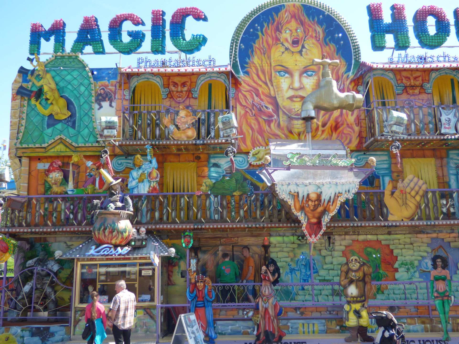 Magic House, das wir nun in diesem Jahr nach der Palmkirmes in Recklinghausen zum zweiten Mal antrafen. Hier in Lünen wurde es aus Platzgründen in einer etwas schmaleren Version aufgebaut, es fehlte der komplette linke Teil mit der Schlangenbeschwörer Szenerie am Außenaufbau.