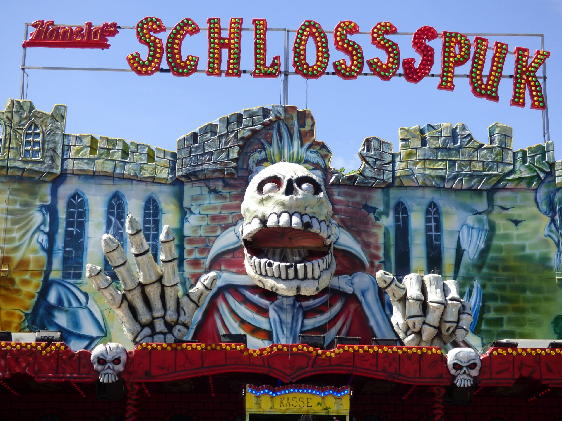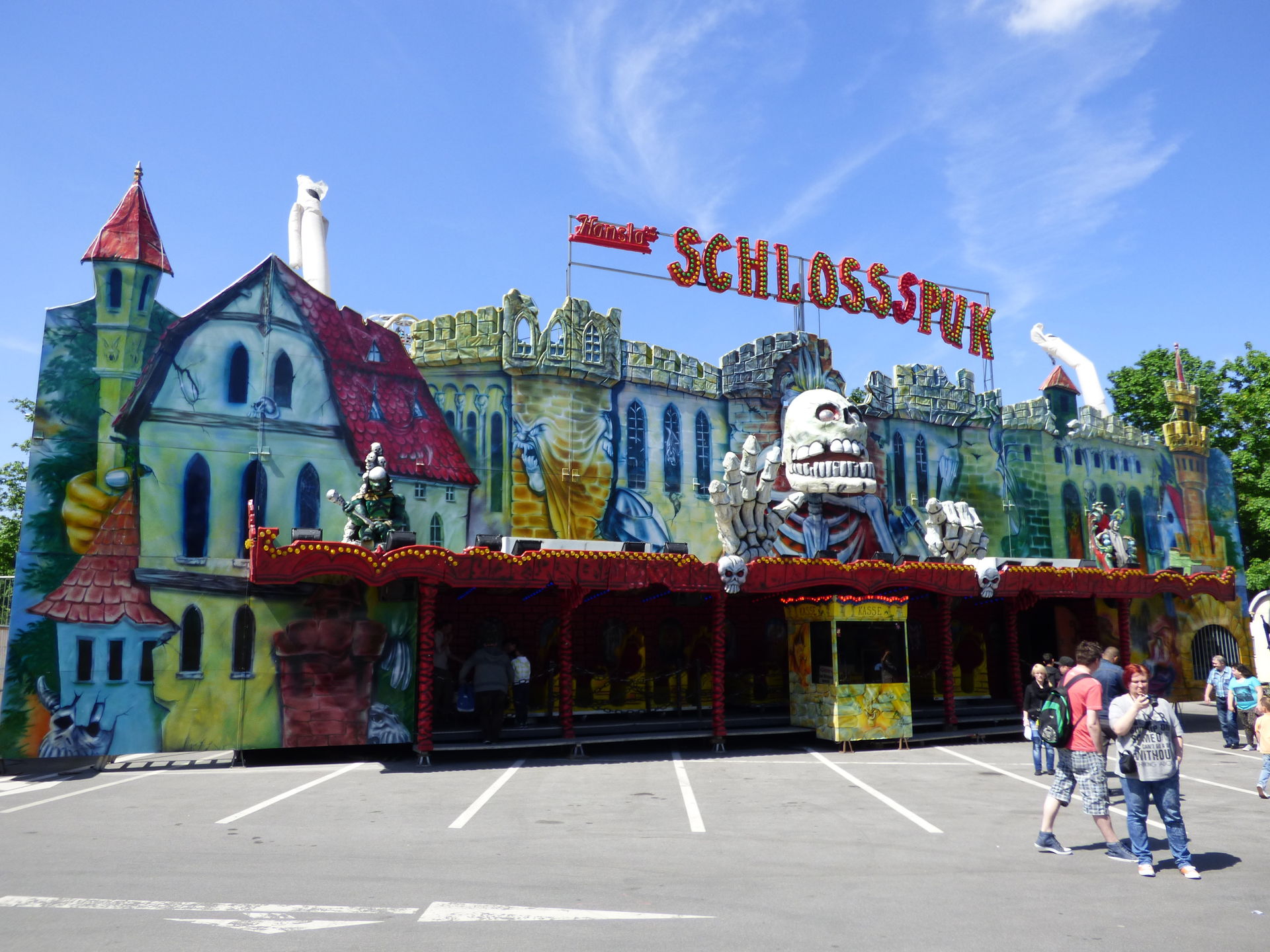 Schlossspuk. Mal wieder einen Haken an eine Geisterbahn machen, die ich noch nicht kannte. Also schnell den Tobi geschnappt und rein in die Bahn, alleine fahre ich solche gruseligen Sachen nicht, das wird auf einen späteren Platz an diesem Tag noch einmal ein ganz entscheidener Faktor.