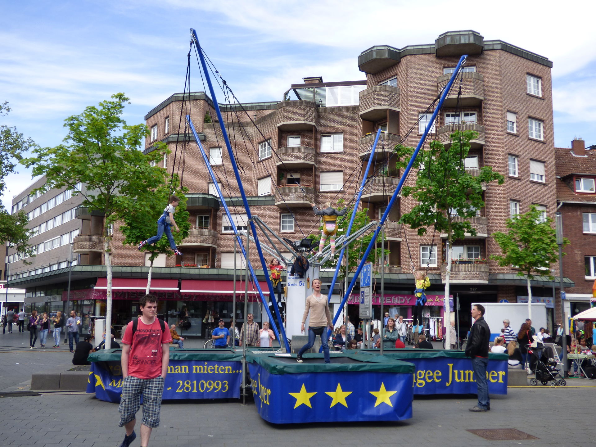 Nach Betreten der Kirmes war schnell klar: Das wird wieder eine reine Innenstadtkirmes. Wirklich große Plätze gab es hier auch nicht so dass die Kirmes aus einem langen Schlauch quer durch die City bestand. Zentral vor uns stand eine Bungee-Anlage für die Kleinen, wir orientierten uns dort erst einmal nach rechts.