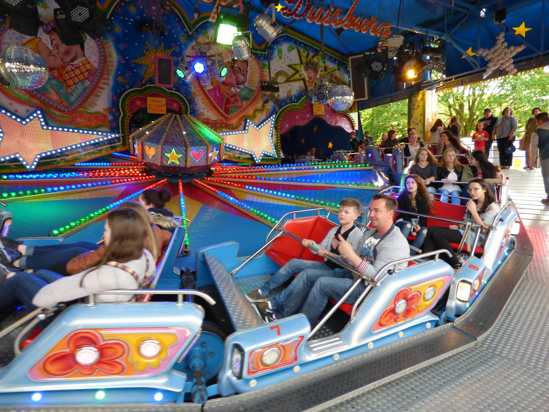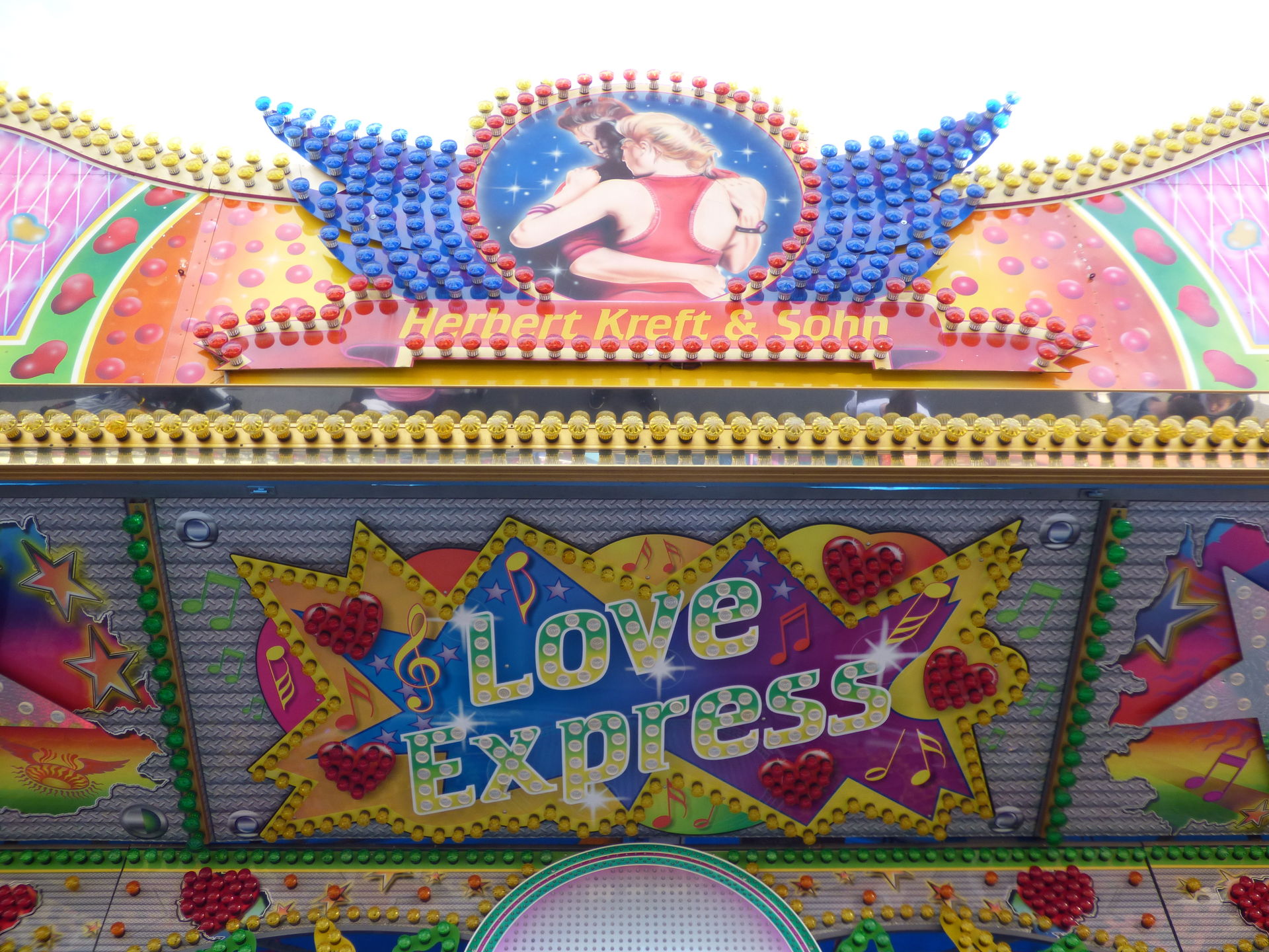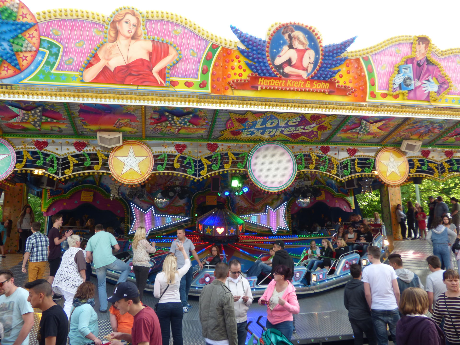 Love Express. Baut der seinen Schriftzug oben drüber eigentlich überhaupt nicht mehr auf? Oder hat der das Ding geschrottet? Fällt halt auf, dass auf den gesamten letzten Plätzen wo ich das Ding gesehen habe, der Schriftzug oben nicht montiert wurde. Oder wird der gerade LED-technisch überarbeitet? Eine Frage für unsere Kirmesexperten.
