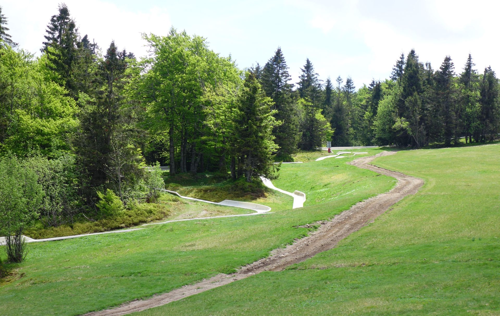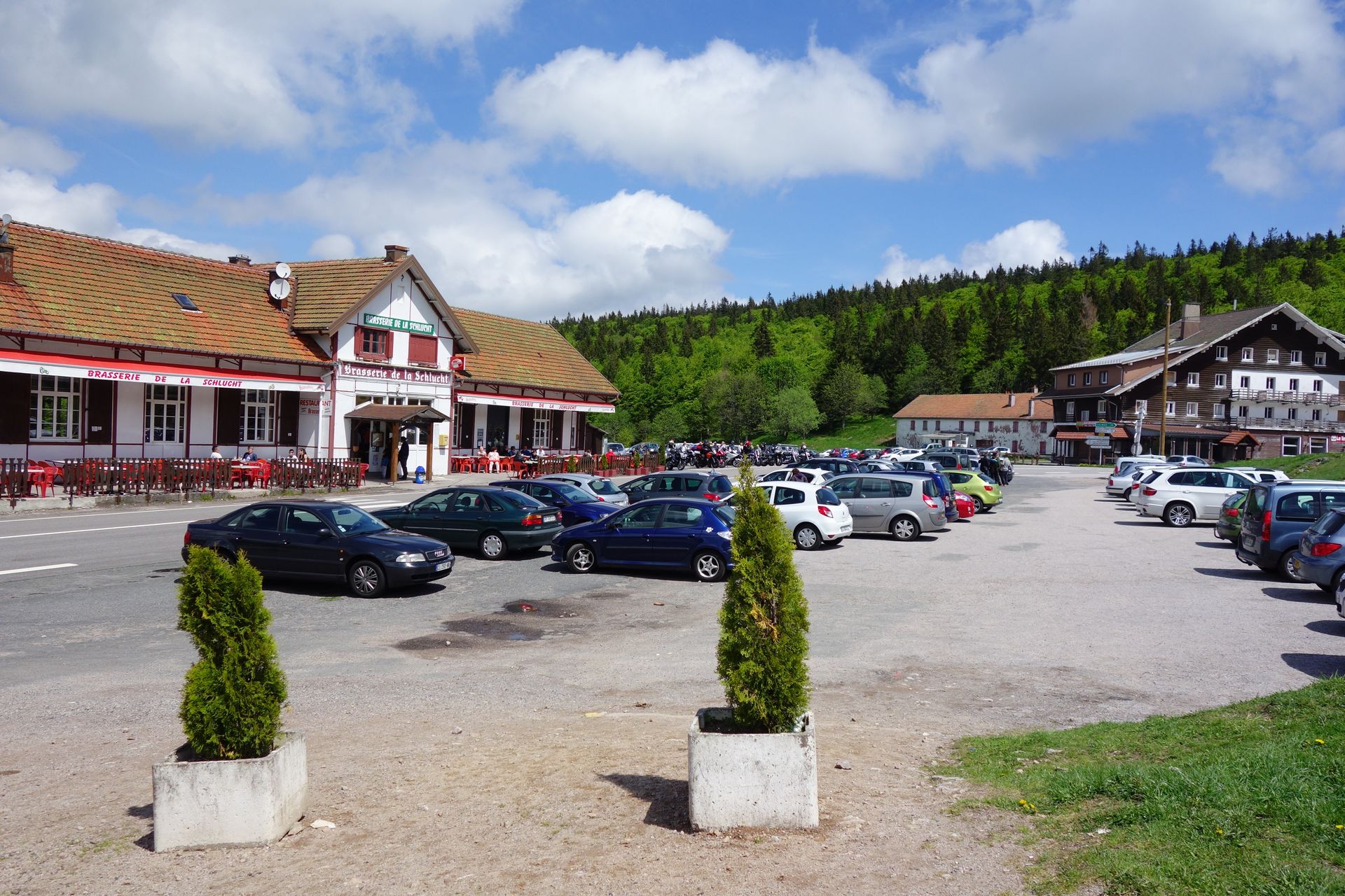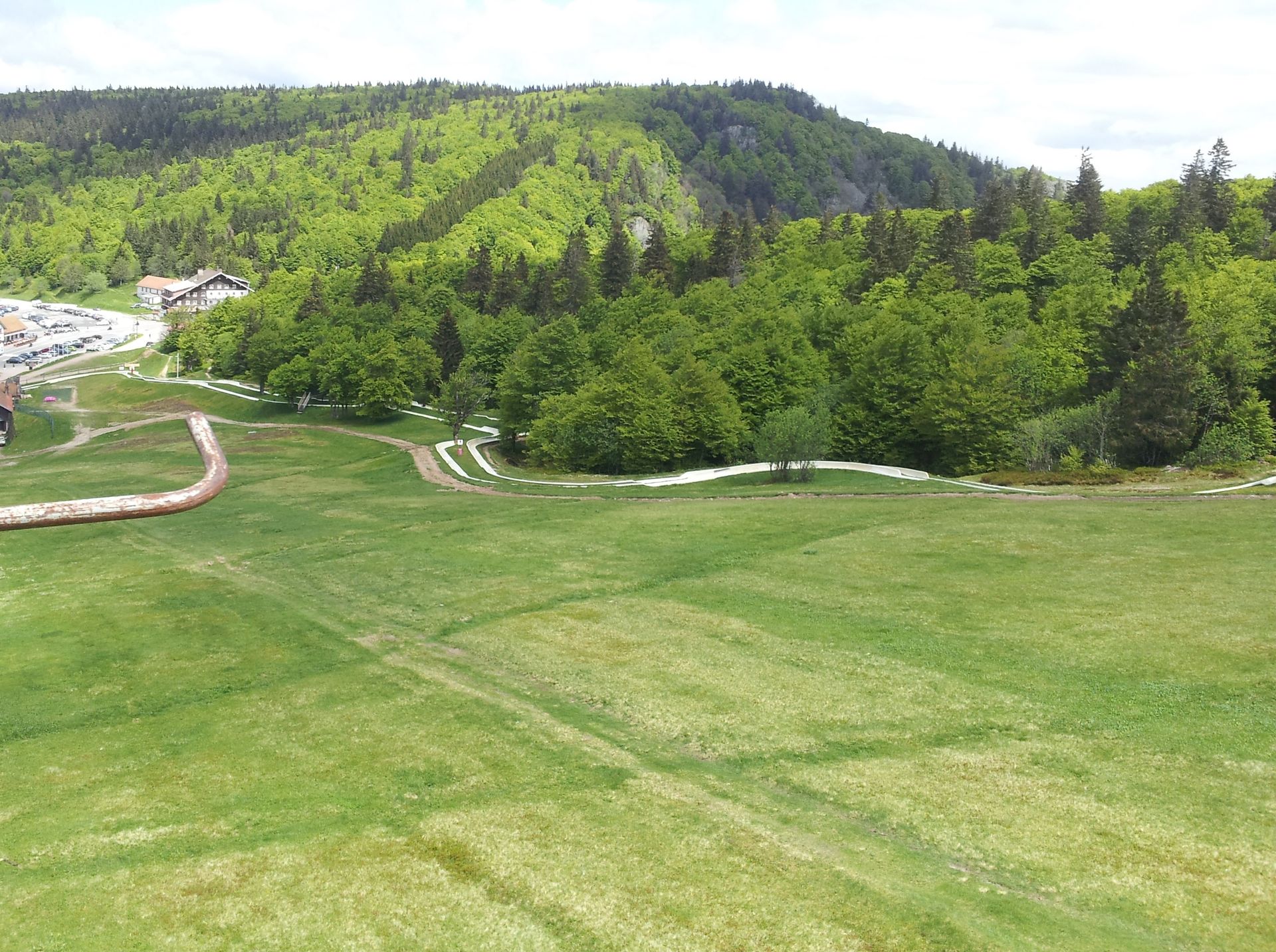 Nur etwa 10 Minuten nach unserem Auftakt in La Bresse erreichten wir bereits das dritte Ziel unseres Tagestrips am 17. Mai. Gemeint ist der Schluchtpass, oder im Französischen Col de la Schlucht. Doch was wollen zwei Achterbahnfans an diesem über 1100 Meter hohen Pass, wo sich weit und breit kein weiterer Count findet? Nun, glaubt man den Berichten, gibt es hier etwas viel besseres als einen lahmen Count. Stattdessen kann man hier noch eine originale, doppelspurige Sommerrodelbahn vom Typ RoblaRun erleben, die gerne mal als Mutter aller Sommerrodelbahnen oder gar als Gott bezeichnet wurde. Und da sie - im Vergleich zu den übrigen Entfernungen an diesem Tag - fast schon fußläufig gegenüber lag, wollten wir das natürlich einmal selbst erleben.