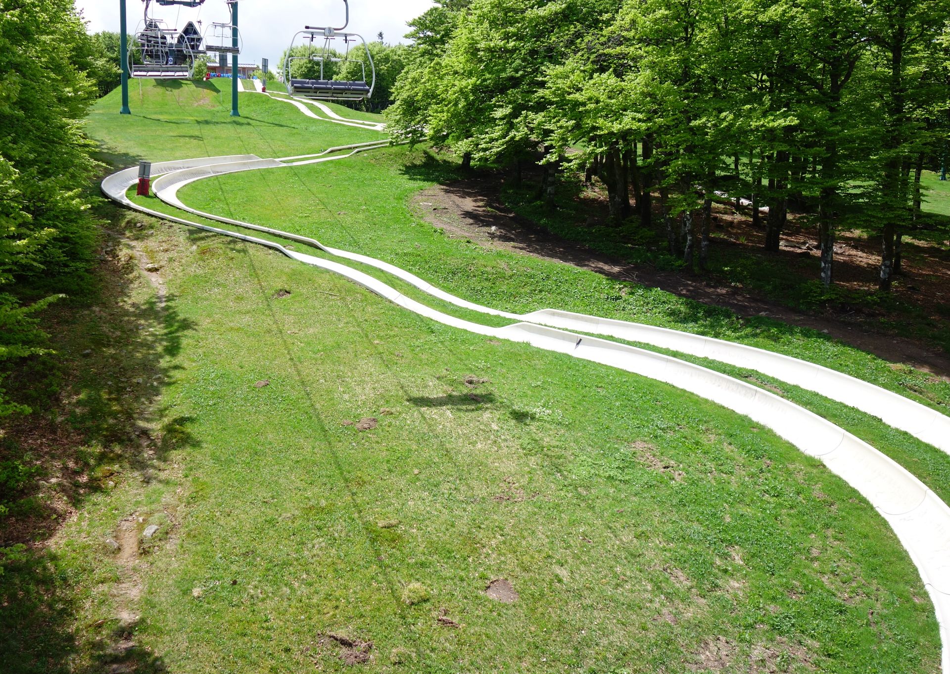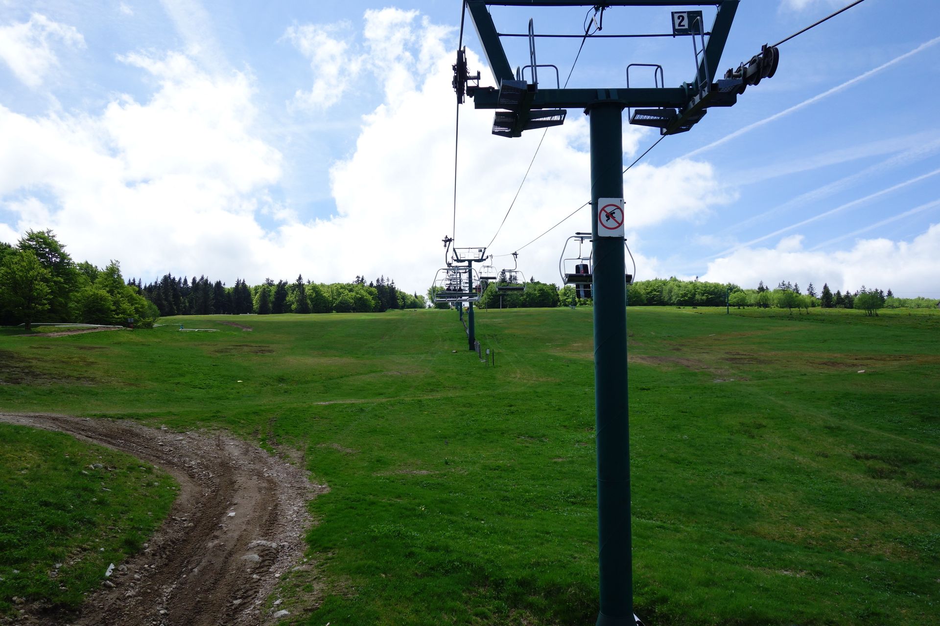 Zunächst führt der Lift über die grüne Wiese, die Rodelbahn fährt etwas abseits am Waldrand hinunter.
