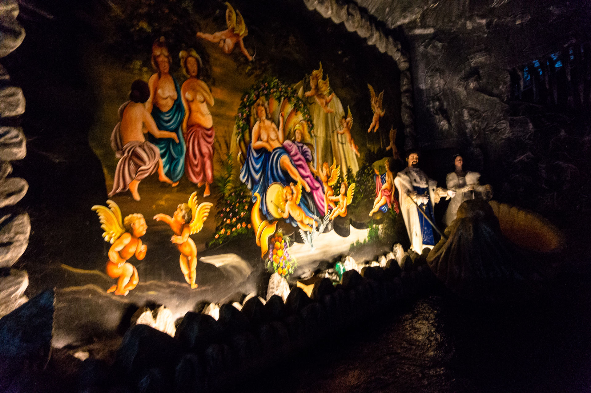 Nach einer mauen Fahrt auf dem HUSS Airboat Schmetterlingstanz ging es über eine Brücke in Richtung eines Parkteils ohne wirkliche Bedeutung. Nicht jeder Park kann sich einen total verdreckten See mit Dampferfahrt und einem künstlichen Schloss in bayerischer Optik an dessen Rand leisten. Durch dessen optisch ansprechenden Garten führt eine kleine Rundbootfahrt an dessen Ende eine Grotte mit Jungbrunnen wartet, also für Amerikaner mal wieder die heißeste Versuchung seit es Europa gibt.