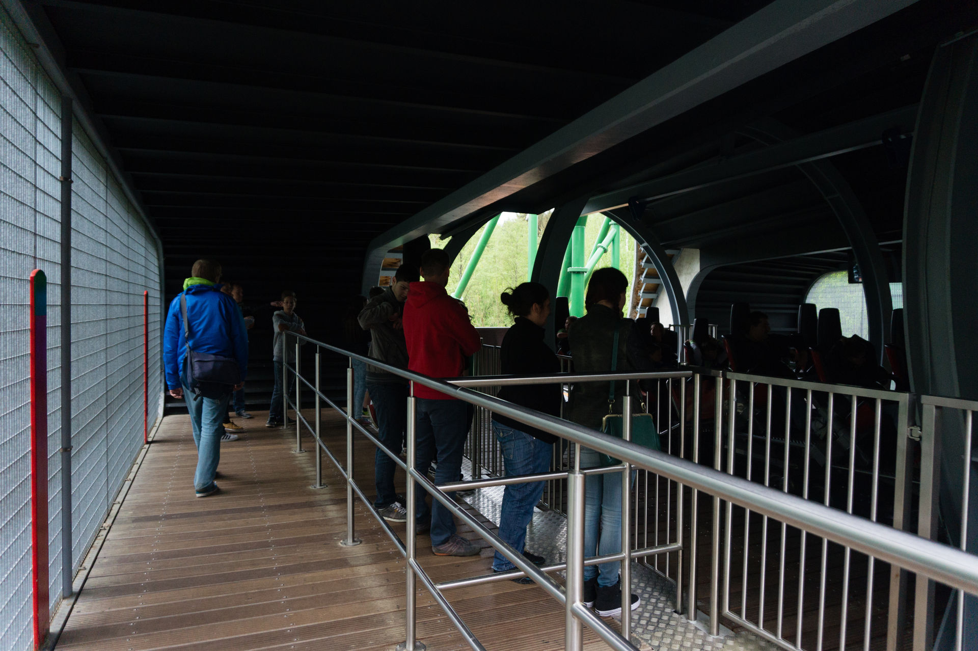 Das zweite Highlight befindet sich direkt neben der Raftinganlage, jedoch ist der Eingang leider auf der anderen Seite, so dass man von hier weite Wege hinauf und wieder hinab gehen muss, obgleich eine größere Freifläche auf dieser Seite vorhanden ist und der Wartebereich hier erst beginnen könnte. Schön gestaltete Wartebereiche haben durchaus ihren Reiz und die Operachterbahn könnte einen passenden Bereich auch durchaus verkraften, stattdessen aber führt ein Weg unterhalb des inside Tophats durch zwei Gebäude mit Zikzak-Wegeführung auf einen offenen Platz bevor es in ein Labyrinth geht. Nach diesem folgt besagter größerer Platz ehe es mehrere kleinere Wege mit unterschiedlichen Hindernissen, hier war aber nur eine Wegeführung geöffnet, in Richtung der sehr modernen Station geht.