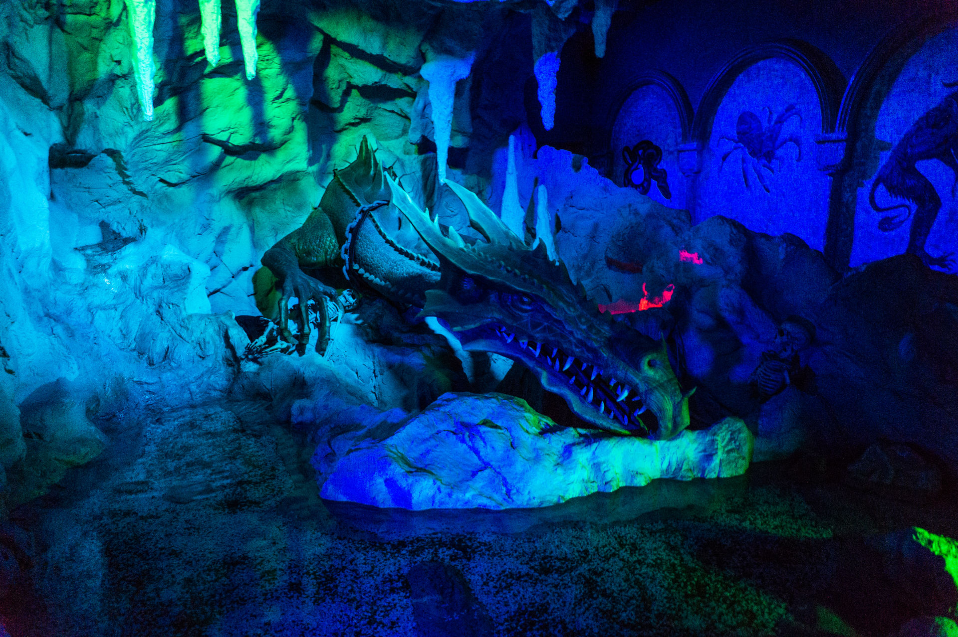 Seltsamer Weise muss man sich an dieser Anlage anschnallen, was in einem abgedunkelten Raum ohne Brille gar nicht so leicht war, ehe die Fahrt endlich beginnen kann. Nun fährt man Stück für Stück nach oben und macht jeweils an Ebenen mit unterschiedlichen Videoprojektionen und Animatroniks halt. In der ersten Etage sieht man dabei einen schlafenden Drachen sowie einen Ritter der durch die Höhle galoppiert, in der zweiten Etage ein Sagewesen vor einem Feuer ein Musikinstrument spielen, in der dritten Etage mehrere erwachte Drachen in Angriffslaune, und in der finalen Etage einen Kampf zwischen Reiter und Drache. Es folgt der freie Fall und eine im Boden eingelassene abgetrennte Hand wird beleuchtet.