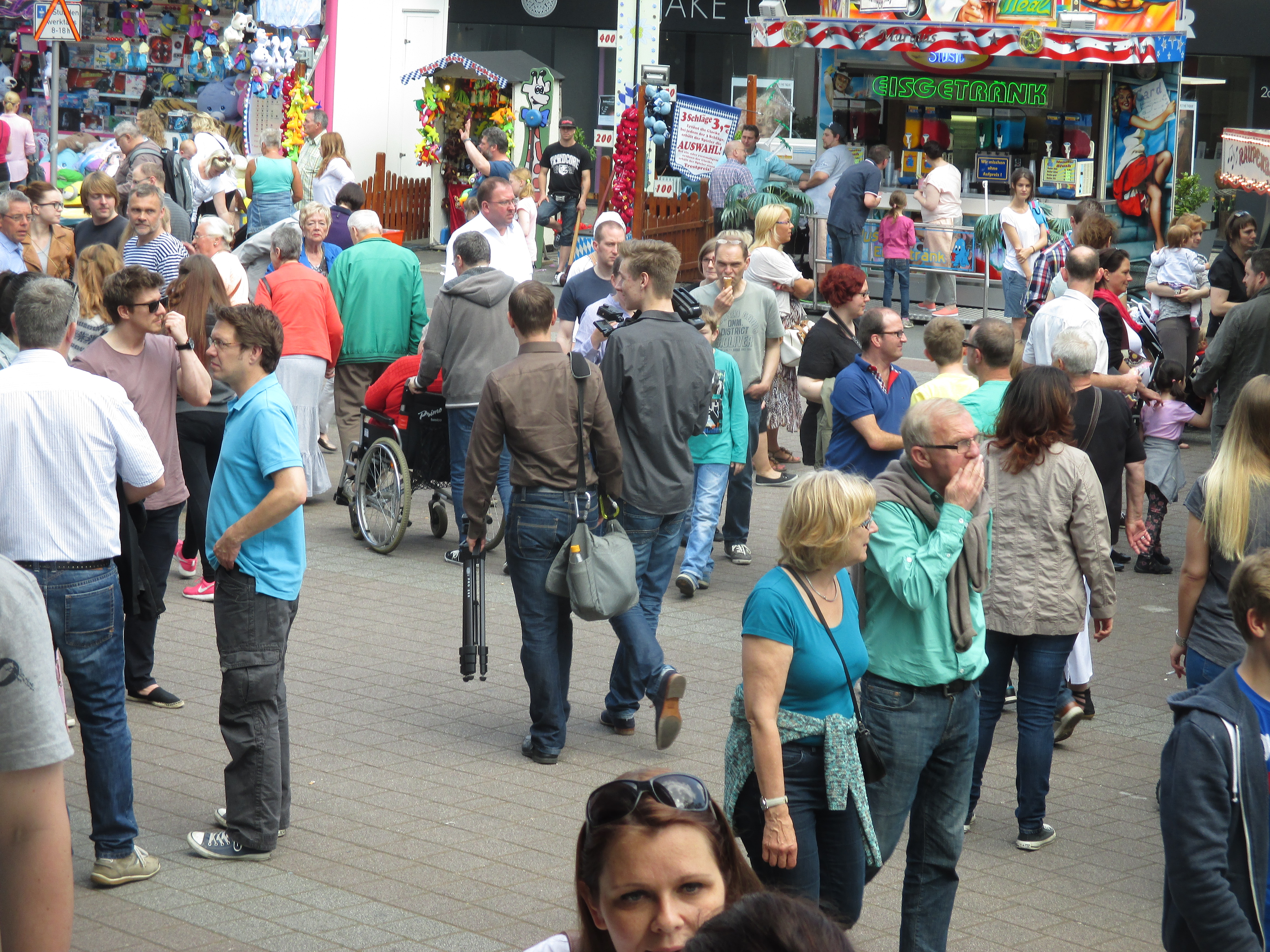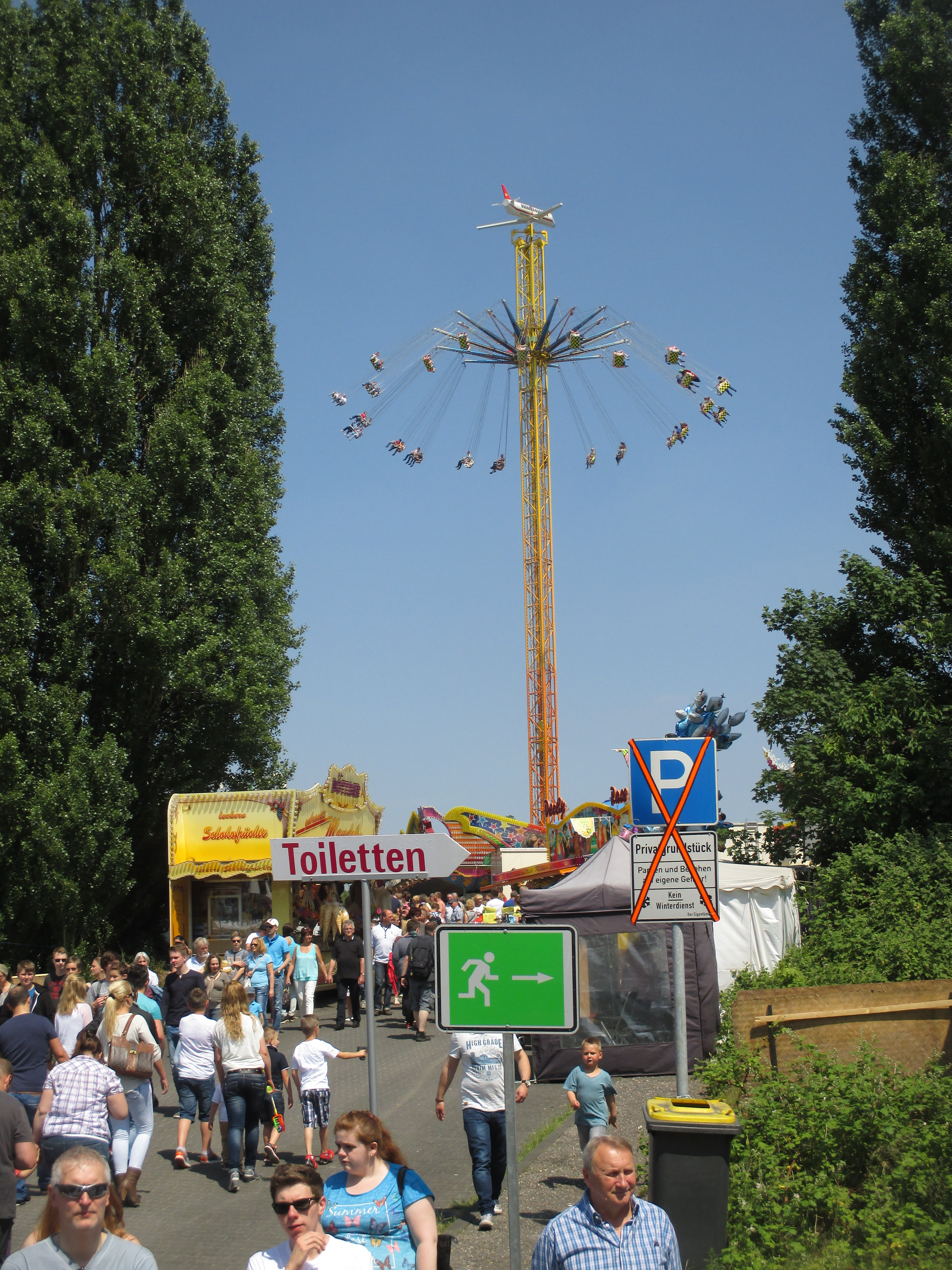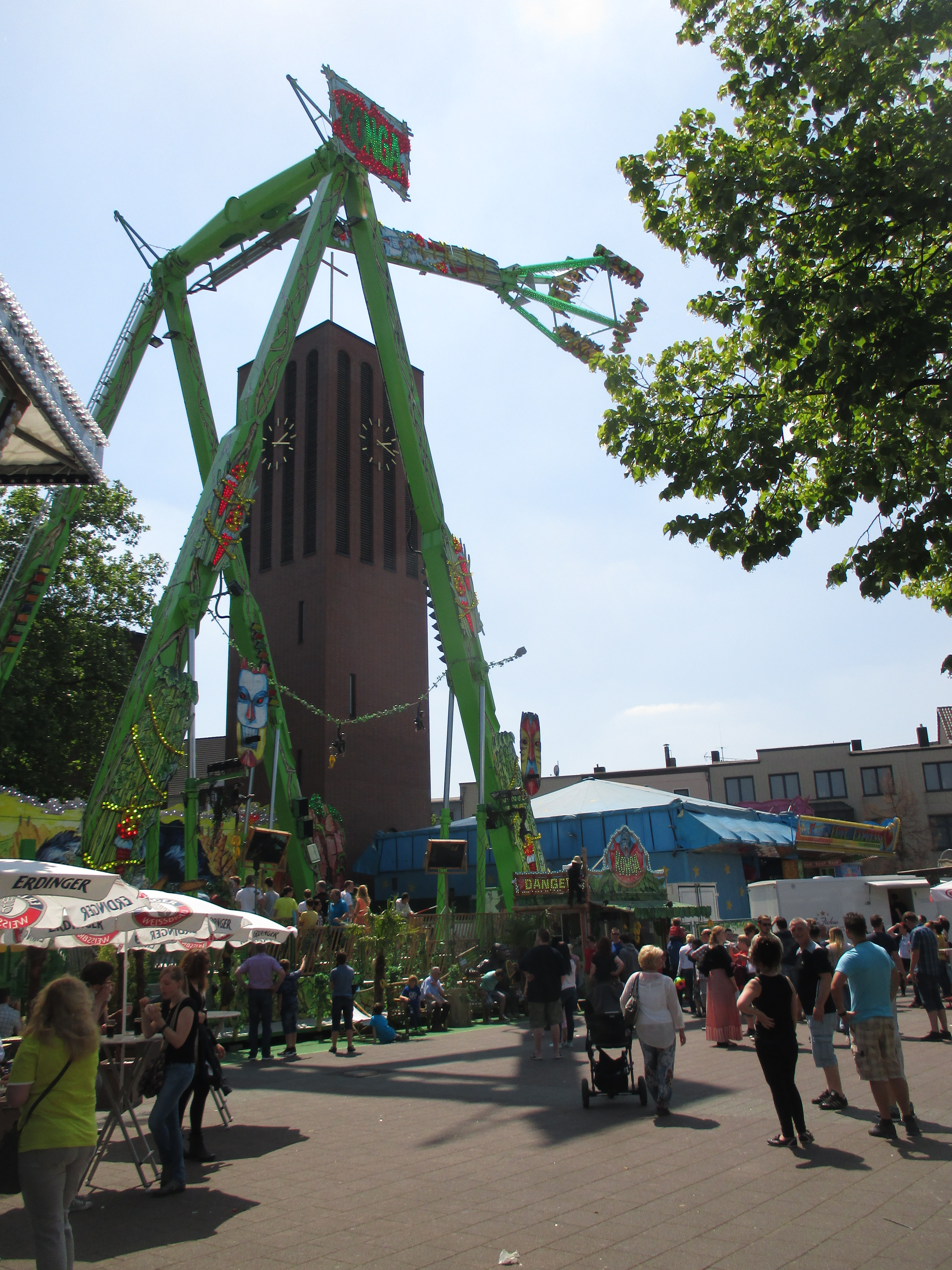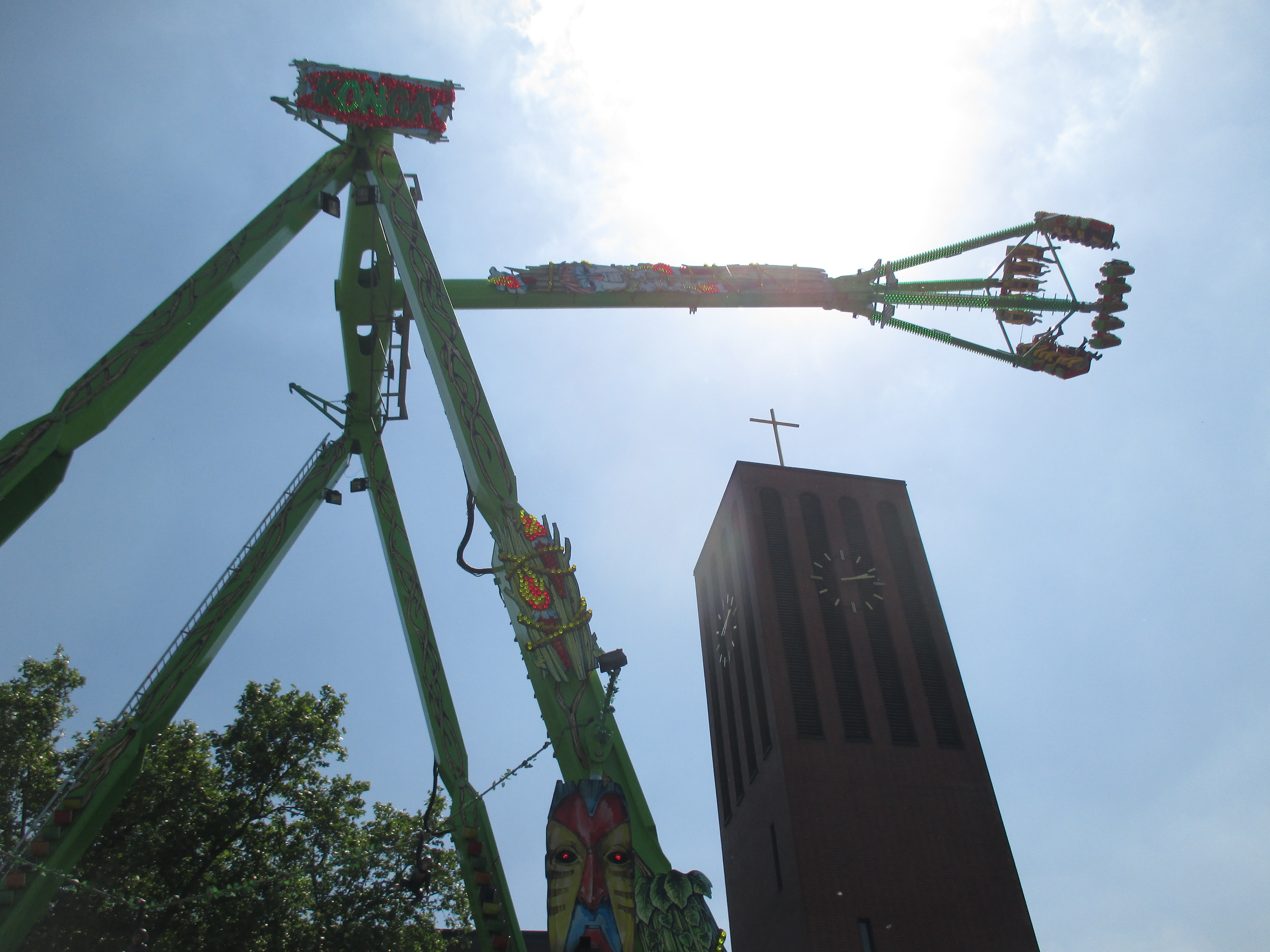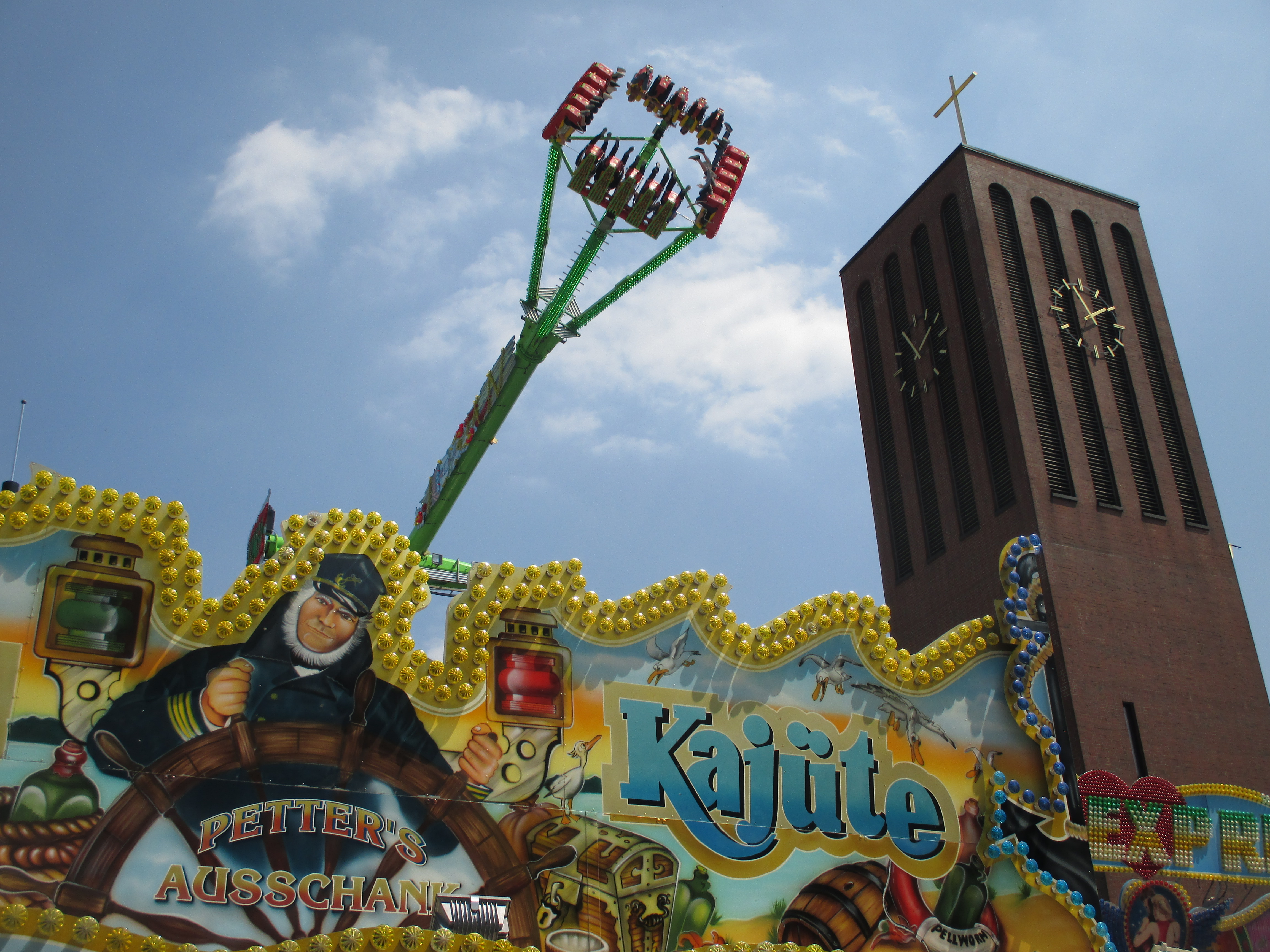 Heute Mittag ging es bei bestem Sonnenwetter nach Oberhausen-Sterkrade. Zum ersten Mal statt mit Bus und Bahn via CentrO ging es diesmal direkt mit dem RE von Duisburg nach Sterkrade Bahnhof. Unterwegs kann man aus dem Fensterschauend einen Schaustellerplatz neben der Bahn sehen, auf dem viele Transporte der Alpina-Bahn abgestellt sind. Im Gegensatz zu den vielen anderen Transportwagen sind bei diesen jedoch noch die Fahrgeschäftsteile auf den Wagen - die Alpina-Bahn ist also nicht Teil des Sterkrader Fronleichnamsaufgebotes.