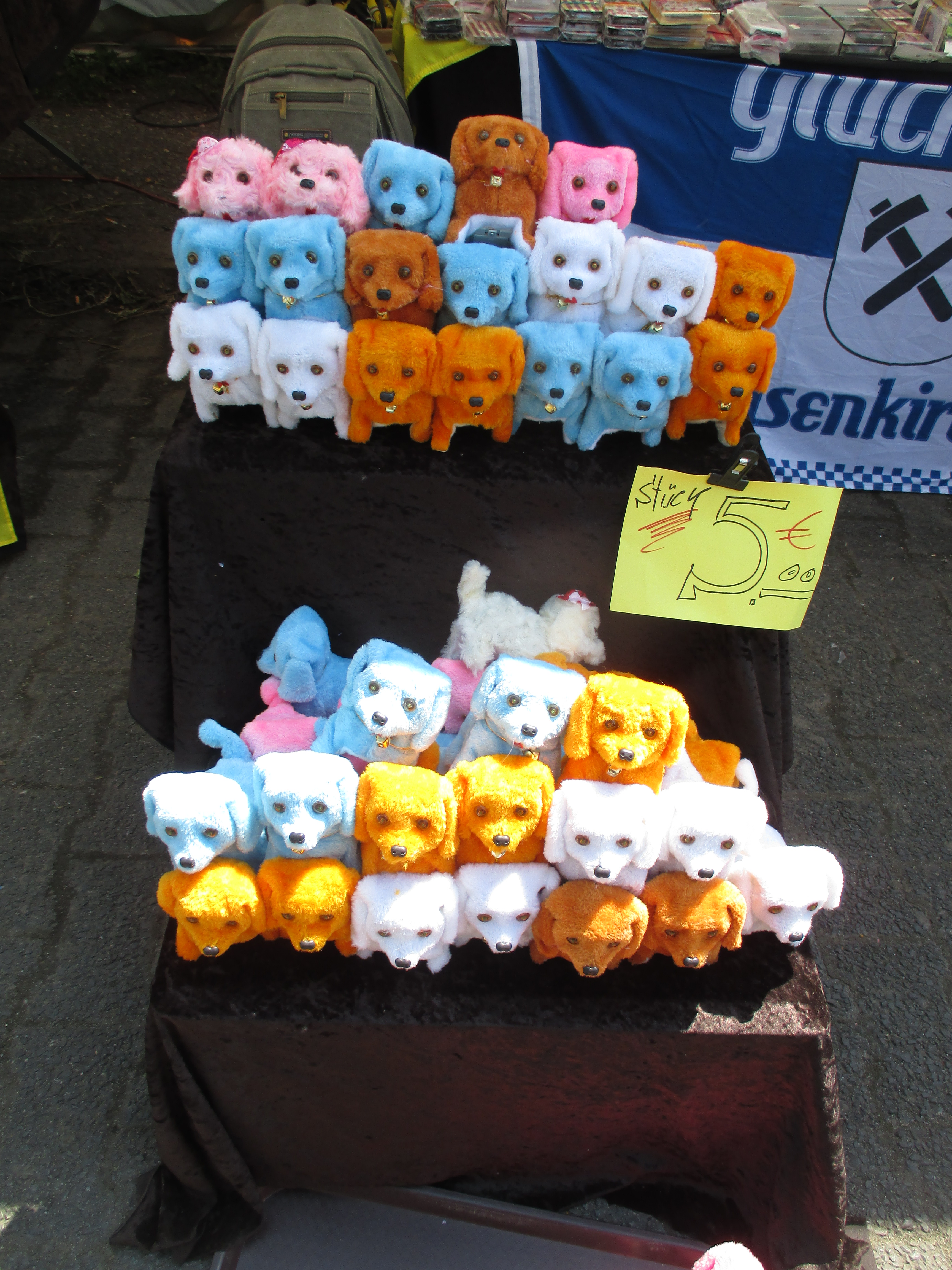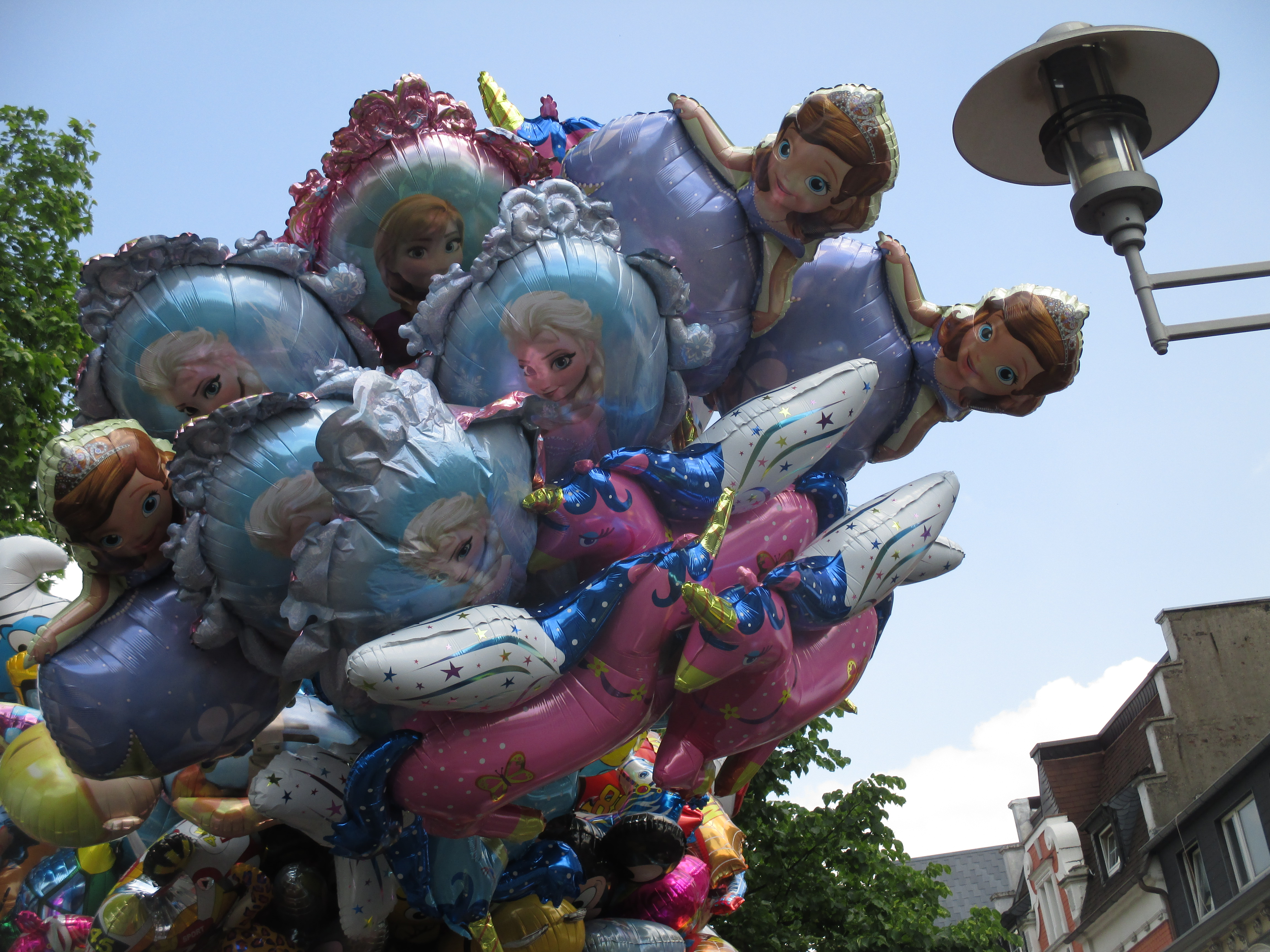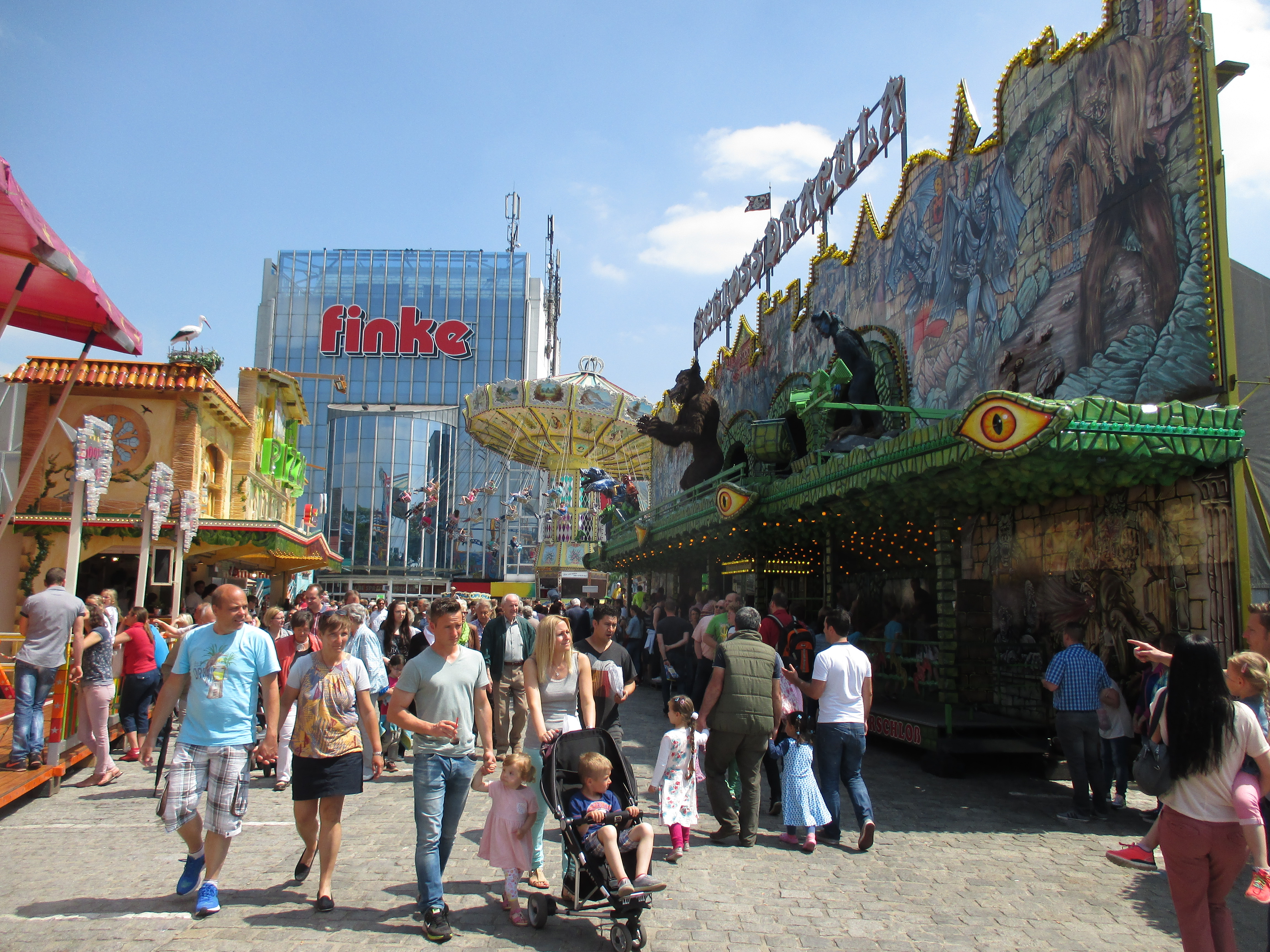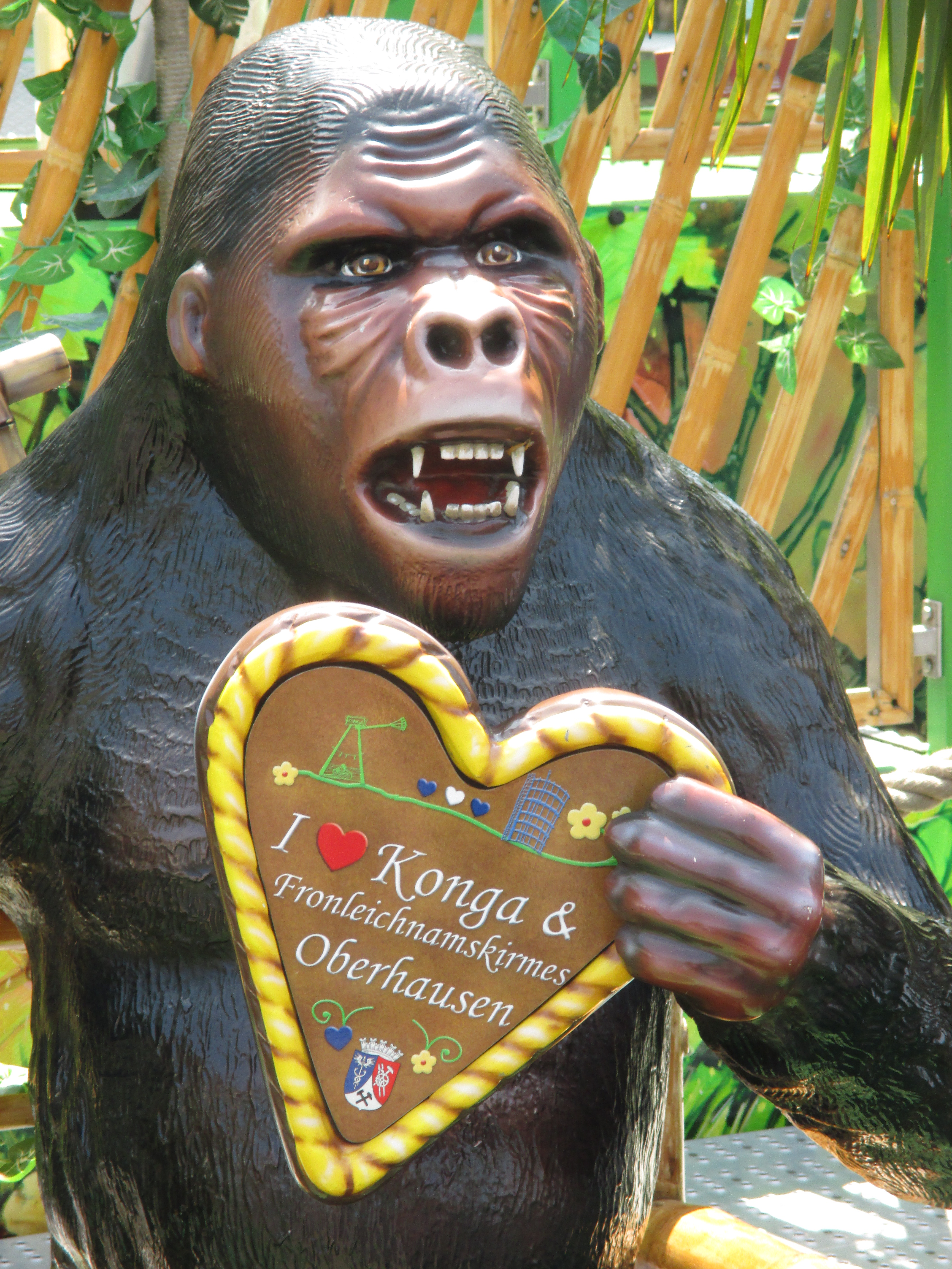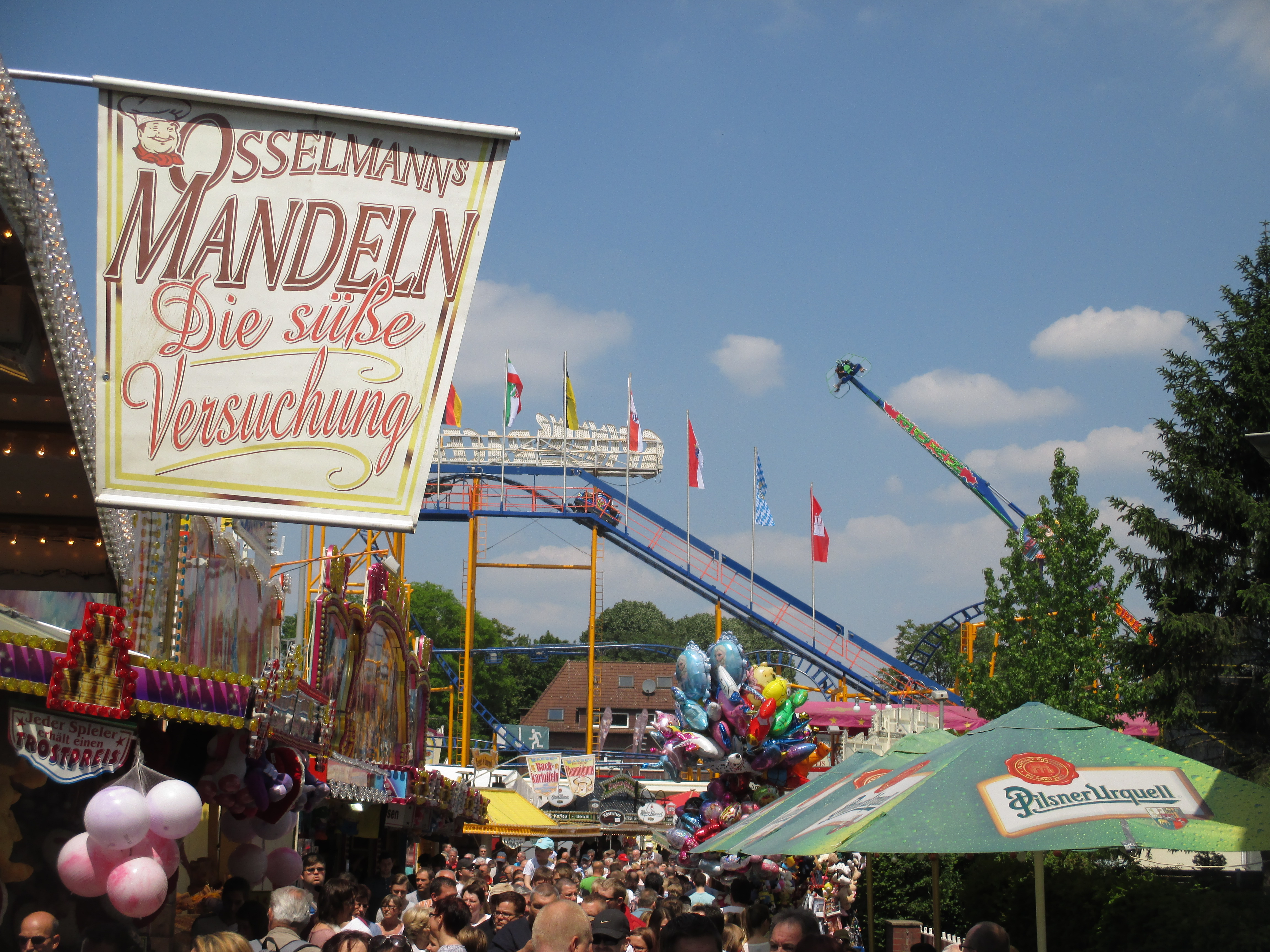 Heute Mittag ging es bei bestem Sonnenwetter nach Oberhausen-Sterkrade. Zum ersten Mal statt mit Bus und Bahn via CentrO ging es diesmal direkt mit dem RE von Duisburg nach Sterkrade Bahnhof. Unterwegs kann man aus dem Fensterschauend einen Schaustellerplatz neben der Bahn sehen, auf dem viele Transporte der Alpina-Bahn abgestellt sind. Im Gegensatz zu den vielen anderen Transportwagen sind bei diesen jedoch noch die Fahrgeschäftsteile auf den Wagen - die Alpina-Bahn ist also nicht Teil des Sterkrader Fronleichnamsaufgebotes.