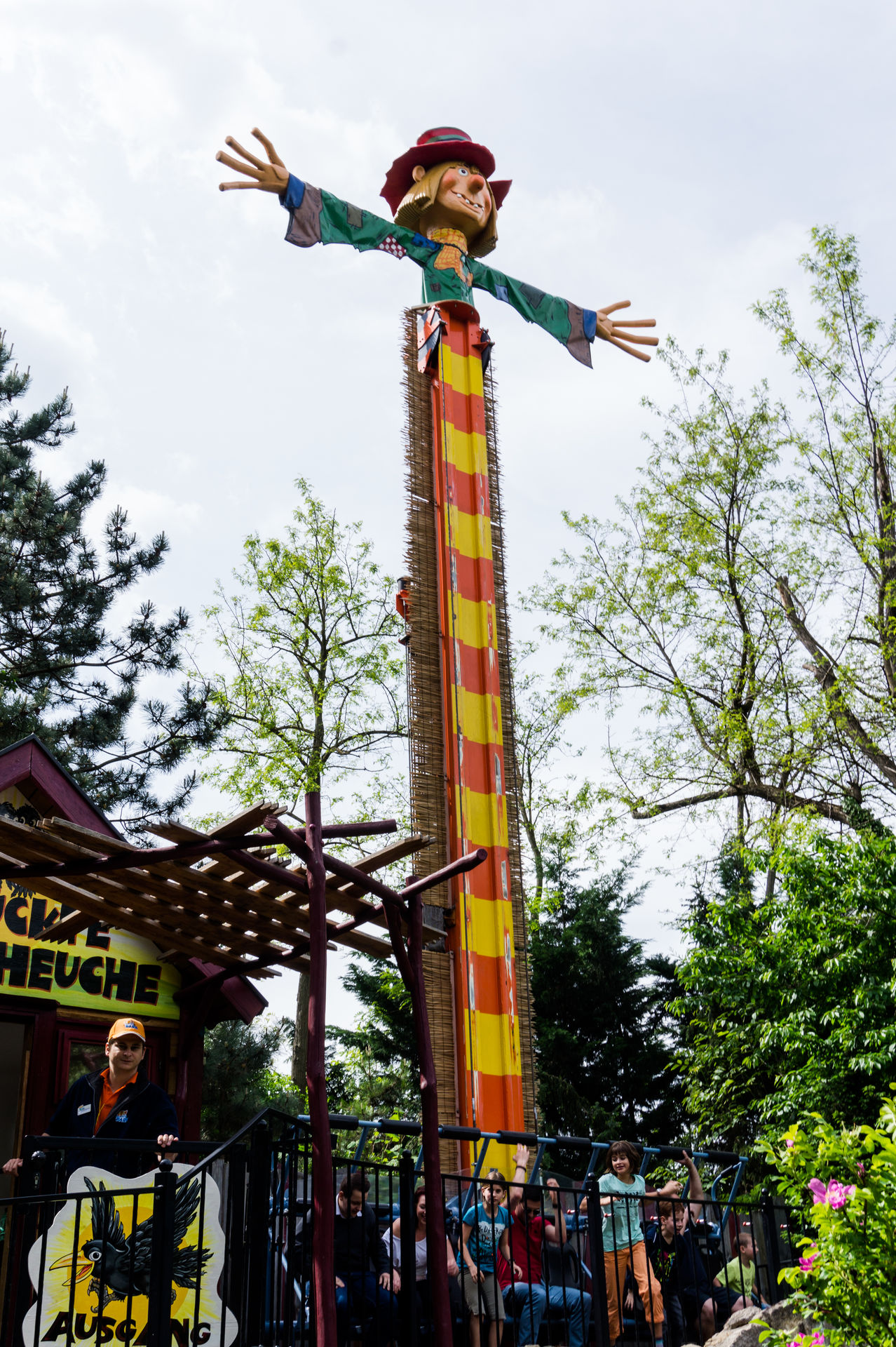Folgt man den Wegen nach rechts gelangt man schnurstracks in den schönsten Bereich des Parks, welcher sich ganz dem Thema Bauernhof widmet. Wer den Mullewapp Bereich im Erlebniszoo Hannover bereits als gelungen betrachtet wird hier seine wahrste Freude dran haben, denn eine solche Detailverliebtheit findet man nur allzu selten. Dabei scheint jedes Fahrgeschäft perfekt ins Gesamtkonzept des Bereichs eingebunden zu sein, wie etwa der abc Rides Tilt Tower Verrückte Vogelscheuche, welcher ein sehr vergnügliches Programm laufen ließ, der