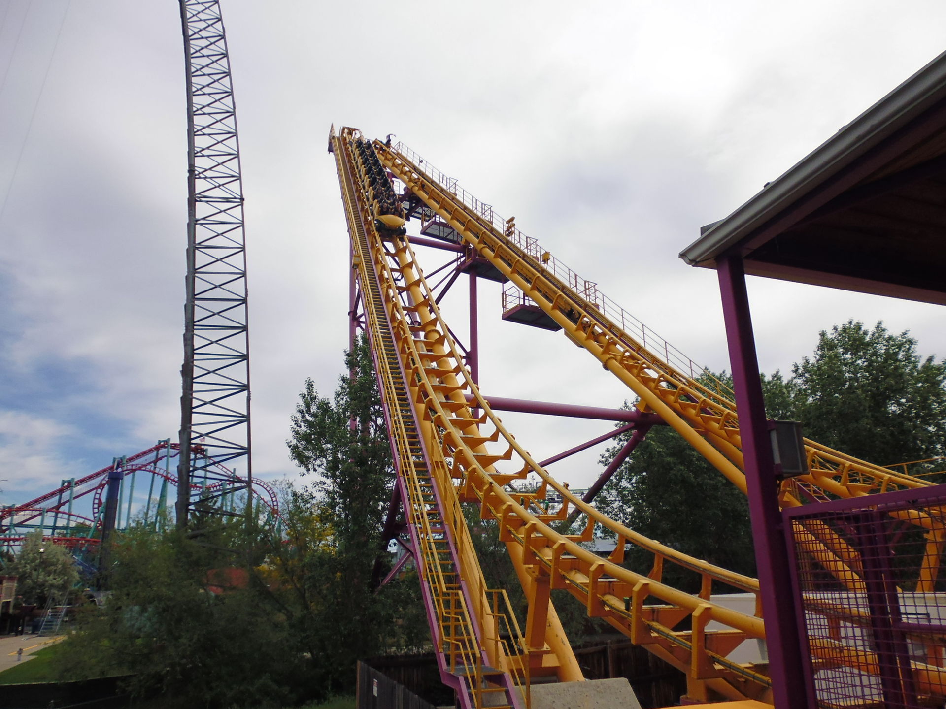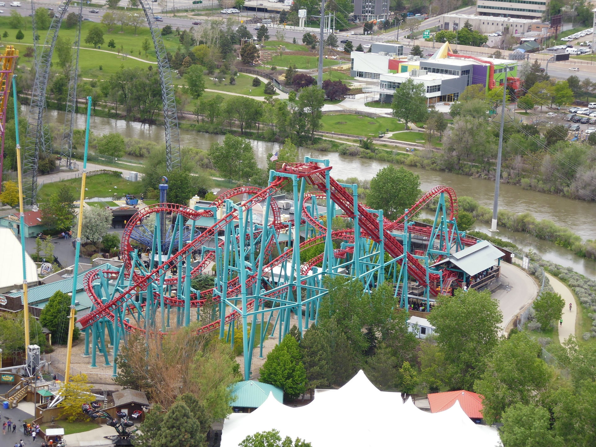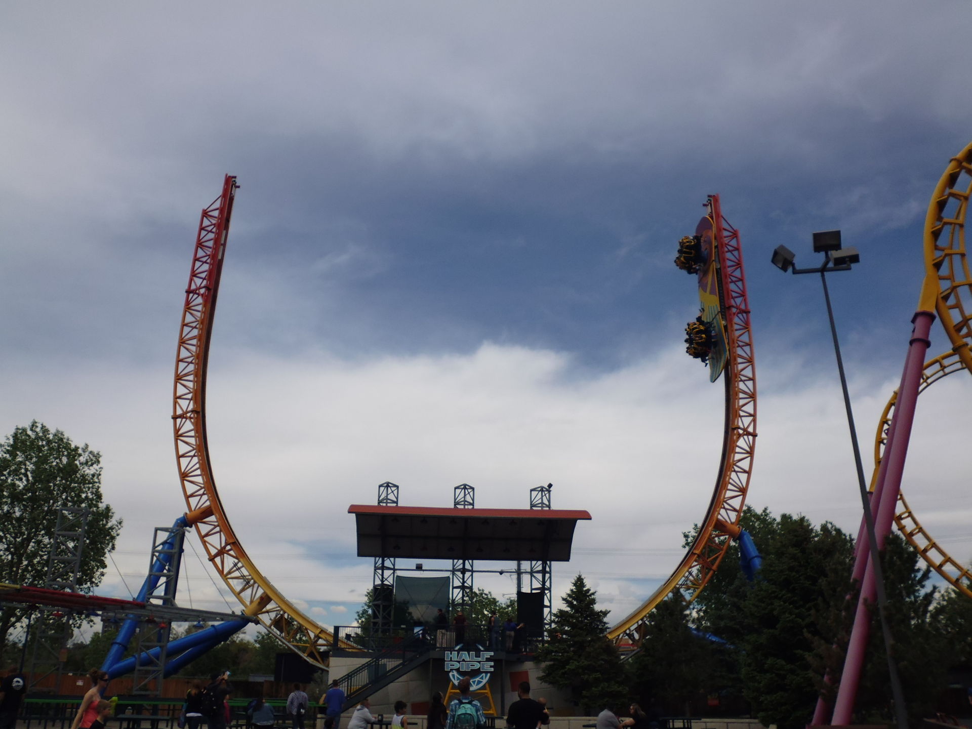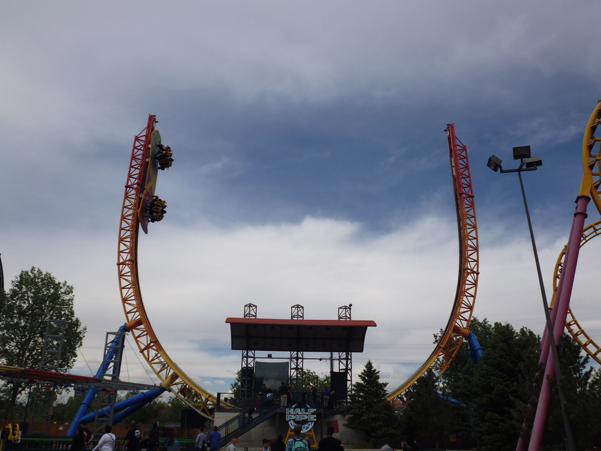 Intamin Halfpipe als Coastersaison-Auftakt ist durchaus mit einer gewissen Geilheit verbunden. Die eigenartigen Sichtperspektiven auf den Park, den Himmel und die Hochhäuser in Downtown Denver, der schöne Druck im Tal, die unglaublichen nach aussen wirkenden Kräfte und die Geräusche machen auch dieses Exemplar zu einem tollen Schmuckstück. Obgleich etwas höher als das Exemplar in Bloomington, fehlt hier natürlich der Thrill des fetzigen und optisch spektakulären Abtauchens in letzter Sekunde vor vermeintlicher Kollision mit dem Hallendach. Auch habe ich den Eindruck, dass die Senkrecht-Türme hier nicht ganz so "eingebogen", also knapp über einem 90°-Winkel ausgeführt sind. Und leider - das muss man einfach feststellen - ist dies im direkten Vergleich ein überraschend rappeliges Exemplar gewesen. Hier hätte ich die Sonnenbrille besser in den Cargo-Taschen verstauen sollen, die wäre mir vor lauter Vibration fast runtergefallen. Ganz abgesehen davon hat sich präzise während der Nationalhymne eine dicke Wolkenschicht über die Stadt und den Park gelegt, die den ganzen Tag nicht mehr gewichen ist, so dass die Brille eh nicht mehr nötig gewesen wäre.