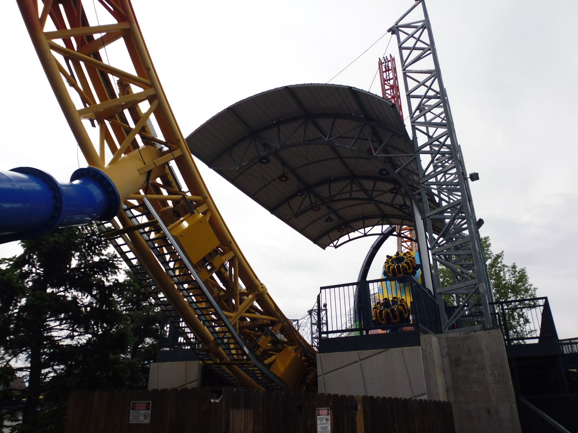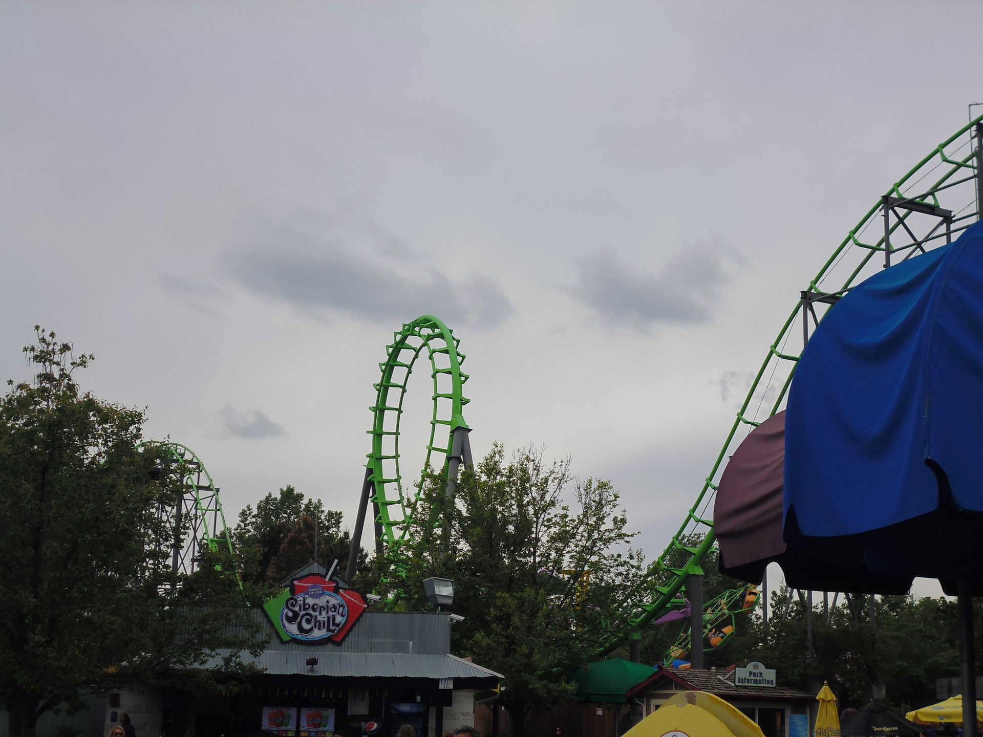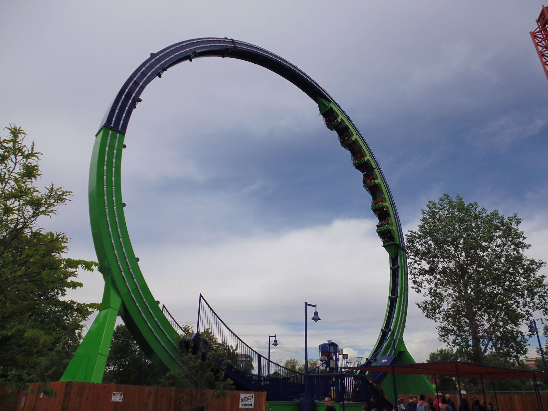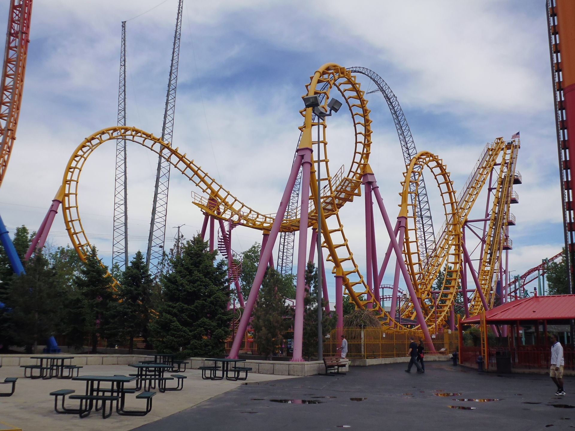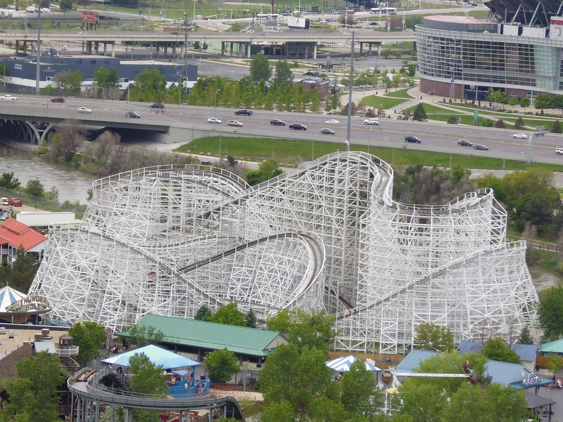 Intamin Halfpipe als Coastersaison-Auftakt ist durchaus mit einer gewissen Geilheit verbunden. Die eigenartigen Sichtperspektiven auf den Park, den Himmel und die Hochhäuser in Downtown Denver, der schöne Druck im Tal, die unglaublichen nach aussen wirkenden Kräfte und die Geräusche machen auch dieses Exemplar zu einem tollen Schmuckstück. Obgleich etwas höher als das Exemplar in Bloomington, fehlt hier natürlich der Thrill des fetzigen und optisch spektakulären Abtauchens in letzter Sekunde vor vermeintlicher Kollision mit dem Hallendach. Auch habe ich den Eindruck, dass die Senkrecht-Türme hier nicht ganz so "eingebogen", also knapp über einem 90°-Winkel ausgeführt sind. Und leider - das muss man einfach feststellen - ist dies im direkten Vergleich ein überraschend rappeliges Exemplar gewesen. Hier hätte ich die Sonnenbrille besser in den Cargo-Taschen verstauen sollen, die wäre mir vor lauter Vibration fast runtergefallen. Ganz abgesehen davon hat sich präzise während der Nationalhymne eine dicke Wolkenschicht über die Stadt und den Park gelegt, die den ganzen Tag nicht mehr gewichen ist, so dass die Brille eh nicht mehr nötig gewesen wäre.