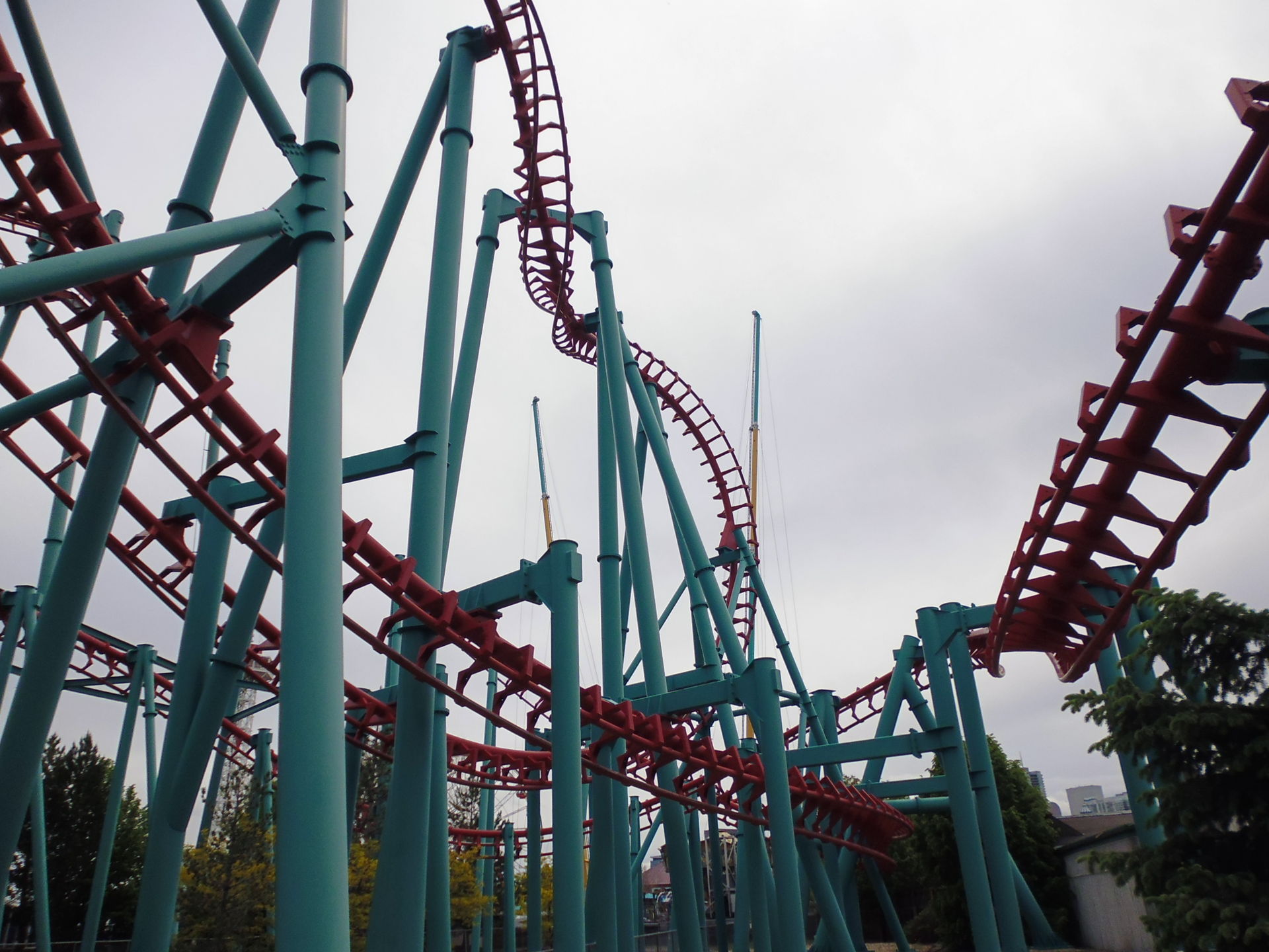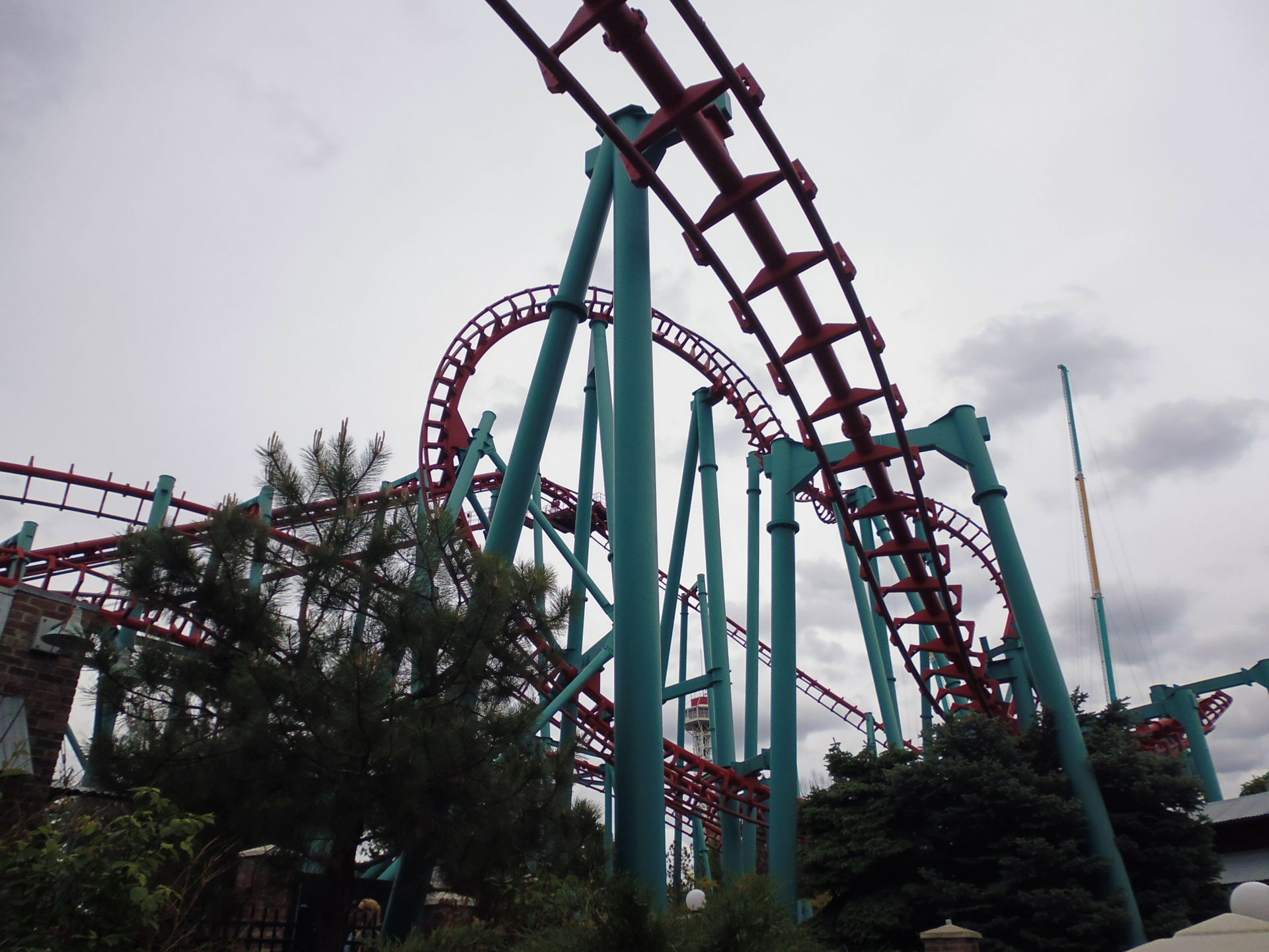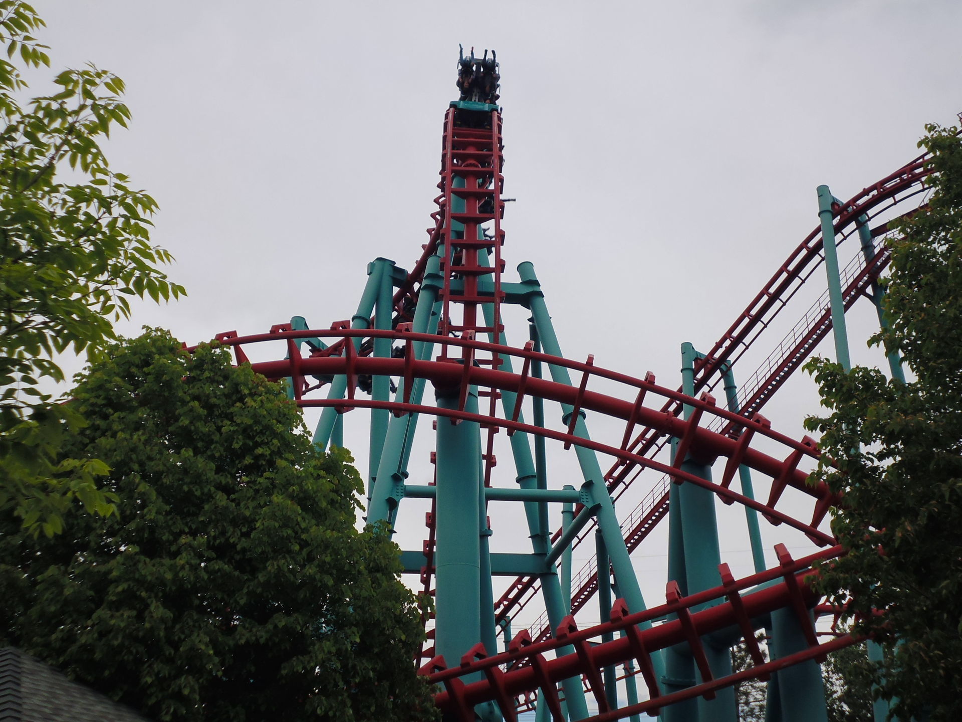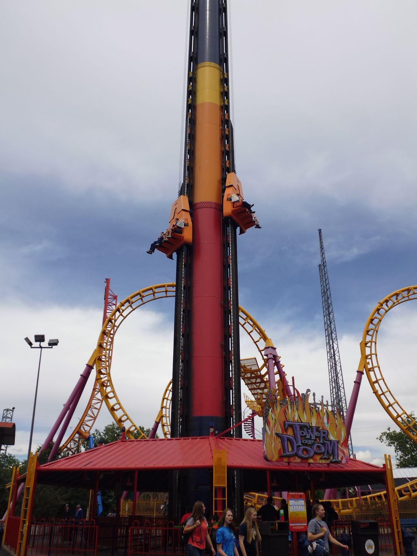 Intamin Halfpipe als Coastersaison-Auftakt ist durchaus mit einer gewissen Geilheit verbunden. Die eigenartigen Sichtperspektiven auf den Park, den Himmel und die Hochhäuser in Downtown Denver, der schöne Druck im Tal, die unglaublichen nach aussen wirkenden Kräfte und die Geräusche machen auch dieses Exemplar zu einem tollen Schmuckstück. Obgleich etwas höher als das Exemplar in Bloomington, fehlt hier natürlich der Thrill des fetzigen und optisch spektakulären Abtauchens in letzter Sekunde vor vermeintlicher Kollision mit dem Hallendach. Auch habe ich den Eindruck, dass die Senkrecht-Türme hier nicht ganz so "eingebogen", also knapp über einem 90°-Winkel ausgeführt sind. Und leider - das muss man einfach feststellen - ist dies im direkten Vergleich ein überraschend rappeliges Exemplar gewesen. Hier hätte ich die Sonnenbrille besser in den Cargo-Taschen verstauen sollen, die wäre mir vor lauter Vibration fast runtergefallen. Ganz abgesehen davon hat sich präzise während der Nationalhymne eine dicke Wolkenschicht über die Stadt und den Park gelegt, die den ganzen Tag nicht mehr gewichen ist, so dass die Brille eh nicht mehr nötig gewesen wäre.