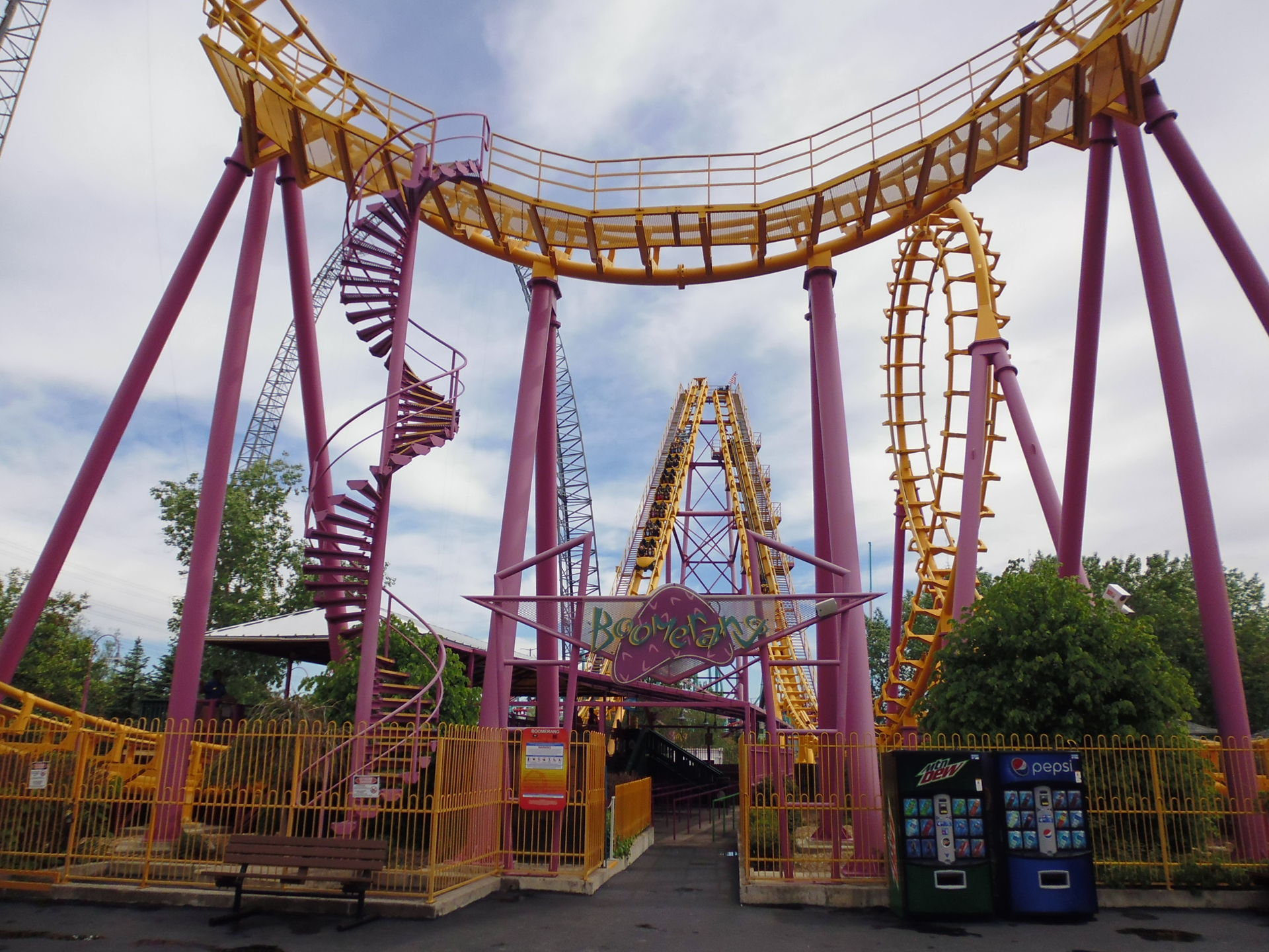 Boomerang. Bald steigt man in die Höhe und die Fahrgäste werden auf der Kuppe in die Kehrgerade wieder grandios aus den Sitzen gehoben. Auf der anderen Seite der Konstruktion beim dortigen Attendant angekommen, verweilt man ein ganzes Weilchen in der Horizontalen und kann beobachten, wie der Zug wirklich bis fast ganz nach vorn ans Streckenende rollt, sich einklinkt und bald darauf rückwärts wieder in die vorangehende Strecke entsandt wird - wiederum mit herrlicher