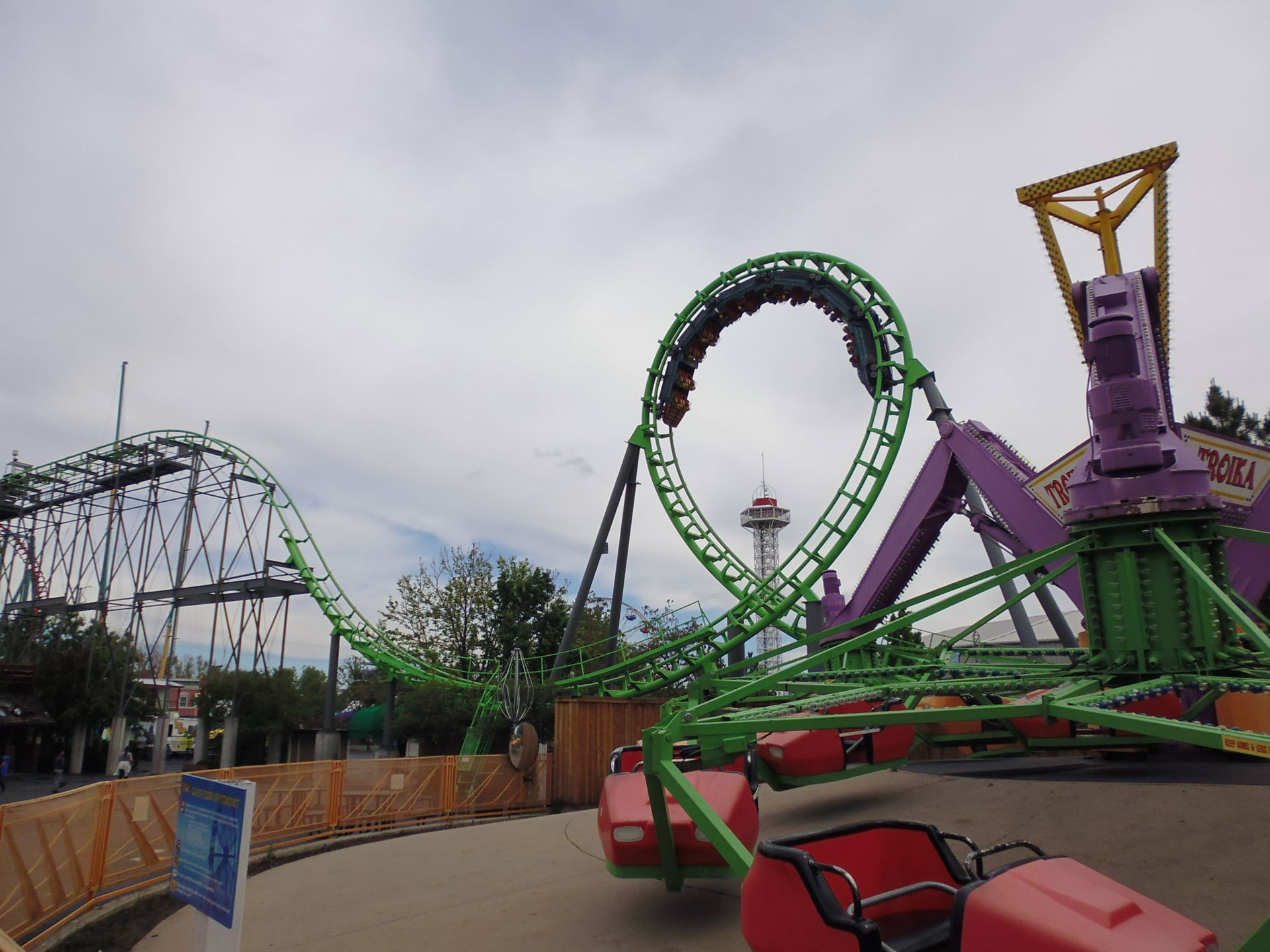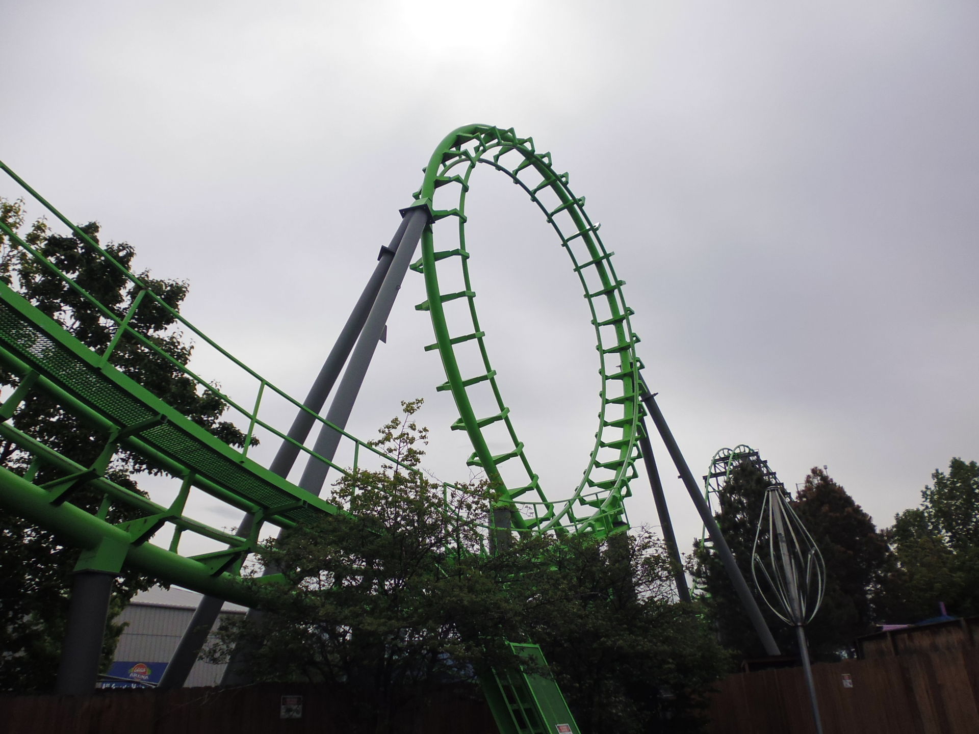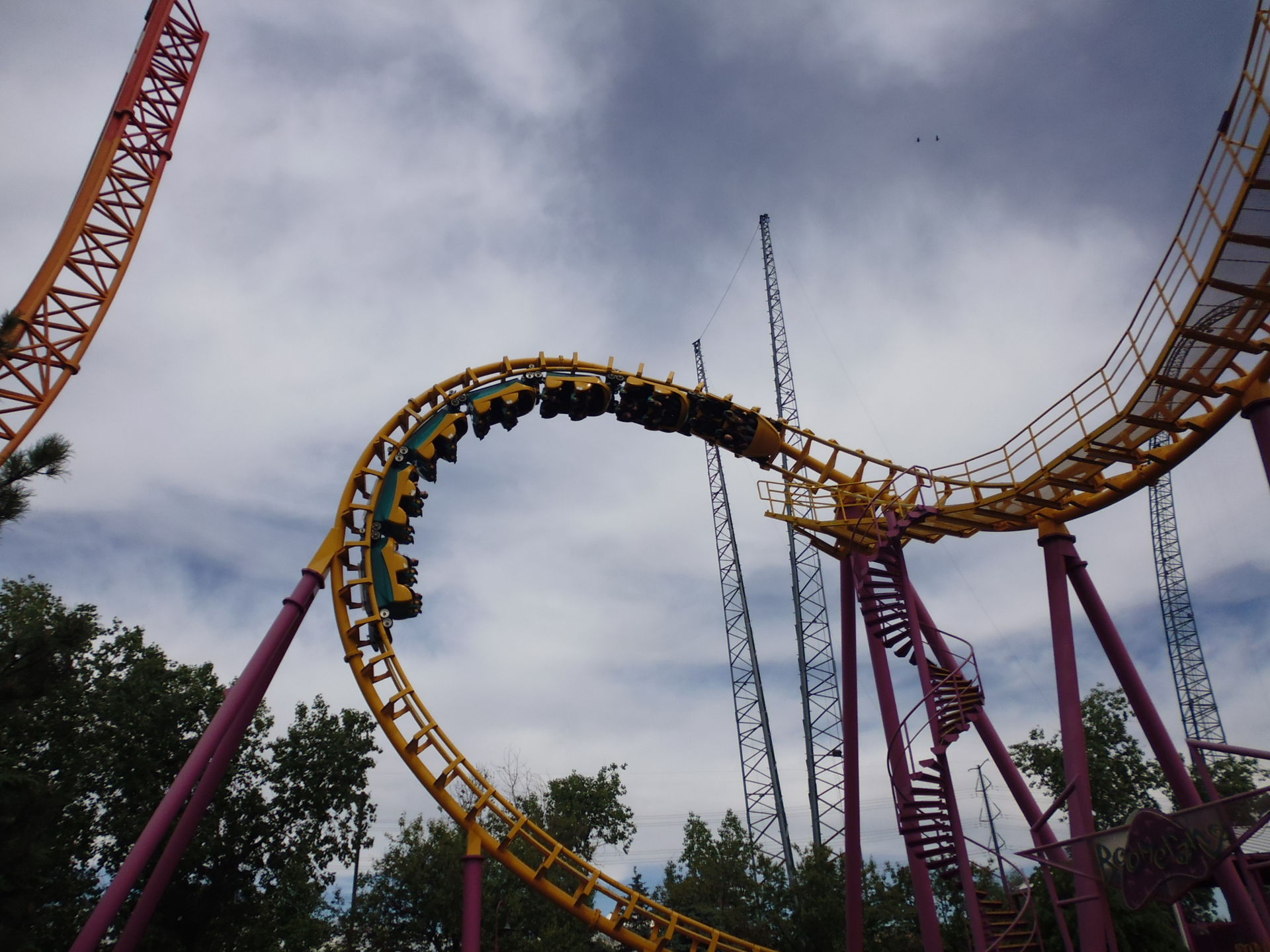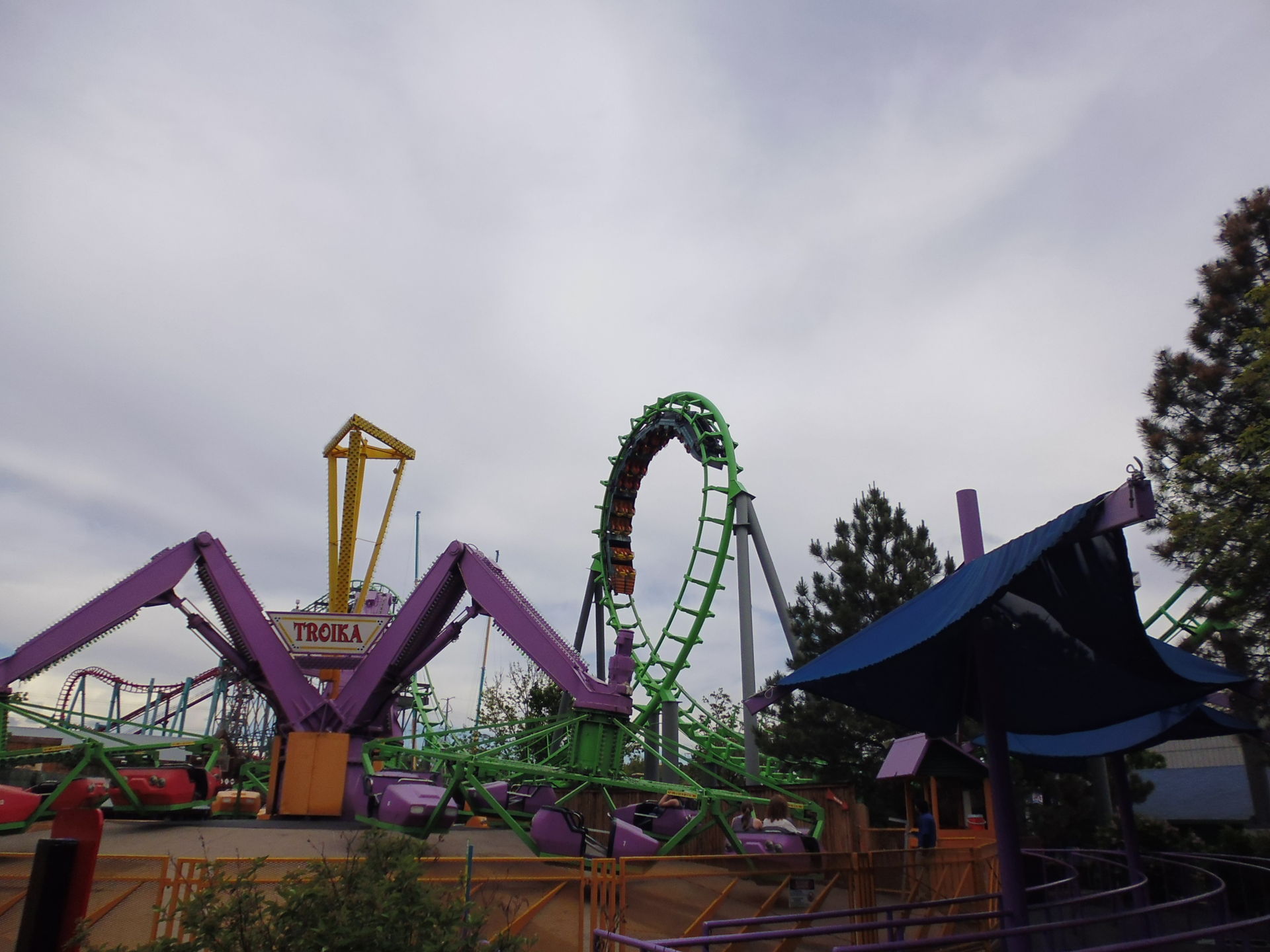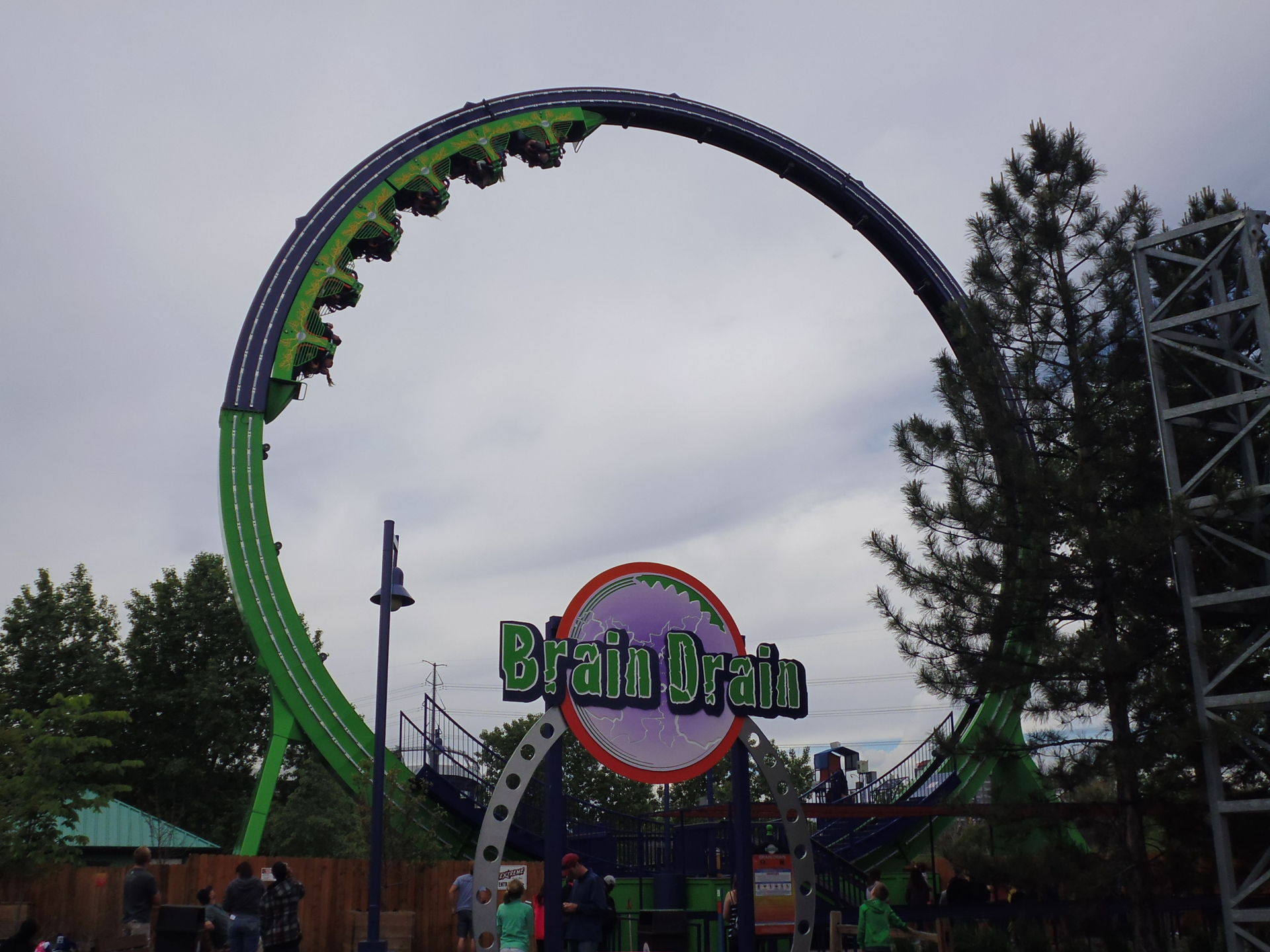 Loop mit dem genialen Namen Brain Drain. Fährt sich dank angenehmen Bügeln und interessanten Vibrationen in den Beinen doch ein Stück anders als eine Überkopf-Schiffschaukel. Ich hatte trotz der langen Kopfüber-Verweilzeiten, die sonst nicht so meins sind, grossen Spass hier drauf - erst recht bei nicht existenter Schlange.