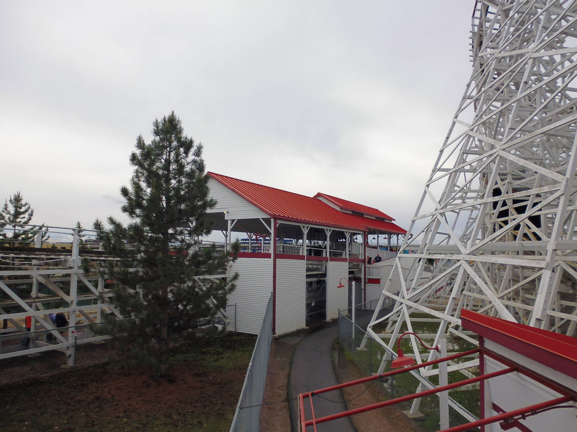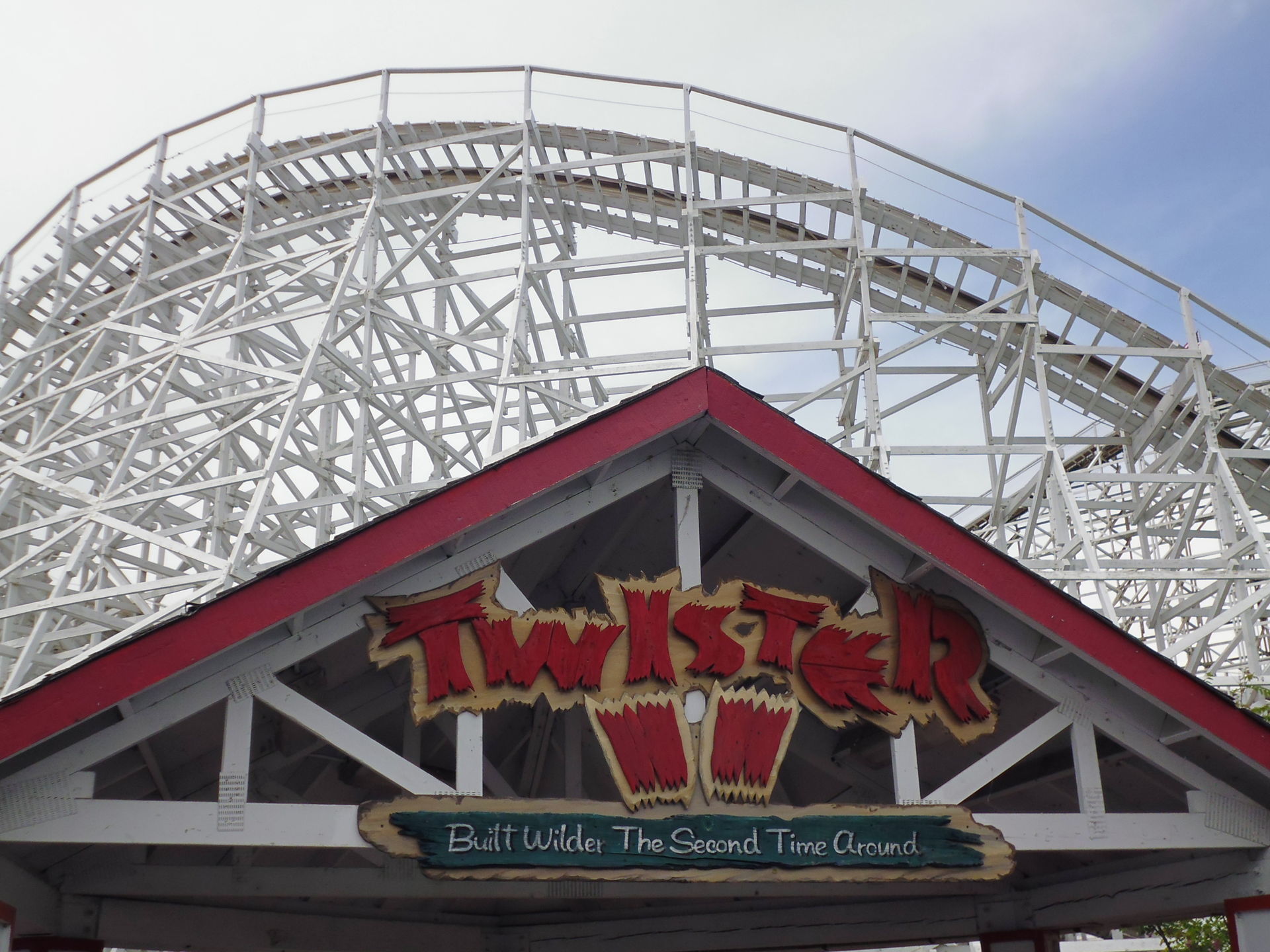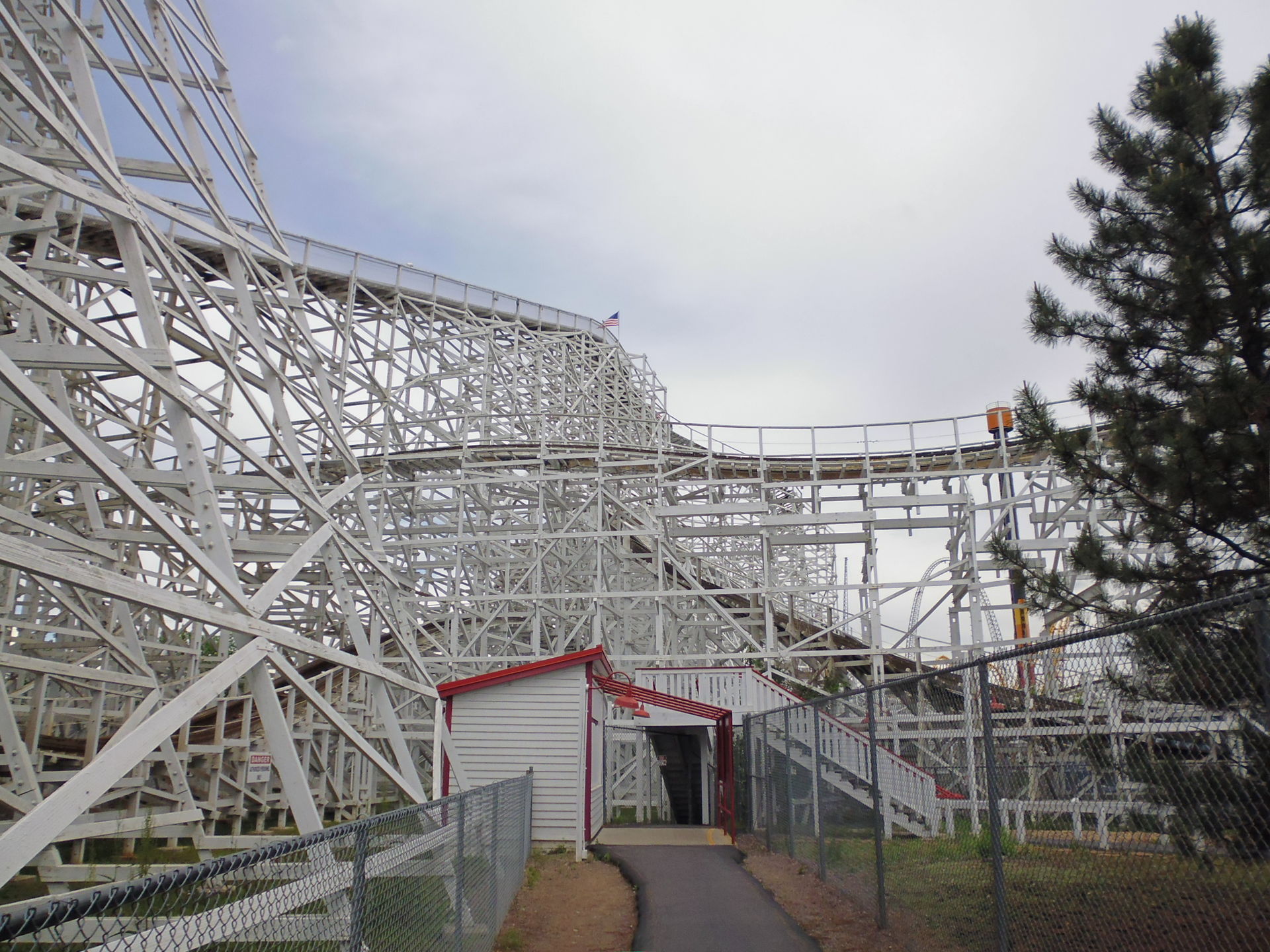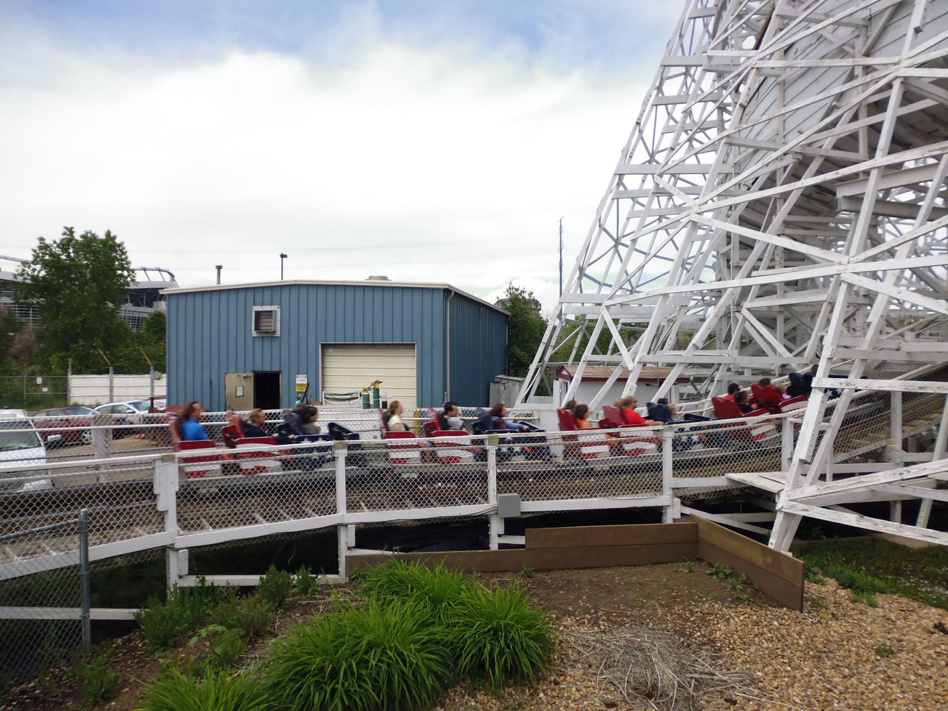 Nun hatte ich Lust auf etwas Holz und steuerte den sich in einer ziemlich abgelegenen Sackgassen-Lage befindlichen Woodie Twister II an. Hierbei handelt es sich um einen Nachbau des 1964 am originalen Standort von Elitch Gardens eröffneten Mister Twister, seines Zeichens auch Vorbild für Twister in Knoebels. Leider hat dieser vielgeliebte Coasterschatz den Umzug an die neue Location nicht geschafft, so dass 1995 eben ein Neubau am aktuellen Standort vorgenommen wurde. Der originale Mister Twister verblieb laut RCDB noch bis im Januar 1999 in den alten Elitch Gardens, bis diese schliesslich dem Erdboden gleichgemacht wurden.