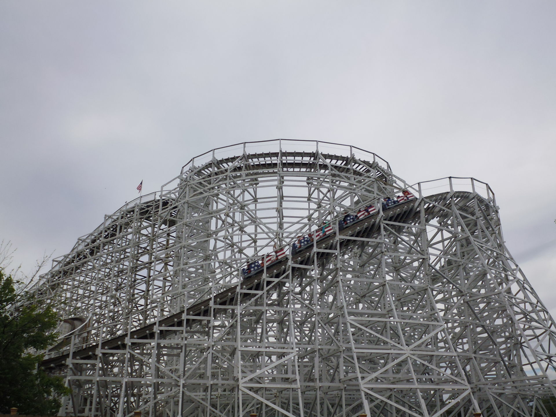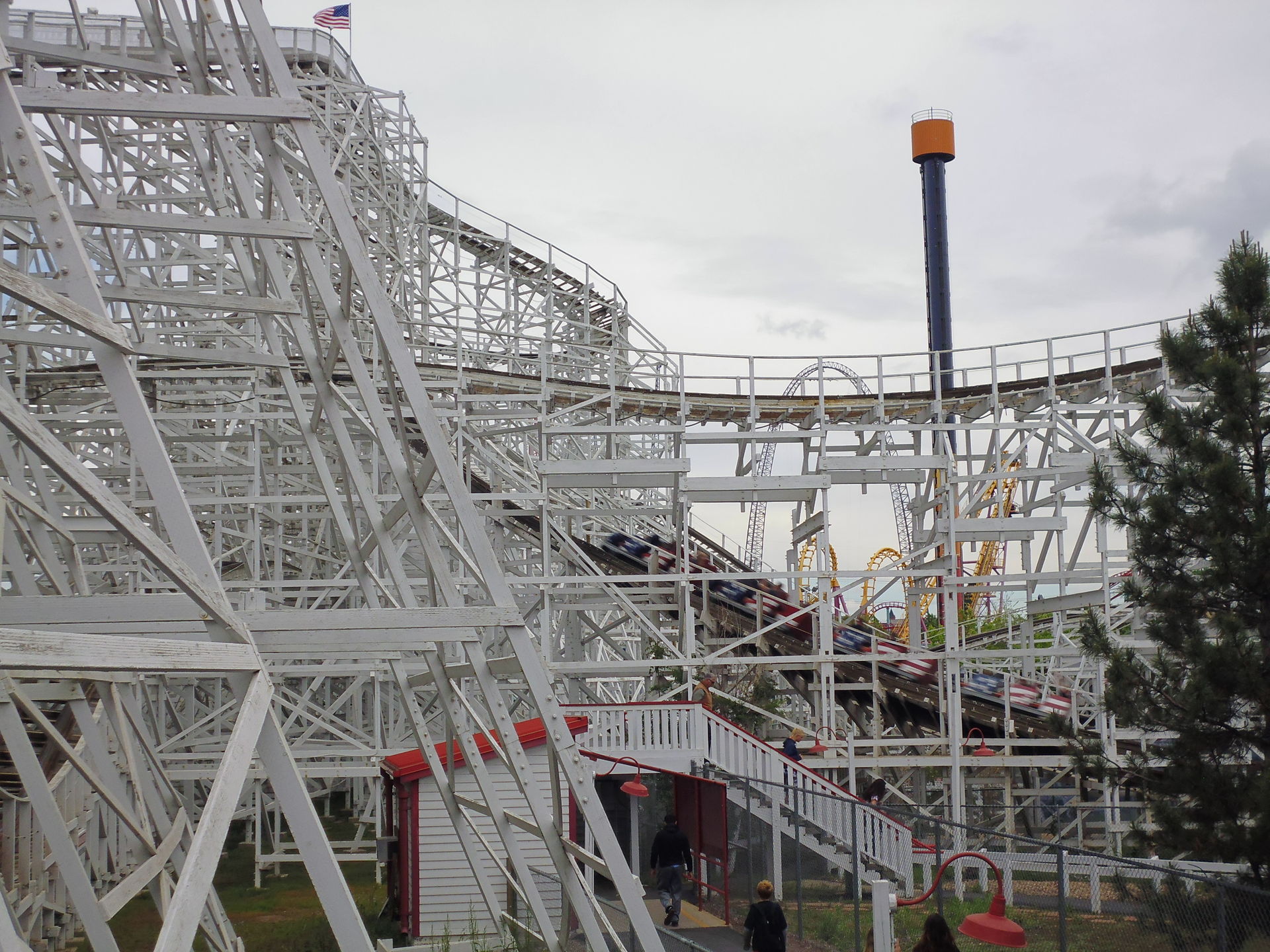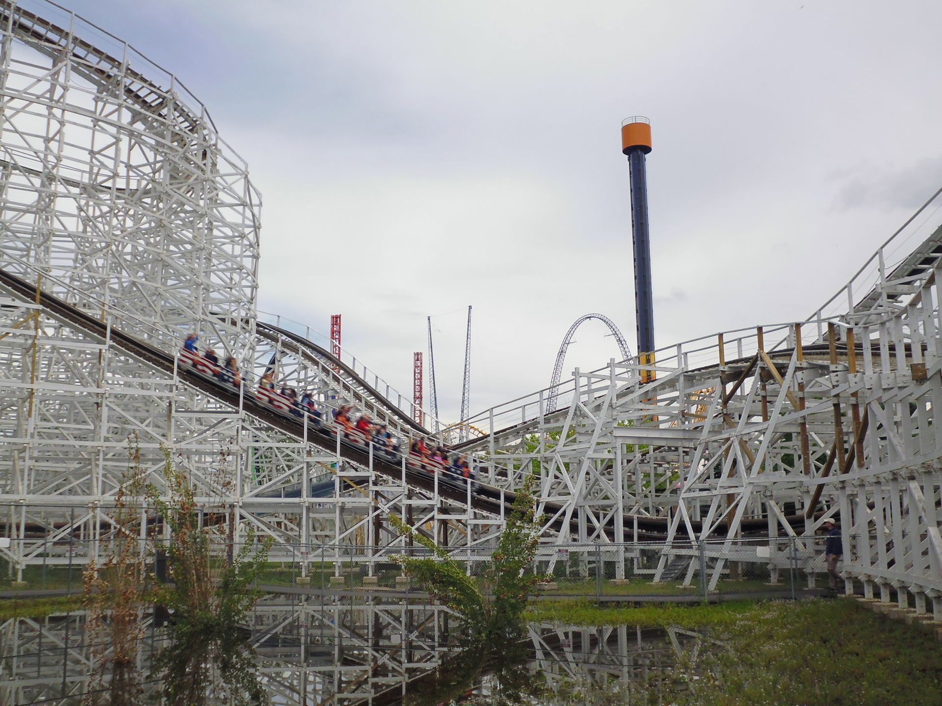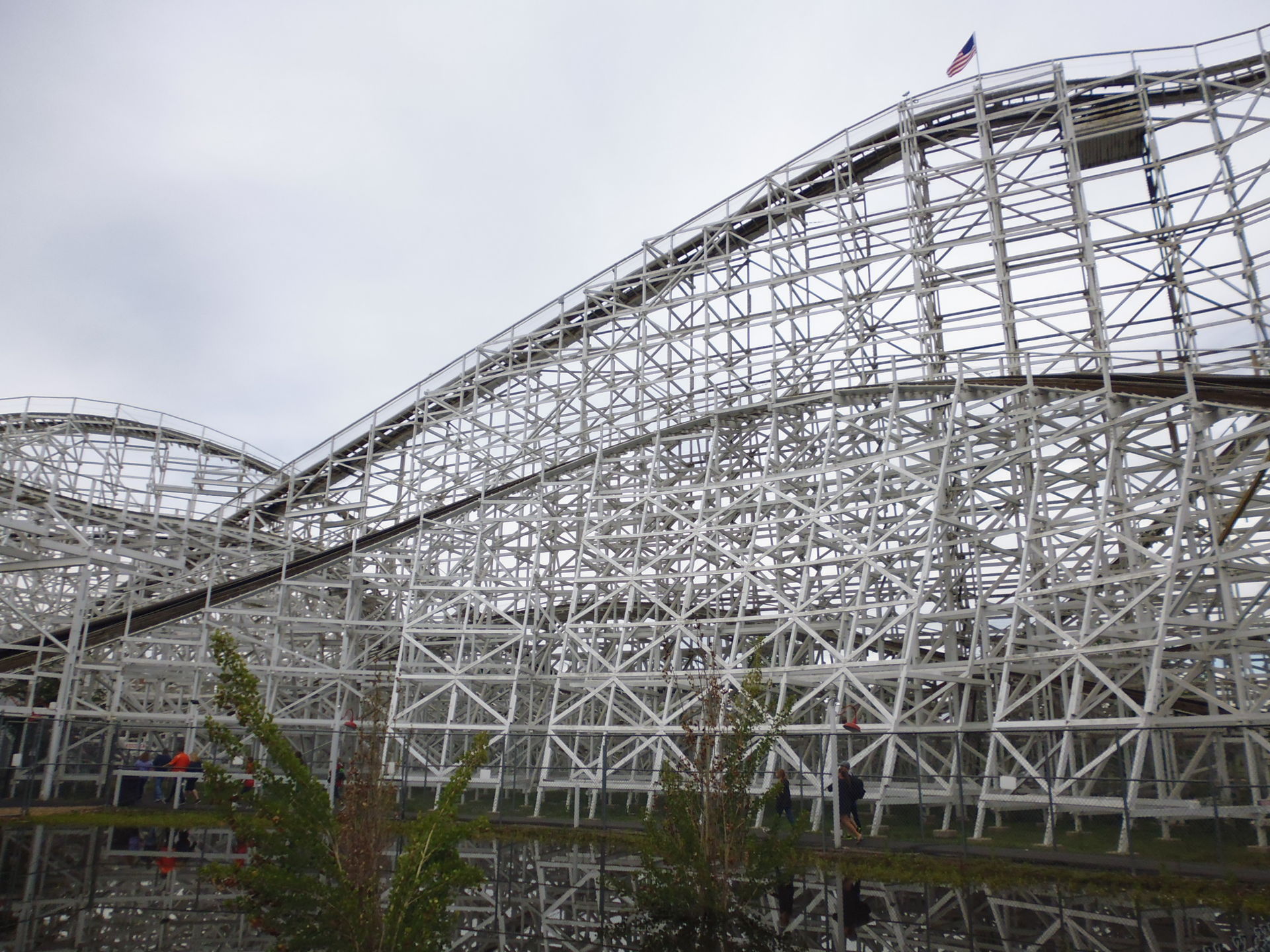 Nun hatte ich Lust auf etwas Holz und steuerte den sich in einer ziemlich abgelegenen Sackgassen-Lage befindlichen Woodie Twister II an. Hierbei handelt es sich um einen Nachbau des 1964 am originalen Standort von Elitch Gardens eröffneten Mister Twister, seines Zeichens auch Vorbild für Twister in Knoebels. Leider hat dieser vielgeliebte Coasterschatz den Umzug an die neue Location nicht geschafft, so dass 1995 eben ein Neubau am aktuellen Standort vorgenommen wurde. Der originale Mister Twister verblieb laut RCDB noch bis im Januar 1999 in den alten Elitch Gardens, bis diese schliesslich dem Erdboden gleichgemacht wurden.
