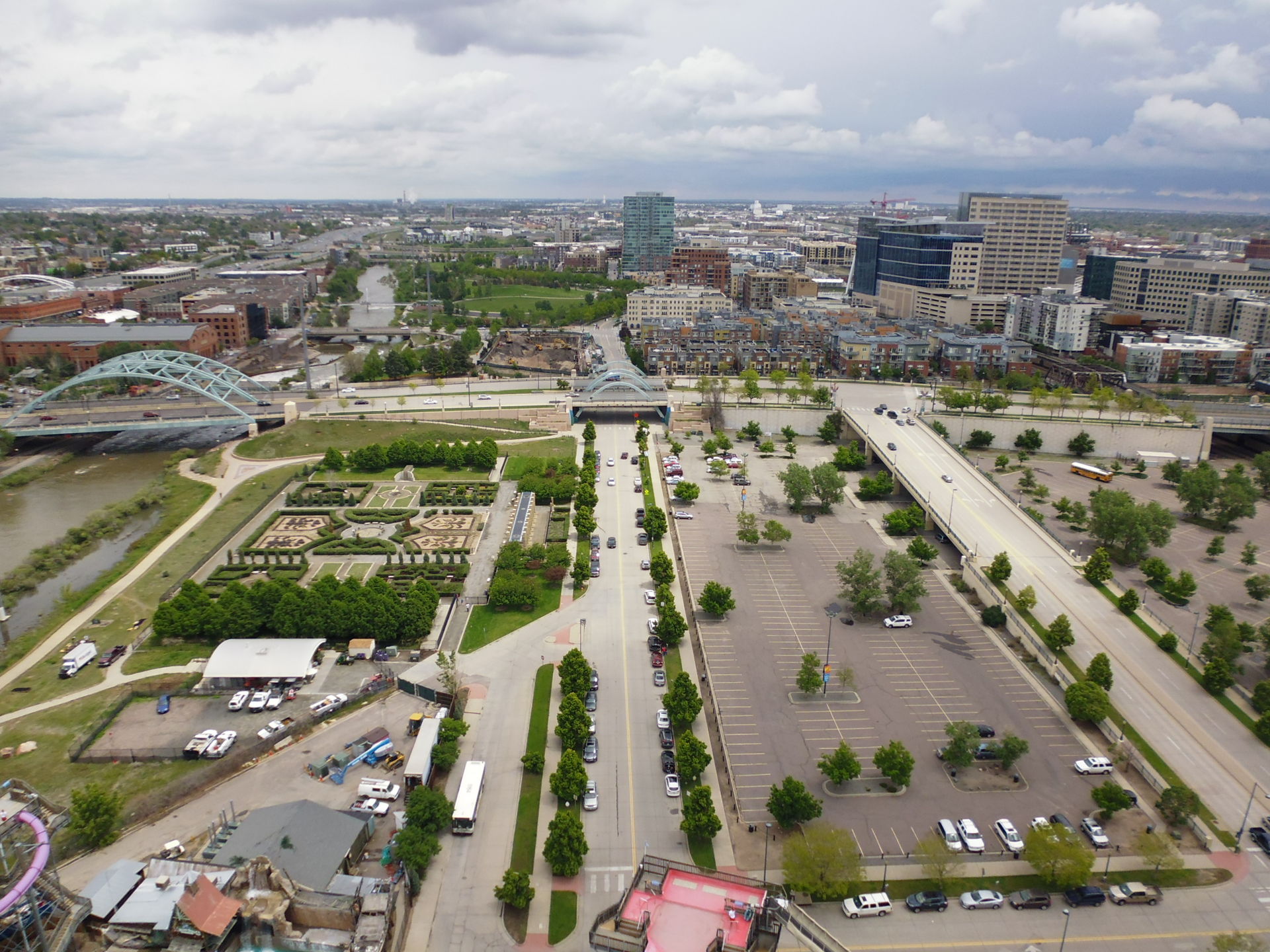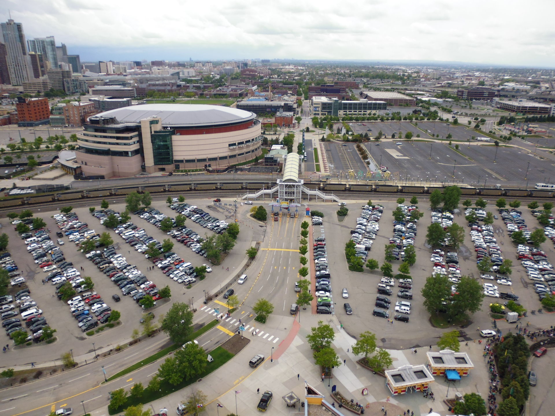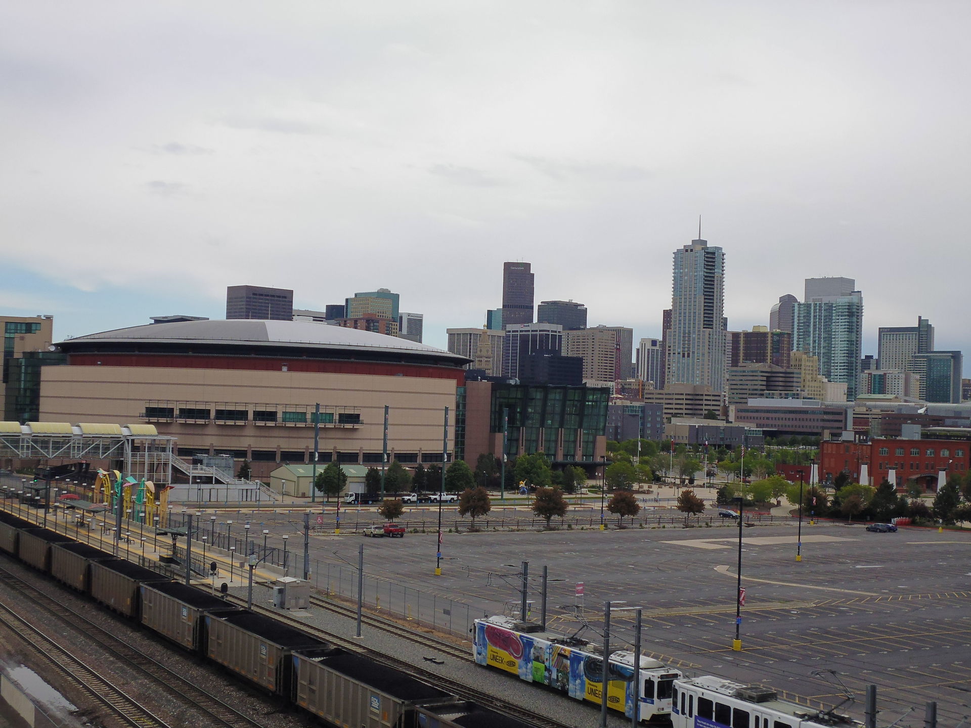Parkplatzzufahrt, Pepsi Center und gemeinsame ÖV-Station.
