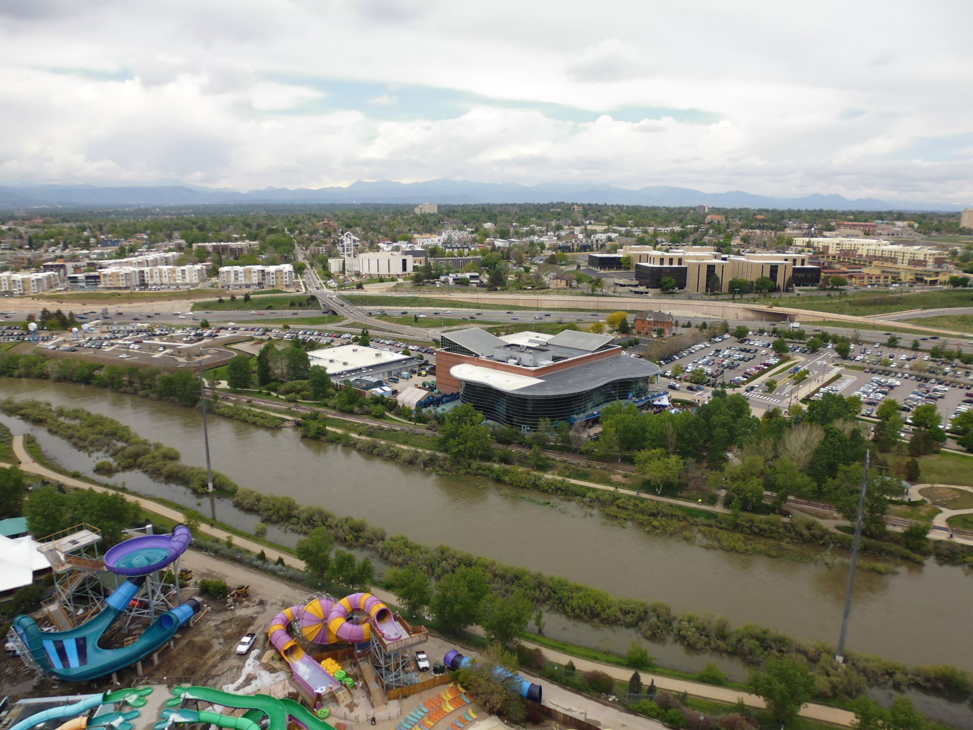 Das Downtown Aquarium jenseits des am Park vorbeiführenden South Platte Rivers.