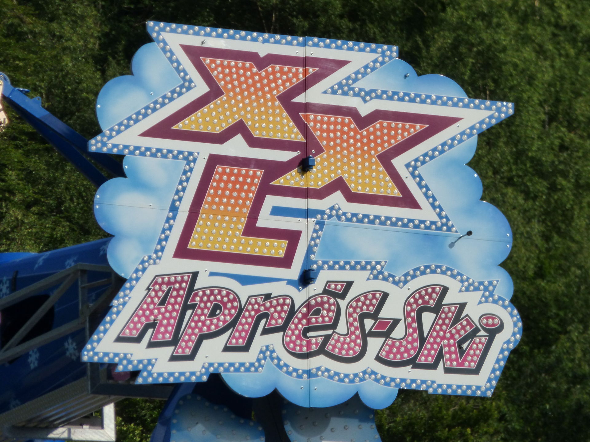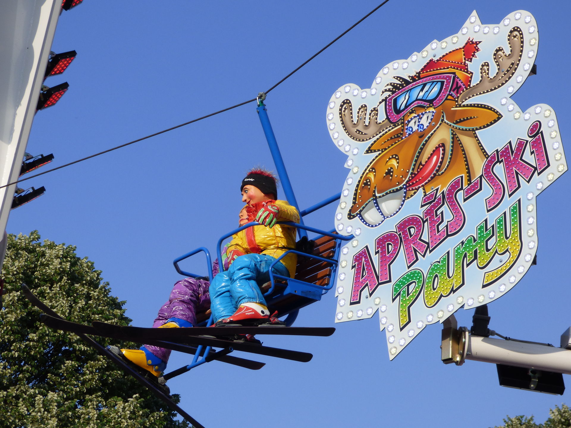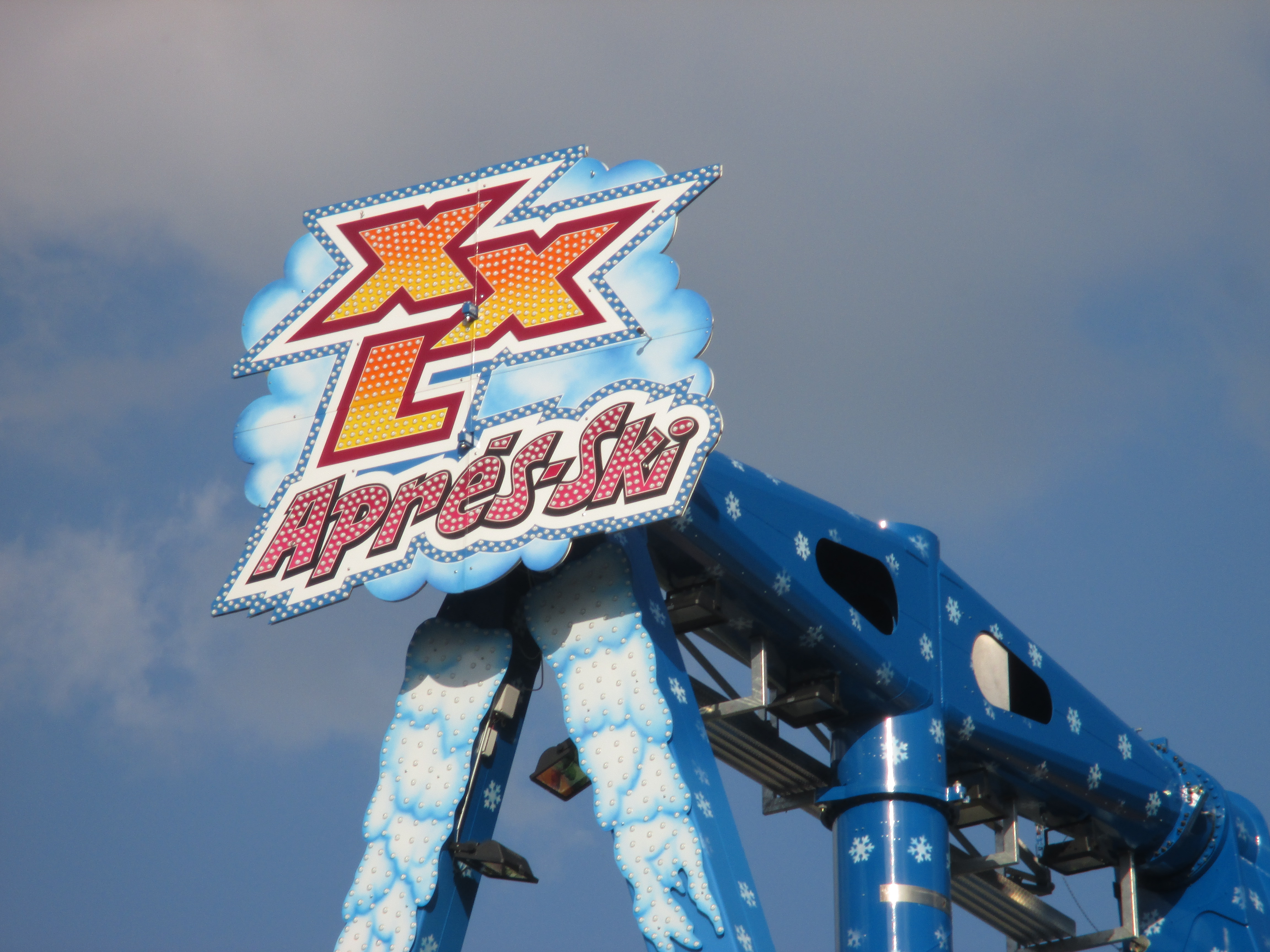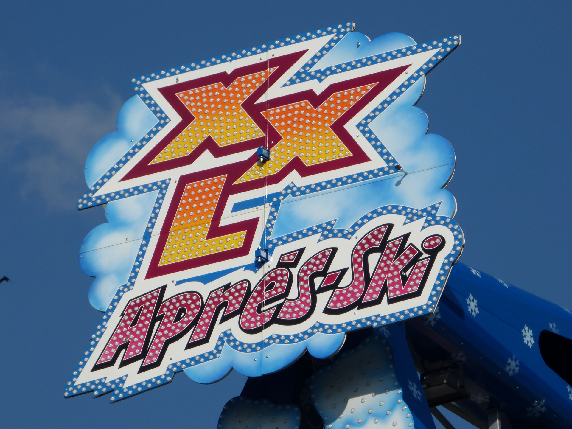 Damit hatten wir den großen Platz auch durch und machten uns auf den Weg auf die Meile, die zwischen Wupper und Stadion herführte. Dort trafen wir als erstes auf die Hauptattraktion auf der diesjährigen Megakirmes, den XXL Aprè Ski. Optisch ein absolutes Highlight mit Party Thematisierung. Und wenn man das Thema Après Ski für sein Geschäft wählt, dann muss man das auch ordentlich beschallen. Helene Fischer, Peter Wackel, Axel Fischer, es lief das komplette Programm. Der Fahrpreis lag bei 5 Euro.