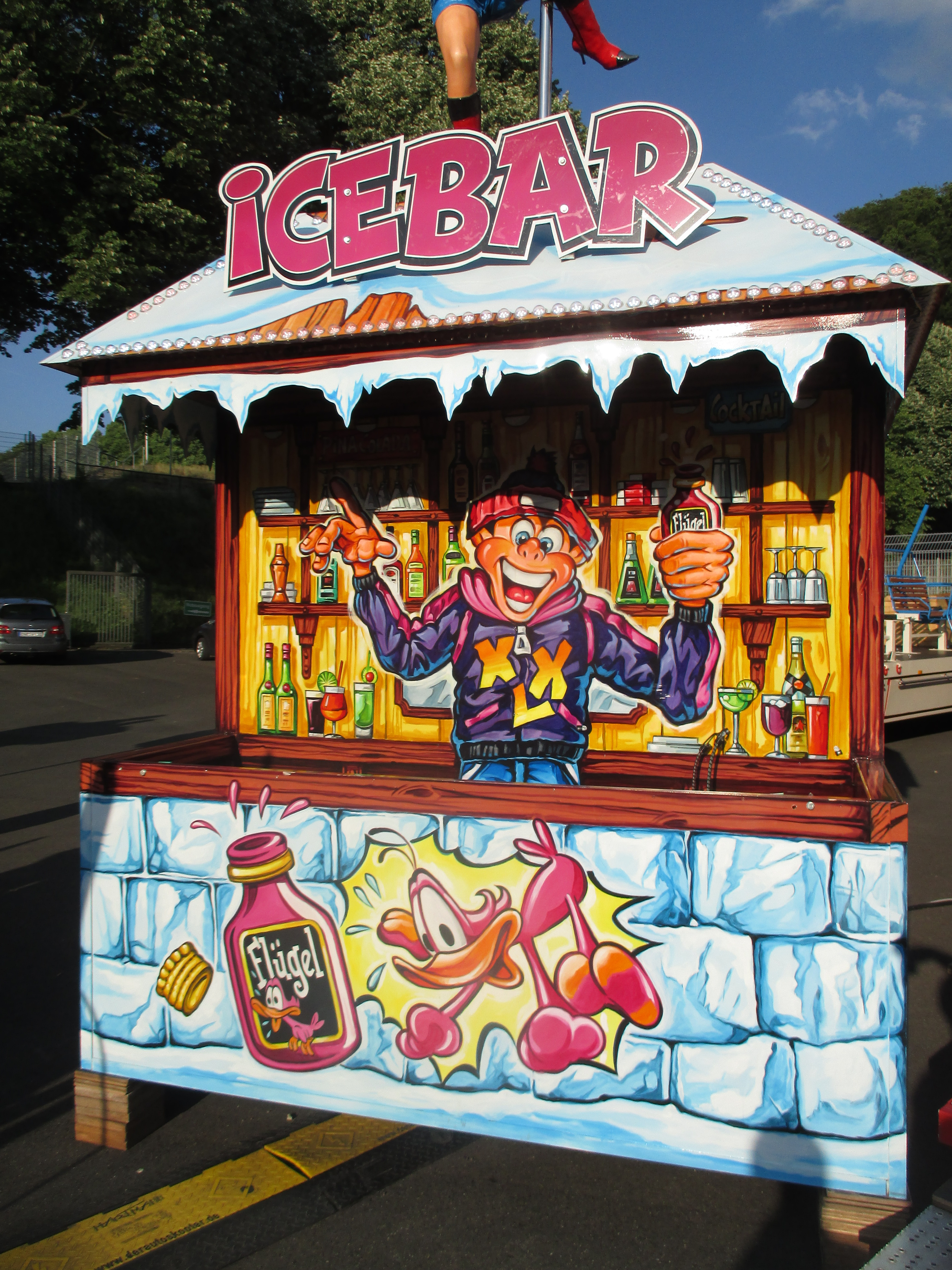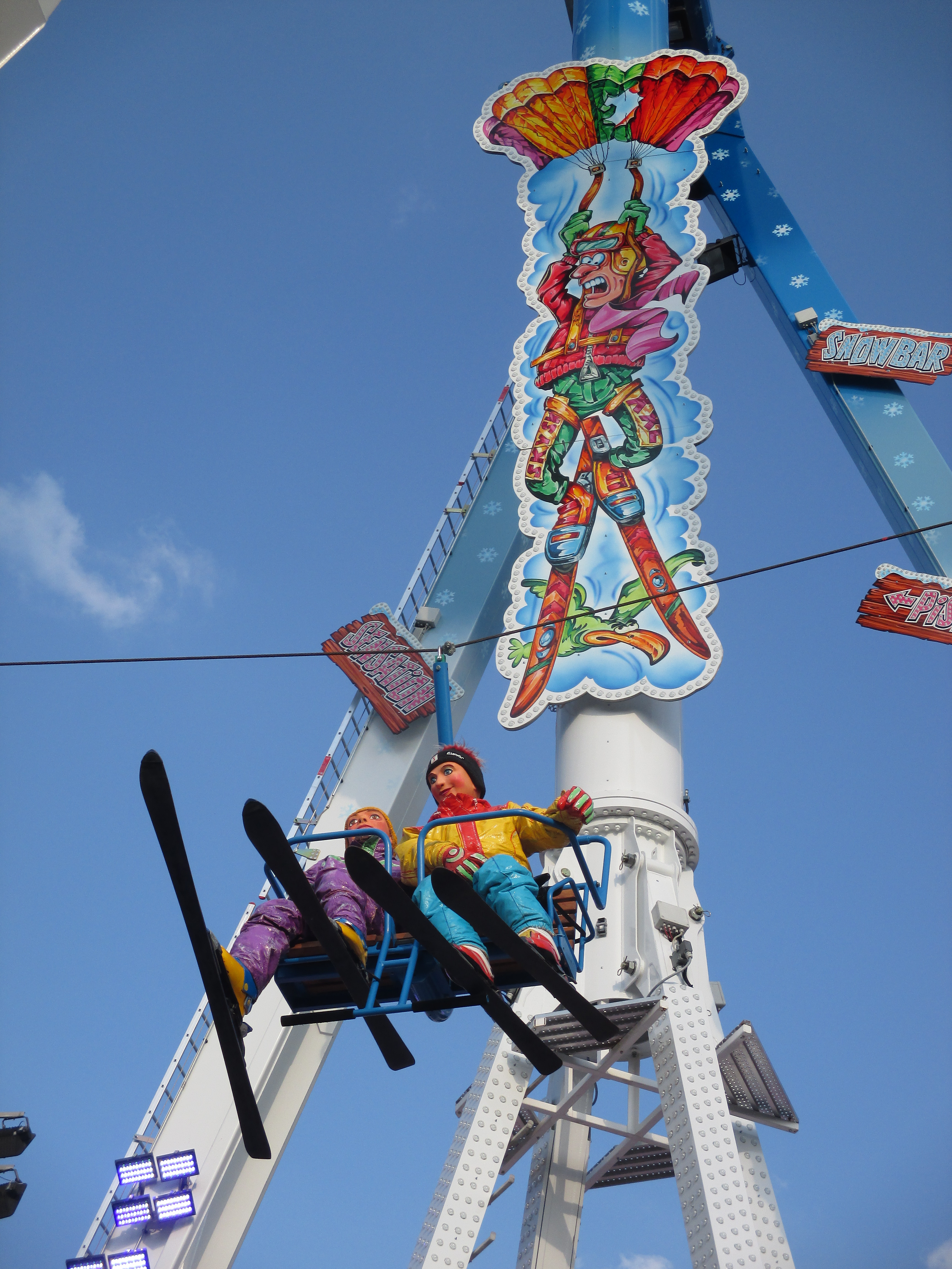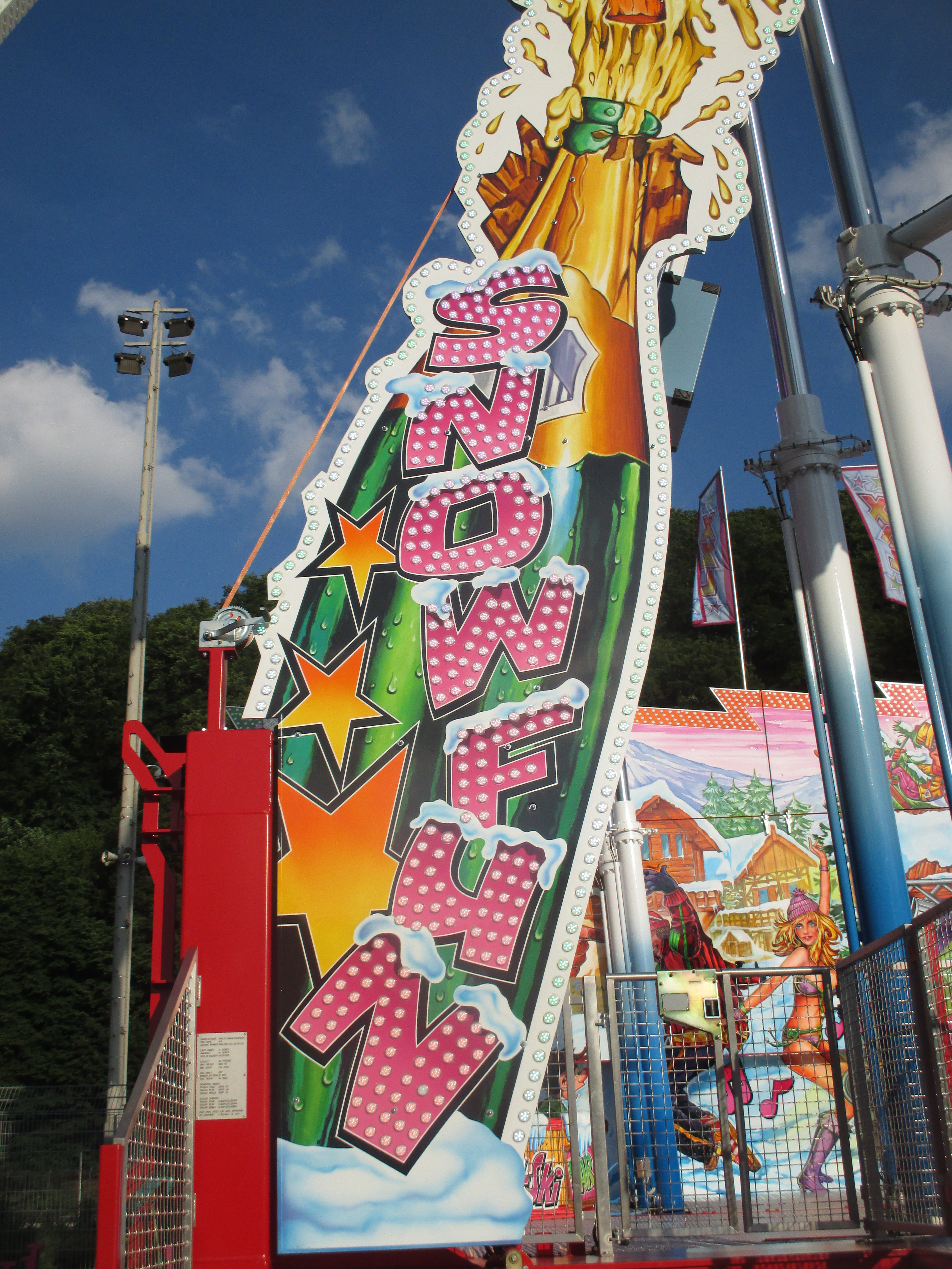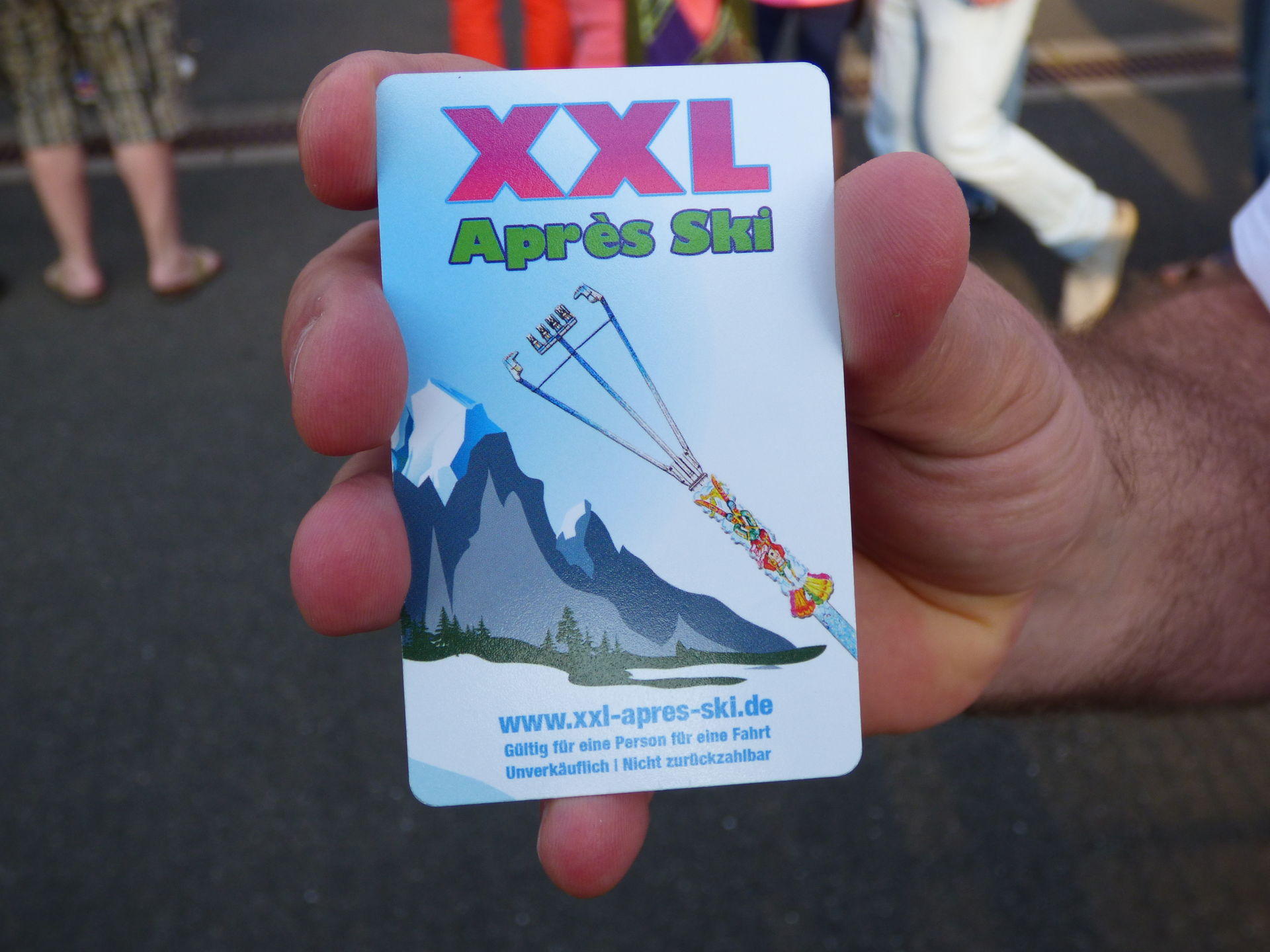 Damit hatten wir den großen Platz auch durch und machten uns auf den Weg auf die Meile, die zwischen Wupper und Stadion herführte. Dort trafen wir als erstes auf die Hauptattraktion auf der diesjährigen Megakirmes, den XXL Aprè Ski. Optisch ein absolutes Highlight mit Party Thematisierung. Und wenn man das Thema Après Ski für sein Geschäft wählt, dann muss man das auch ordentlich beschallen. Helene Fischer, Peter Wackel, Axel Fischer, es lief das komplette Programm. Der Fahrpreis lag bei 5 Euro.