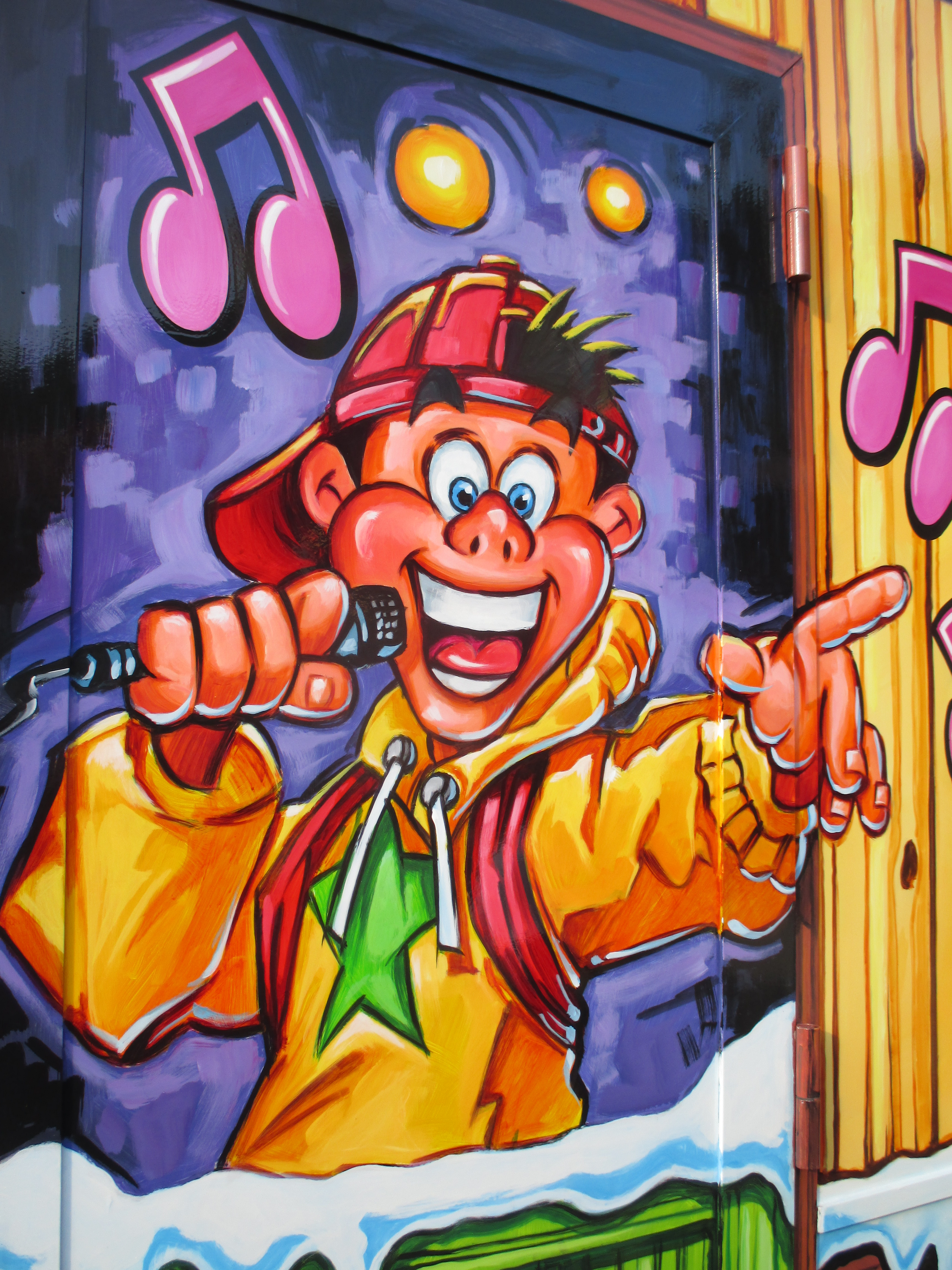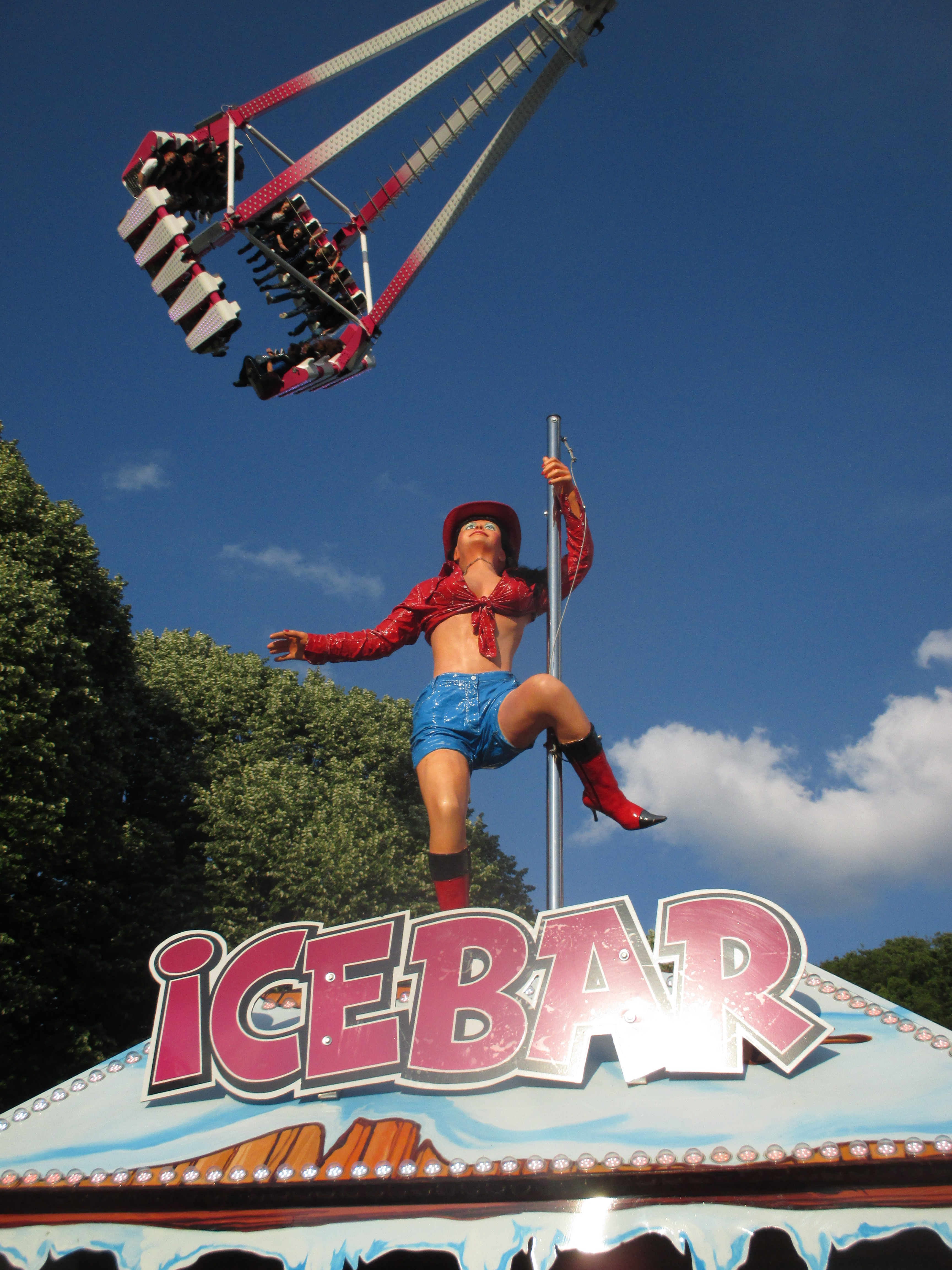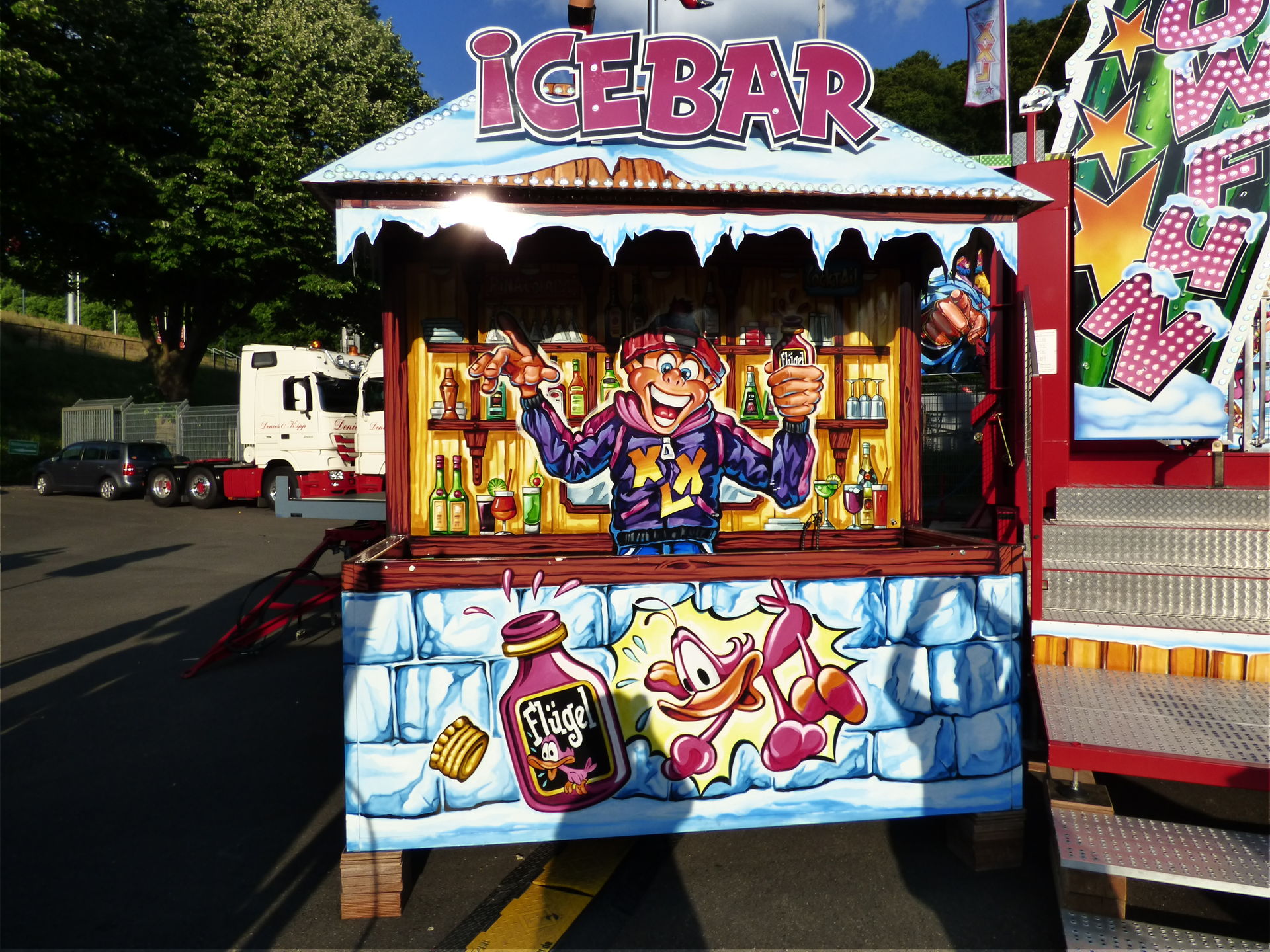 Damit hatten wir den großen Platz auch durch und machten uns auf den Weg auf die Meile, die zwischen Wupper und Stadion herführte. Dort trafen wir als erstes auf die Hauptattraktion auf der diesjährigen Megakirmes, den XXL Aprè Ski. Optisch ein absolutes Highlight mit Party Thematisierung. Und wenn man das Thema Après Ski für sein Geschäft wählt, dann muss man das auch ordentlich beschallen. Helene Fischer, Peter Wackel, Axel Fischer, es lief das komplette Programm.
