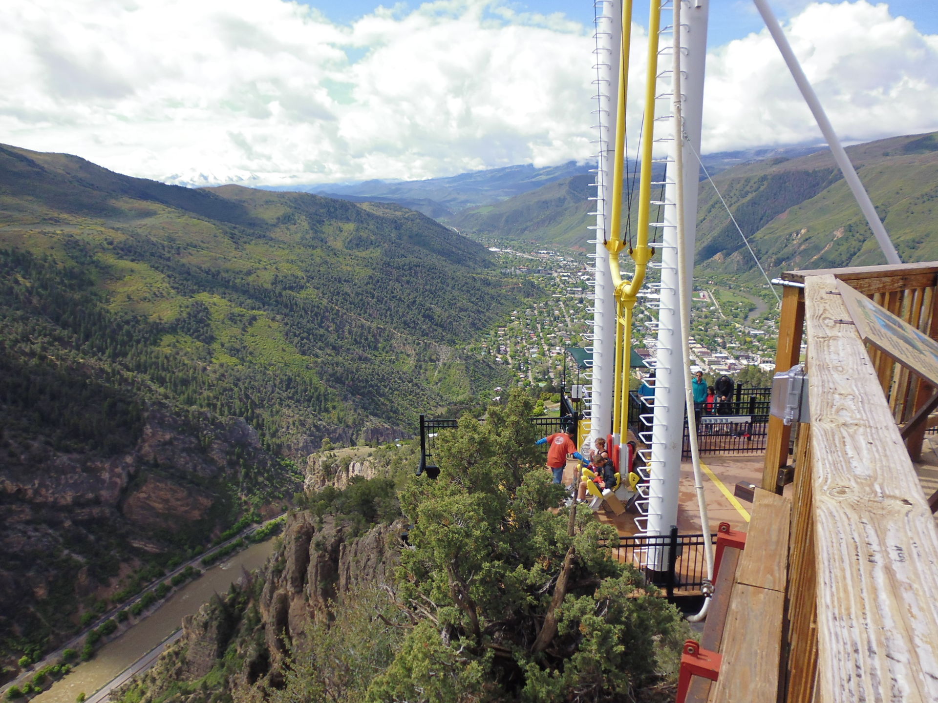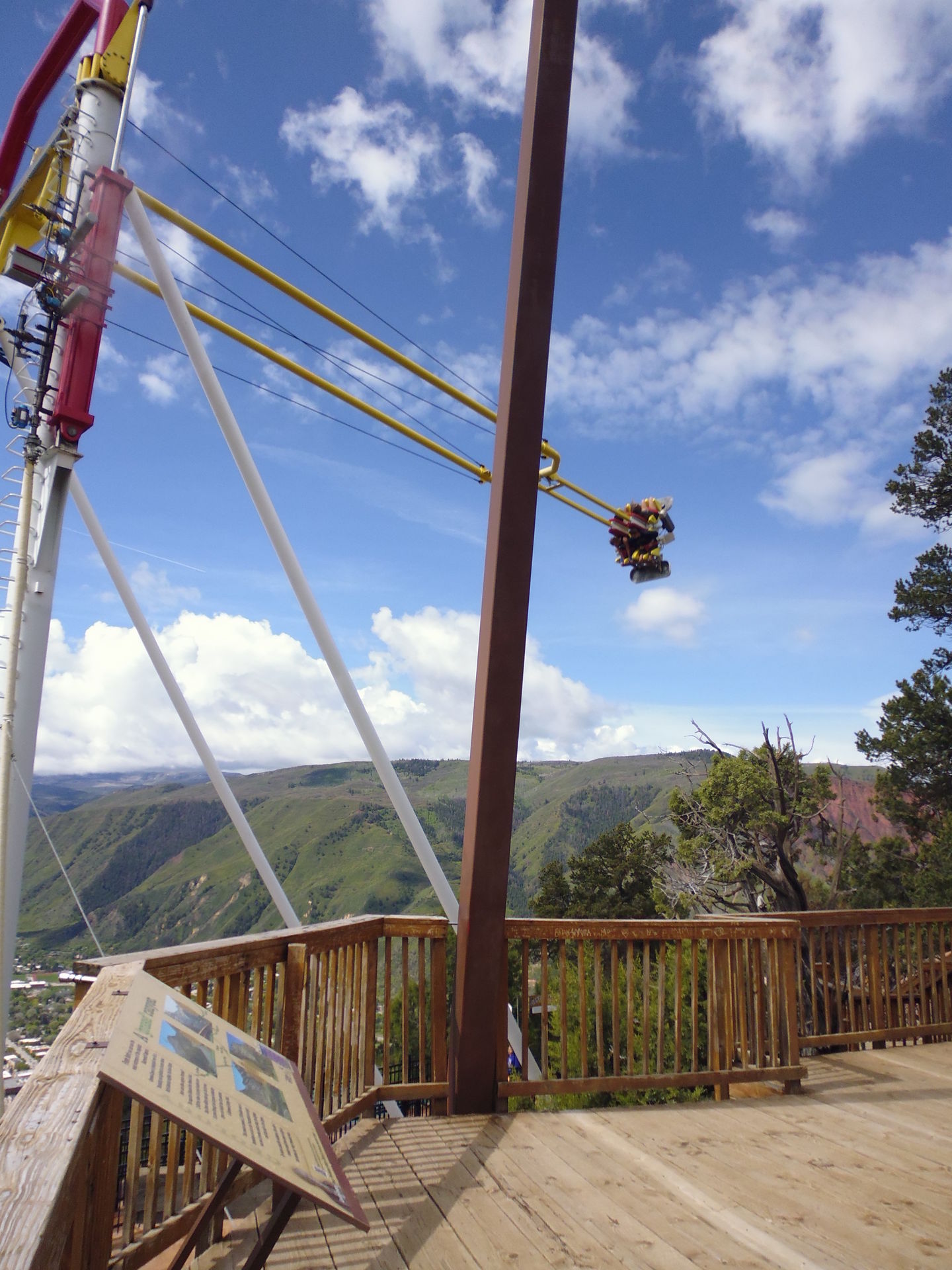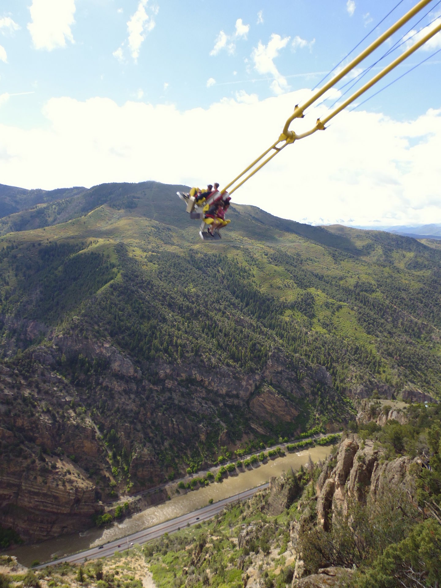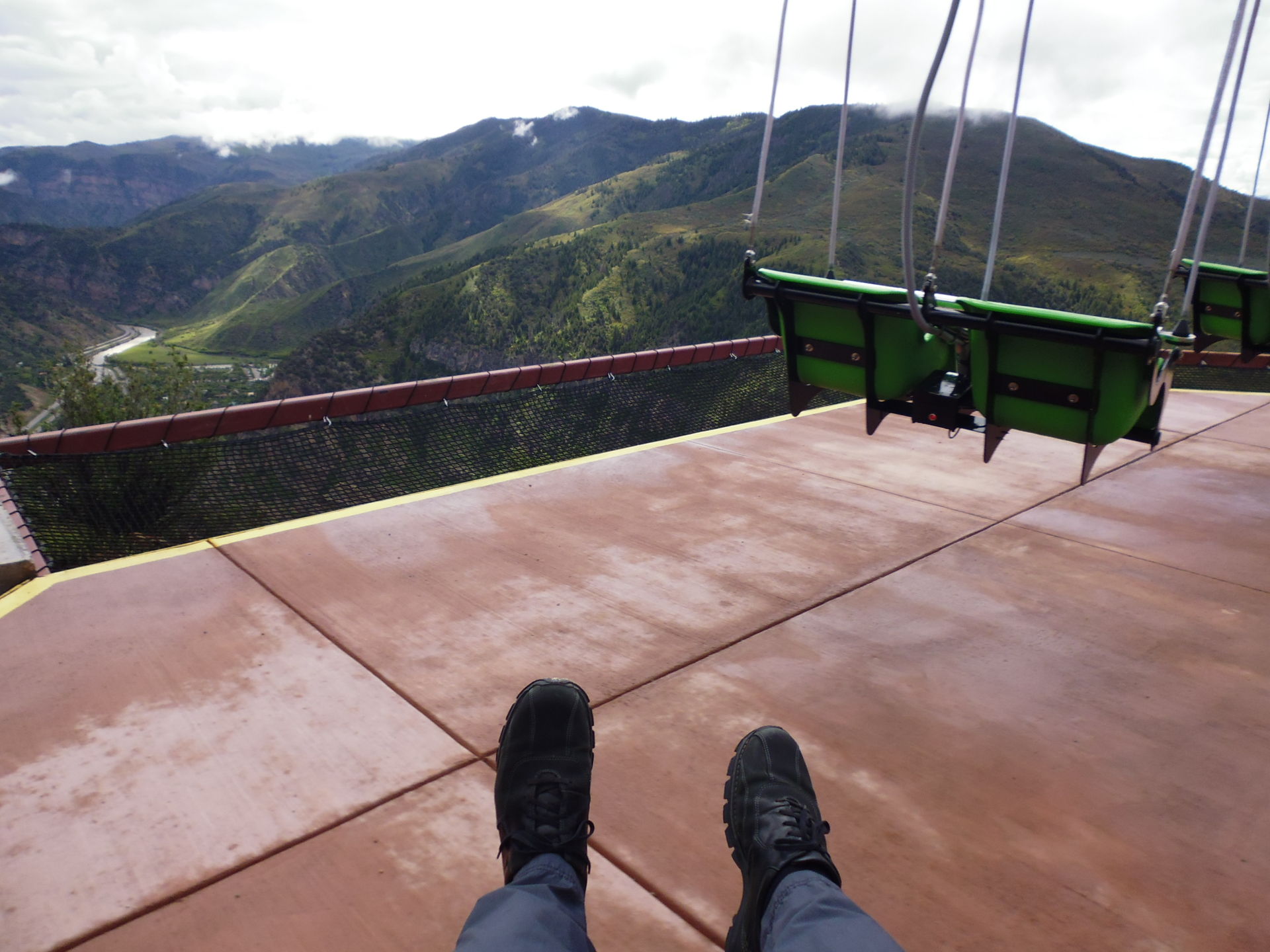 ganz Dummes: man blickt nach vorn - auf das kilometerweit reichende Panorama zum Glenwood Canyon!!! Und bevor man sich der Überwältigung überhaupt bewusst ist, schwingt die Schaukel mit der Höchstgeschwindigkeit von 80 km/h