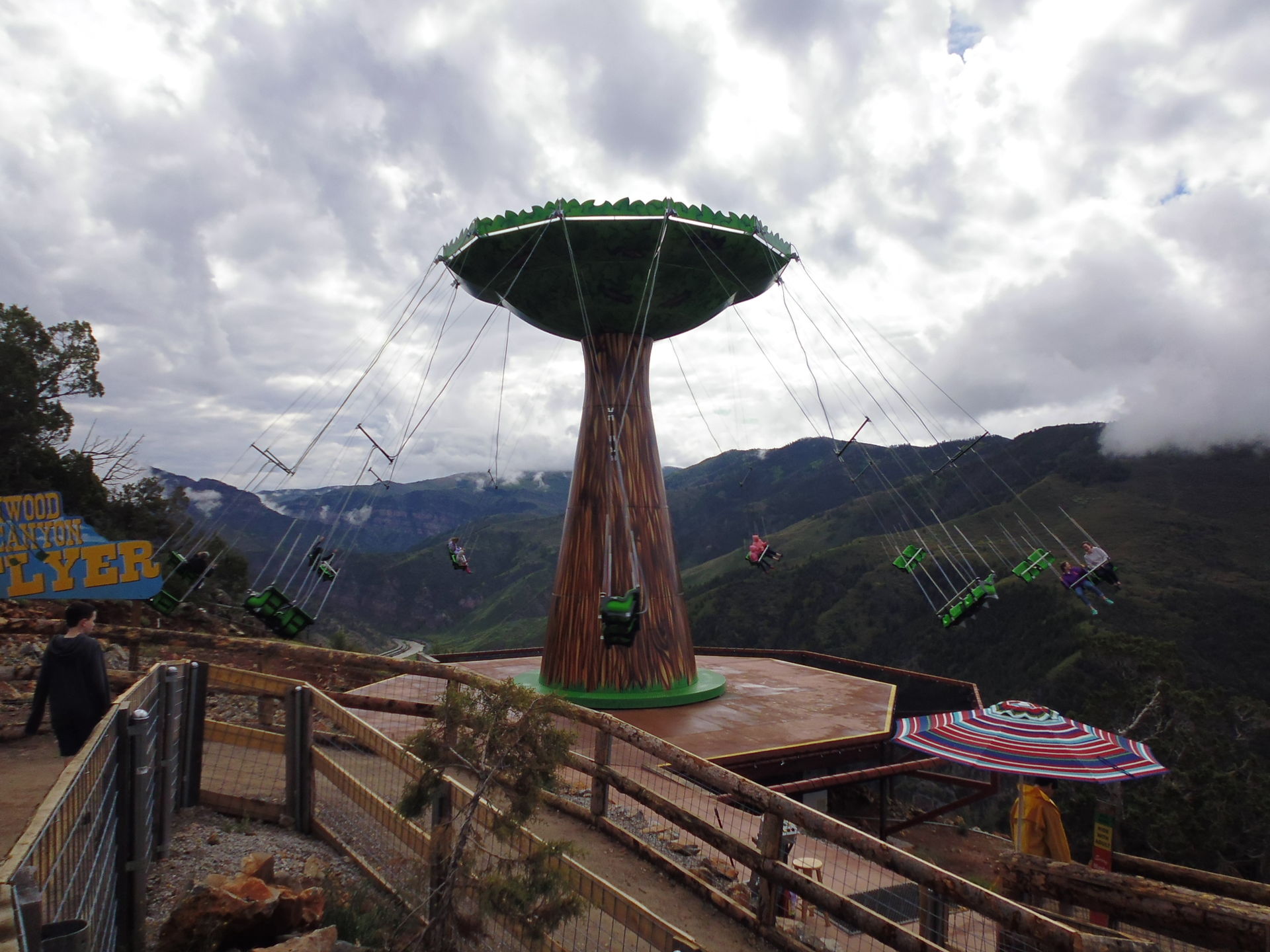 Nach den anderen beiden Kandidaten dürfte dieses einfache Kettenkarussell ja nun ein Klacks sein, dachte ich mir und bestieg sogleich einen der Doppelsitze. Gesichert wird man hier mit einer gemeinsamen Bügelstange für beide Plätze und je einem individuellen Gurt, der zwischen den Beinen der Fahrgäste eingeklickt wird. Bald fing die Konstruktion dann an zu rotieren, so dass die Beladeplattform und das Sicherheitsnetz langsam aber sicher aus dem Blickfeld verschwanden. Tja... Wie war das noch gleich von wegen nach dem Giant Canyon Swing dürfte mich so leicht nichts mehr schocken? Pustekuchen! Irgendwann hat man nämlich eine solche Schräglage erreicht, dass man über gute drei Viertel des Rundkreises wieder nur mit der atemberaubenden Schluchtenansicht konfrontiert ist. In klassischen Kettenkarussell-Sesselchen sitzend. Kombiniert mit der konstanten Drehbewegung reicht das aus, um totales Schwindelgefühl auszulösen. Irgendwie sieht man den Berg auf der gegenüberliegenden Talseite bei jeder Runde nach rechts absinken, so taumelig und wirr ist einem alsbald! Hinzu kommen auch hier Fahrtwindstränchen und die chillige Bergluft - und schon hat man Höhenrausch Nr. 5 innert einer Stunde!