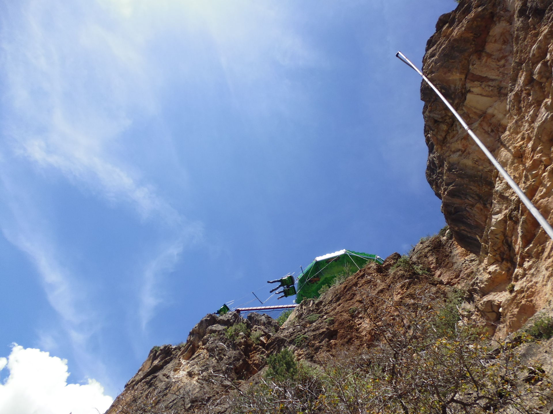 Kein Wunder hat das Teil durch diverse Adrenalintourismus-Reportagen weltweite Berühmtheit erlangt. Schon beim blossen Betrachten rutscht einem hier voll das Herz in die Hose. Daher fotografierte und beobachtete ich zunächst aus sicherer Distanz erst einmal die Premierenfahrten an diesem Tag. Es sass immer derselbe junge Mann drin und brüllte sich begeistert die Seele aus dem Leib.