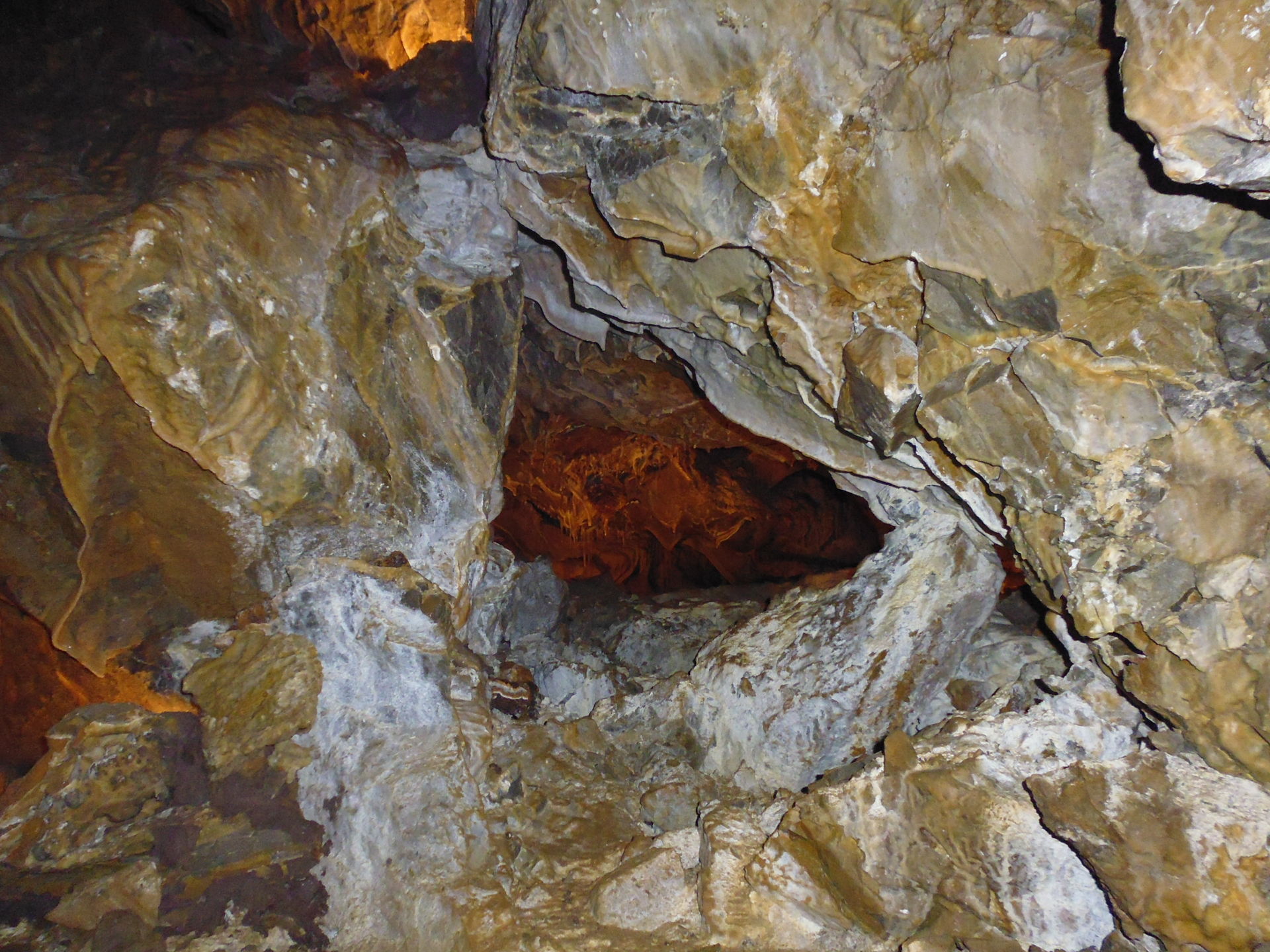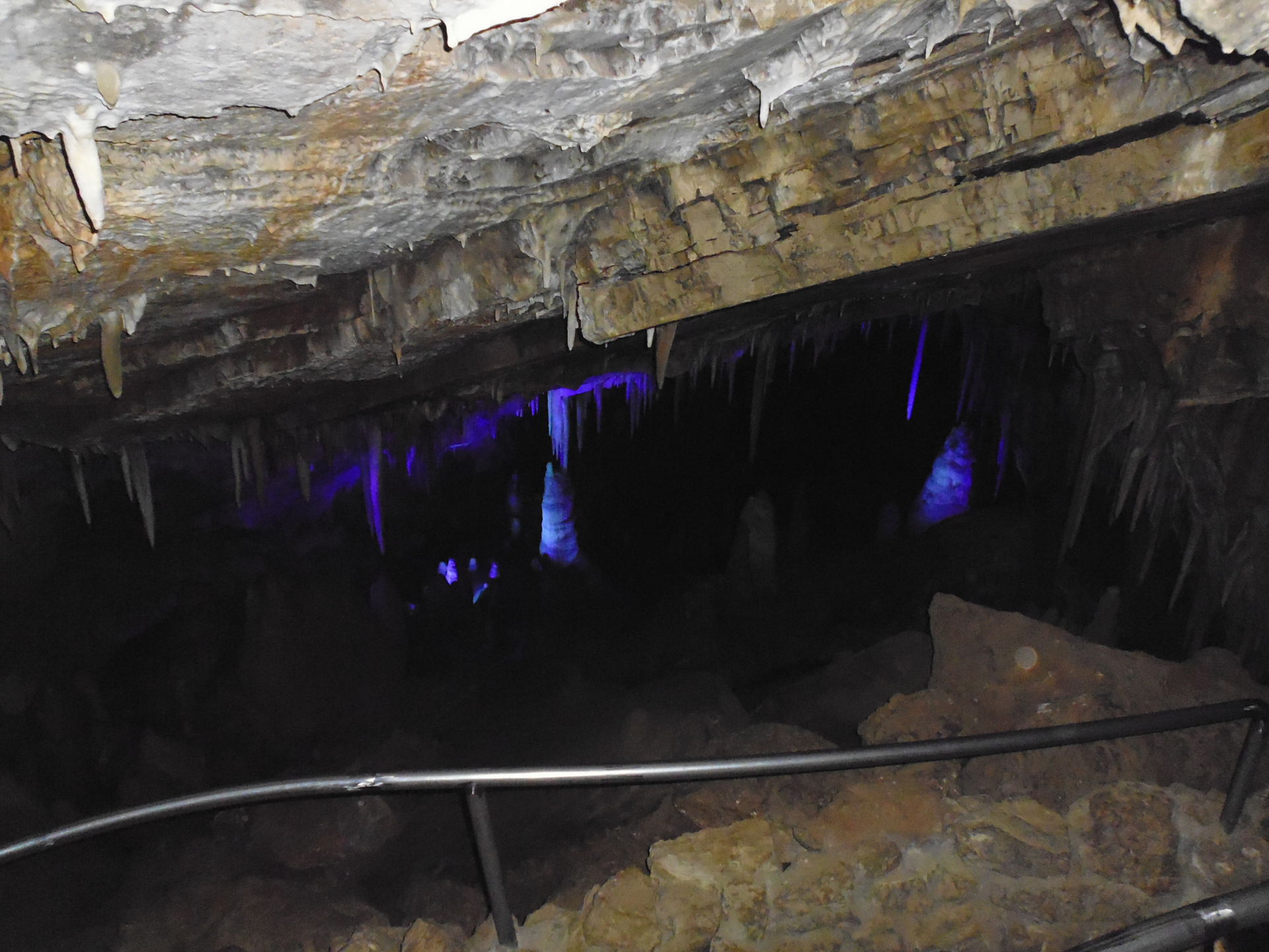 Mit nochmaligem Lichtausknipsen wird noch der fluoreszierende Effekt einiger Steine hier unten demonstriert, danach werden im Rahmen einer kurzen Beleuchtungs-Showsequenz einige der schönsten Gebilde noch verschiedenfarbig beleuchtet.