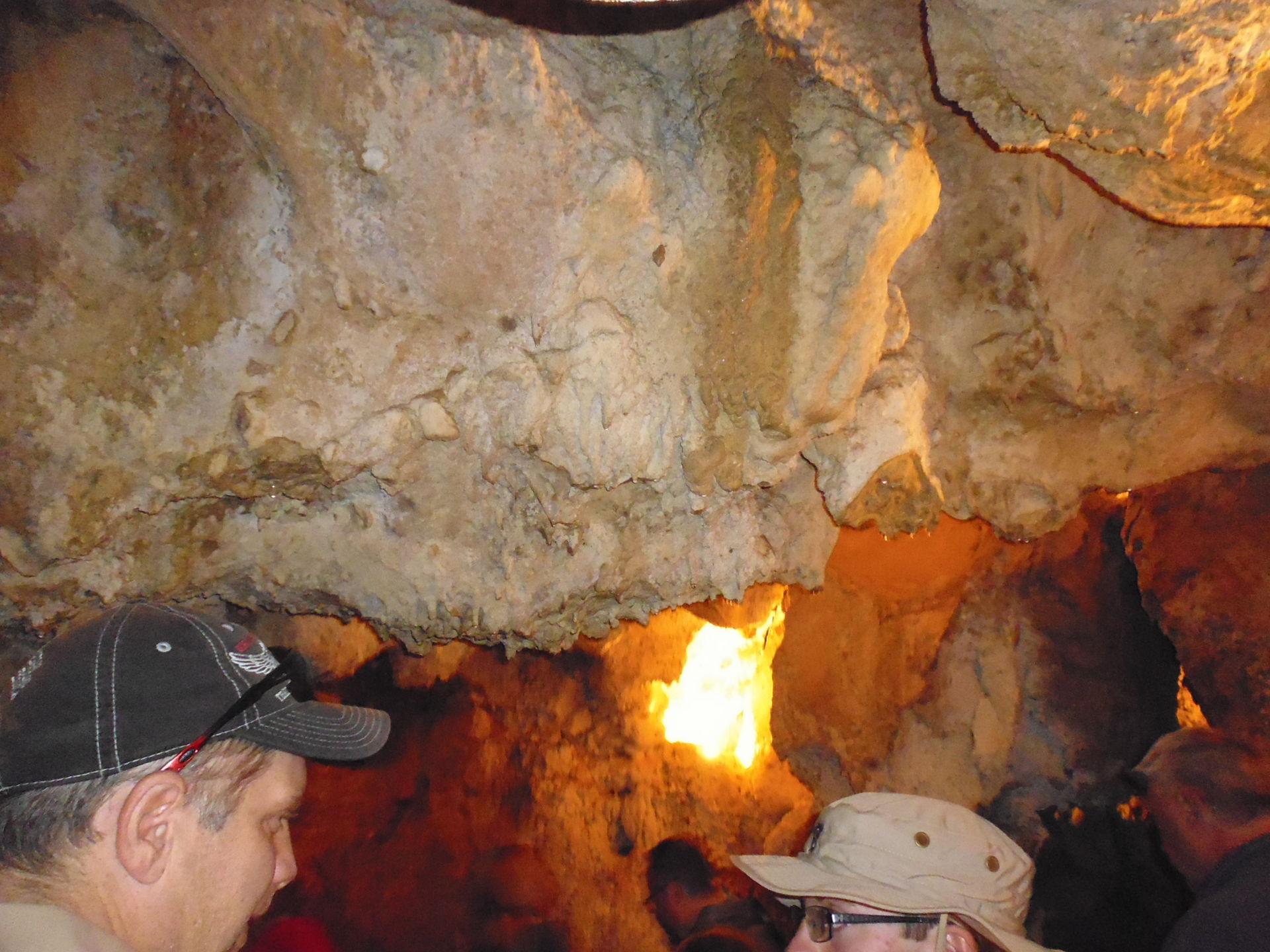 Daraufhin gab es auch hier nochmals eine Demonstration des fluoreszierenden Gesteins - und hierauf wurde die Tour nur mit einer Kerzenfackel im Dunkeln weitergeführt. Die Ehre diese anzuzünden bekam eine Frau namens Maureen, die an dem Tag Geburtstag hatte. Beim obligatorischen Ständchen der ganzen Gruppe wussten alle nicht so recht, ob man ihren Namen im Rahmen des Liedverses jetzt auf der ersten oder der zweiten Silbe betonen muss, was eine heitere Lachpause ergab.