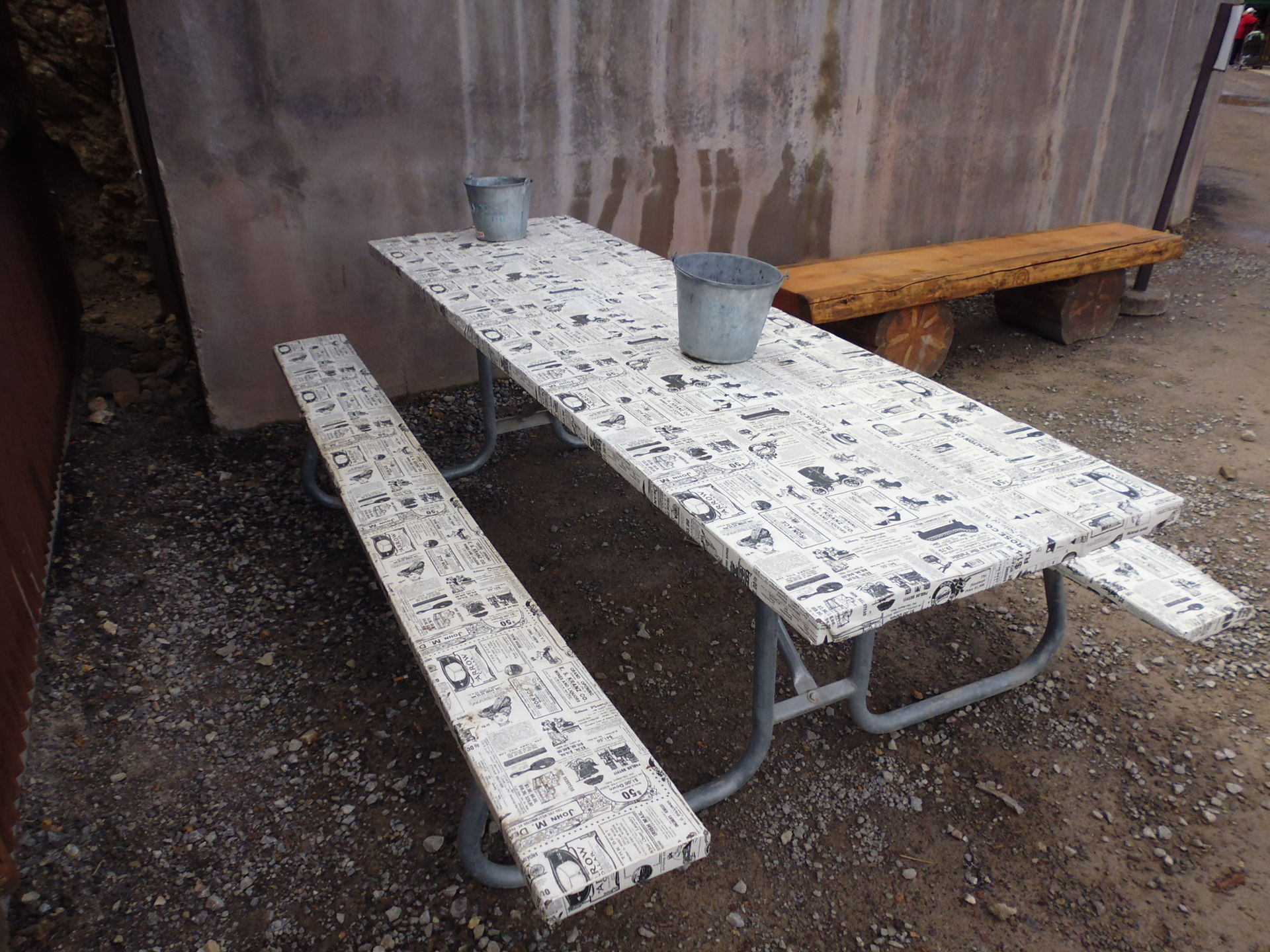 Diese "zeitungsausgekleideten" Picknicktische gibt es überall im Park.