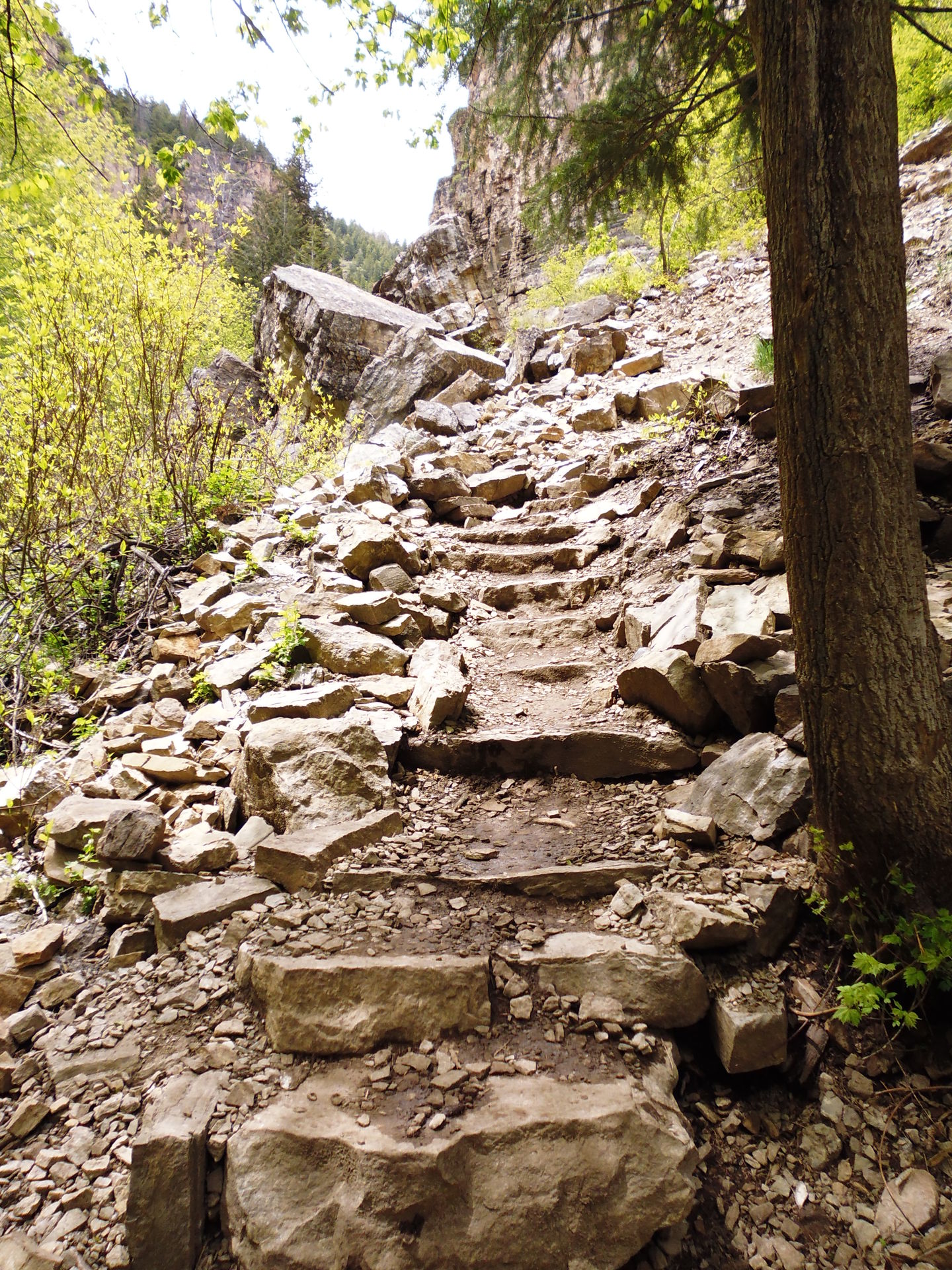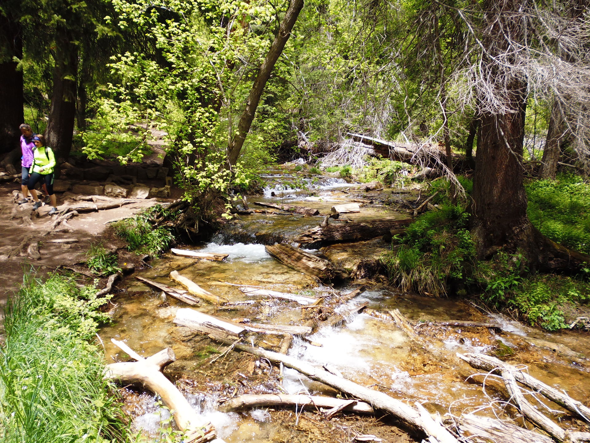 Beim Mündungspunkt des Dead Horse Creeks trennt sich dann die Spreu vom Weizen und die Hündeler und Spazierer von den Wanderern: ab hier geht es über wüstesten Stock und Stein jetzt nur noch aufwärts - und nicht zu knapp. Bei lediglich 800 Metern Luftlinie Entfernung zum Ziel steigt der Pfad, wenn man dem überhaupt so sagen kann, nämlich stolze 325 Meter an. Der Trail ist zwar als schwierig klassifiziert, aber laut Tripadvisor und Konsorten wohl vor allem auch deshalb, um nicht noch mehr Touristen anzulocken - das enge Bachtobel bietet nicht übermässig viel Platz zum Kreuzen. Dieser Vermutung würde ich jetzt mal halbwegs zustimmen, da ich den Pfad zwar durchaus als anspruchsvoll, in gutem Schuhwerk aber problemlos zu bewältigen bezeichnen würde. Genau da hab ich mich wirklich wieder über die Amis gewundert - was man hier alles an den Füssen gesehen hat! Hallen-Turnschuhe mit Gummisohle, Ballerinas, Hello-Kitty-Sandalen und sogar ein Paar glänzende opahafte Loafers. Ich hab mir gedacht, das wird sich nach oben hin wohl etwas ausdünnen, da der vorgegebene Weg wirklich überhaupt nicht für sowas geeignet ist, aber denkste! Bis ganz nach oben zum Ziel und auf dem gesamten Rückweg hat man immer wieder Footwear-Kopfschüttel-Kandidaten erblickt.