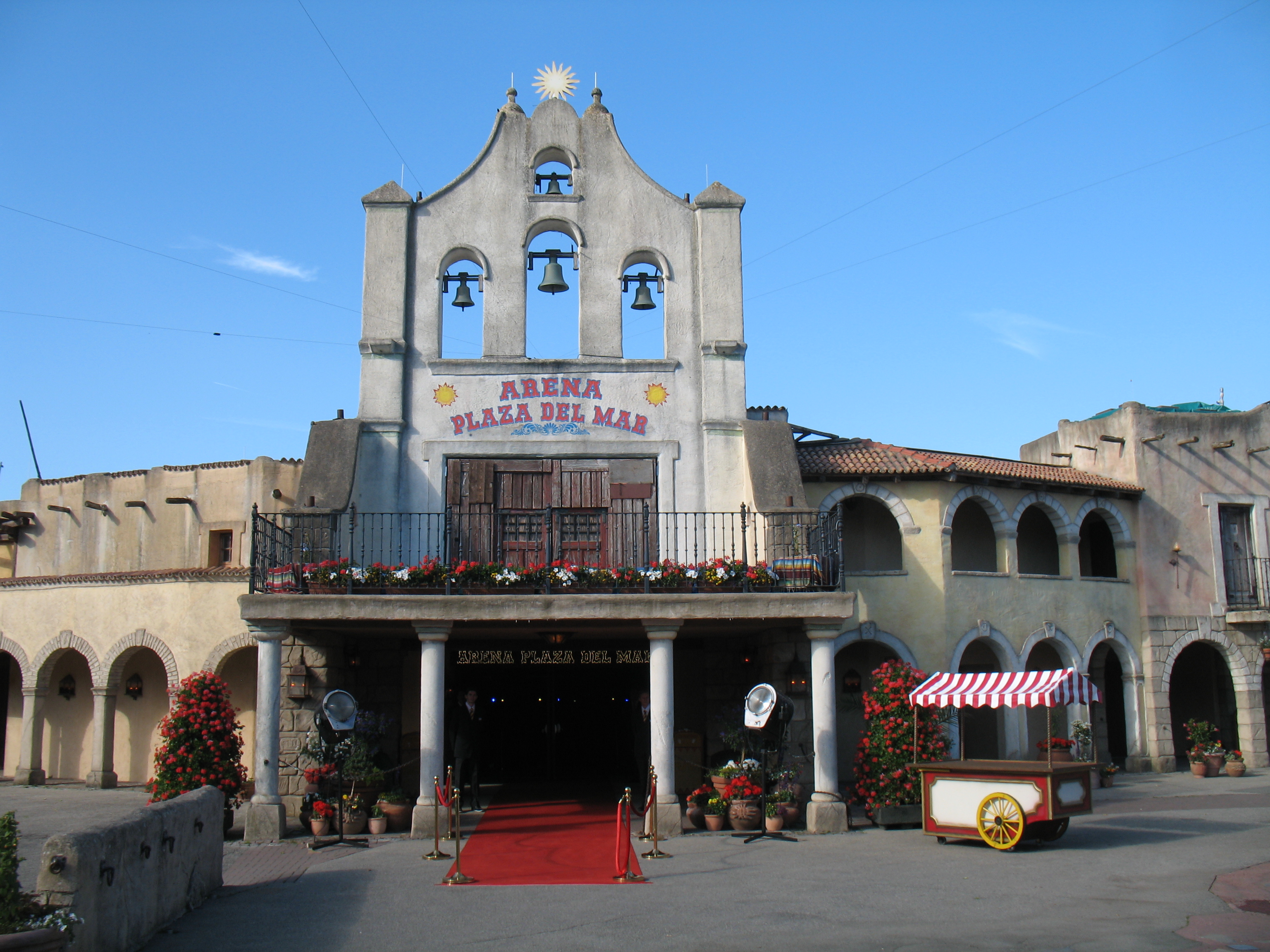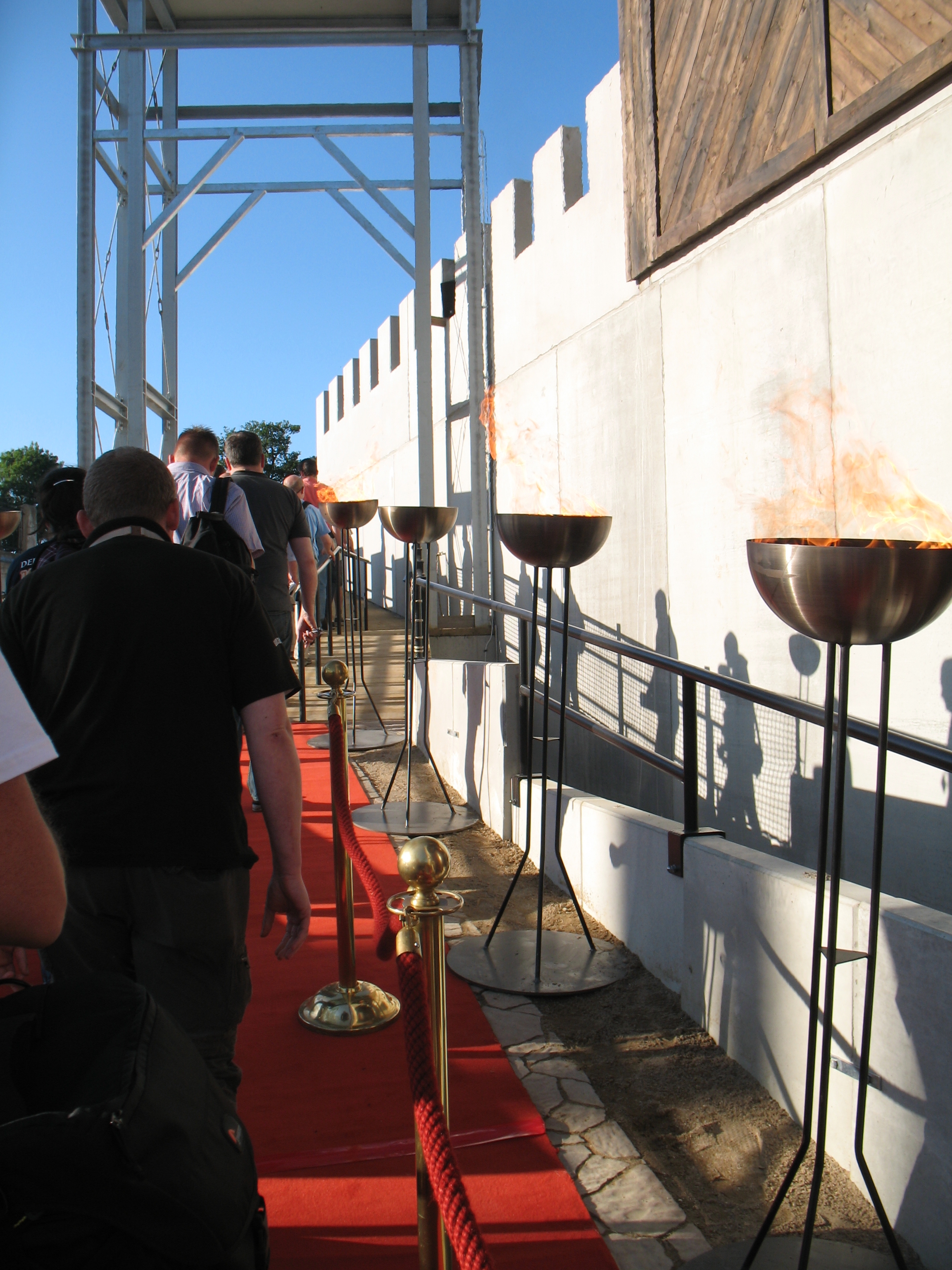Kurz nach 18:00 Uhr ging es dann angeführt von Herrn Leicht, seiner sympathischen Frau sowie einigen Park-Mitarbeitern durch das Holstentor in den Park (sehr zur Verwunderung der vielen rauskommenden Tagesgäste) und bis zur Plaza del Mar vor dem Showtheater. Dort wurde den Gästen Sekt, Orangensaft und Fruchtspieße (erdbeeren, Melone und Ananas) gereicht. Von dort konnte man schon einmal einen Blick auf den Turm und das Herzelement von Kärnan werfen.