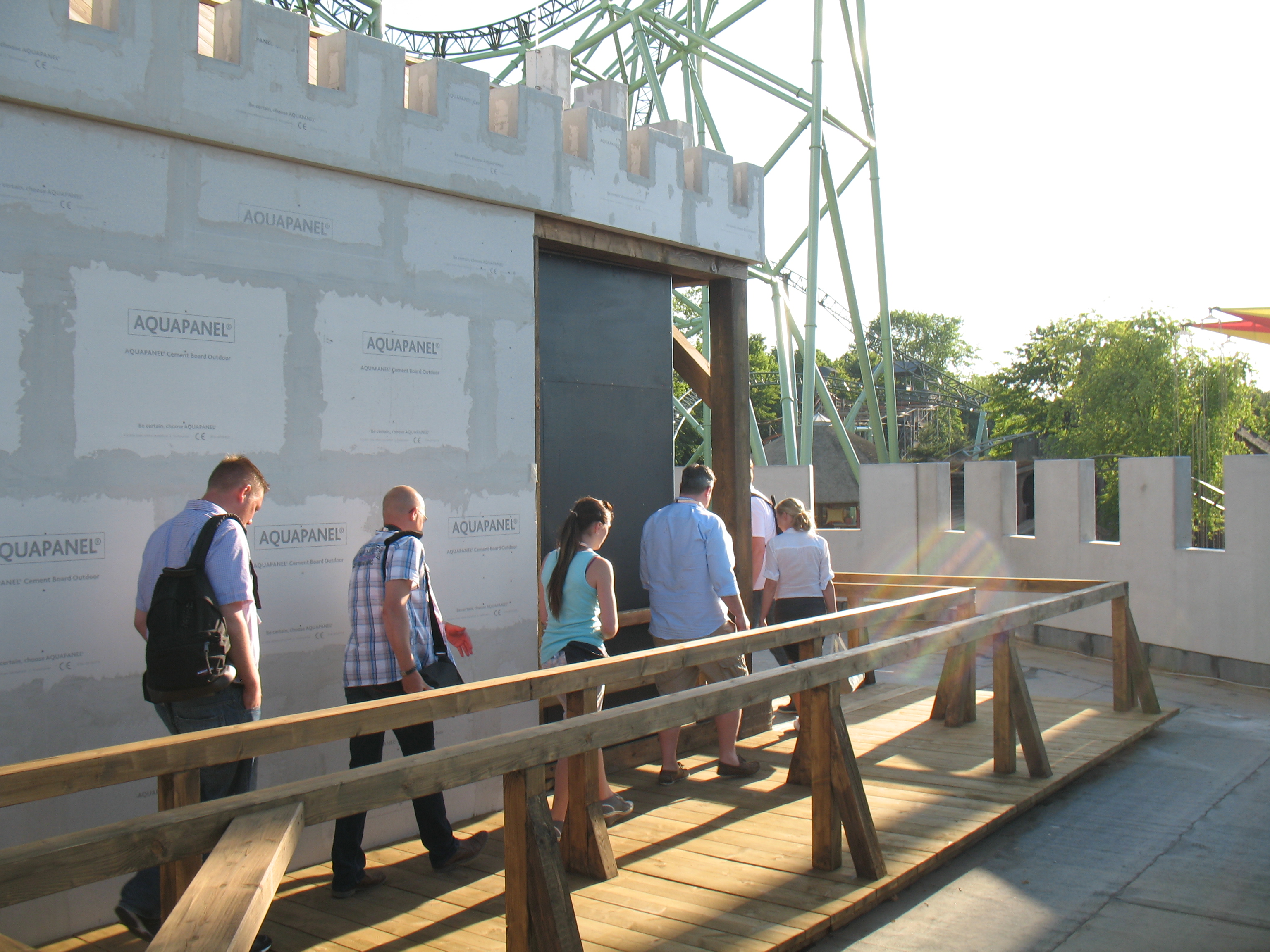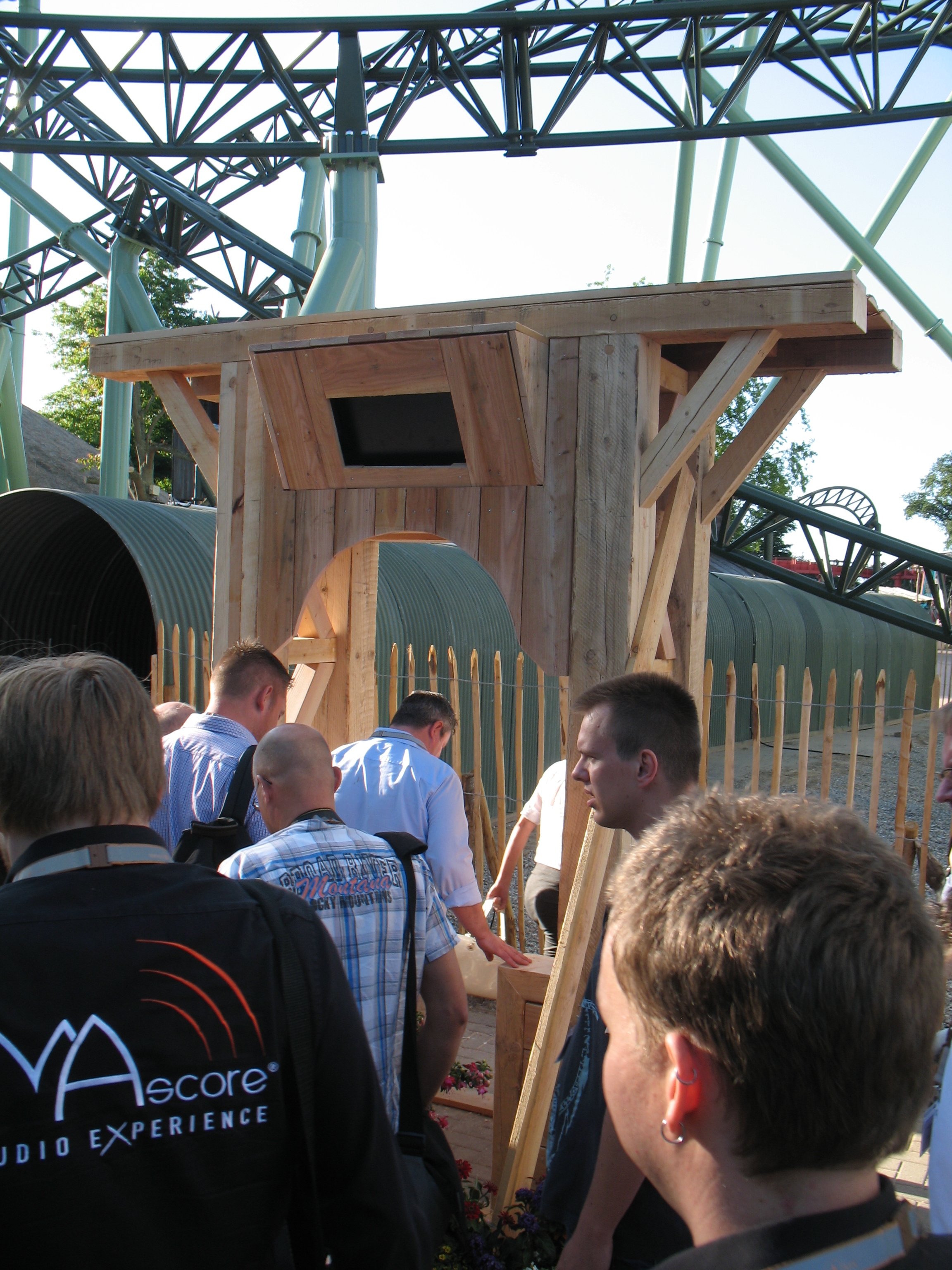 Danach wurden noch kurz die Sicherheitsvorkehrungen erklärt, zu denen auch gehörte, das eigene Onride-Aufnahmen nicht erlaubt waren. Diese werden von einem professionellen Anbieter erstellt und allen beteiligten zur Verfügung gestellt. Danach ging es dann gemeinsam zum Objekt der Begierde, also zum Eingang von Kärnan. Dort Öffnete Her Leicht symbolisch mit einem Schlüssel das Schloss zum Eingang und nach sich entzündenden Feuerschalen und einem Konfetti-Feuerwerk durften alle Gäste die Bahn betreten.