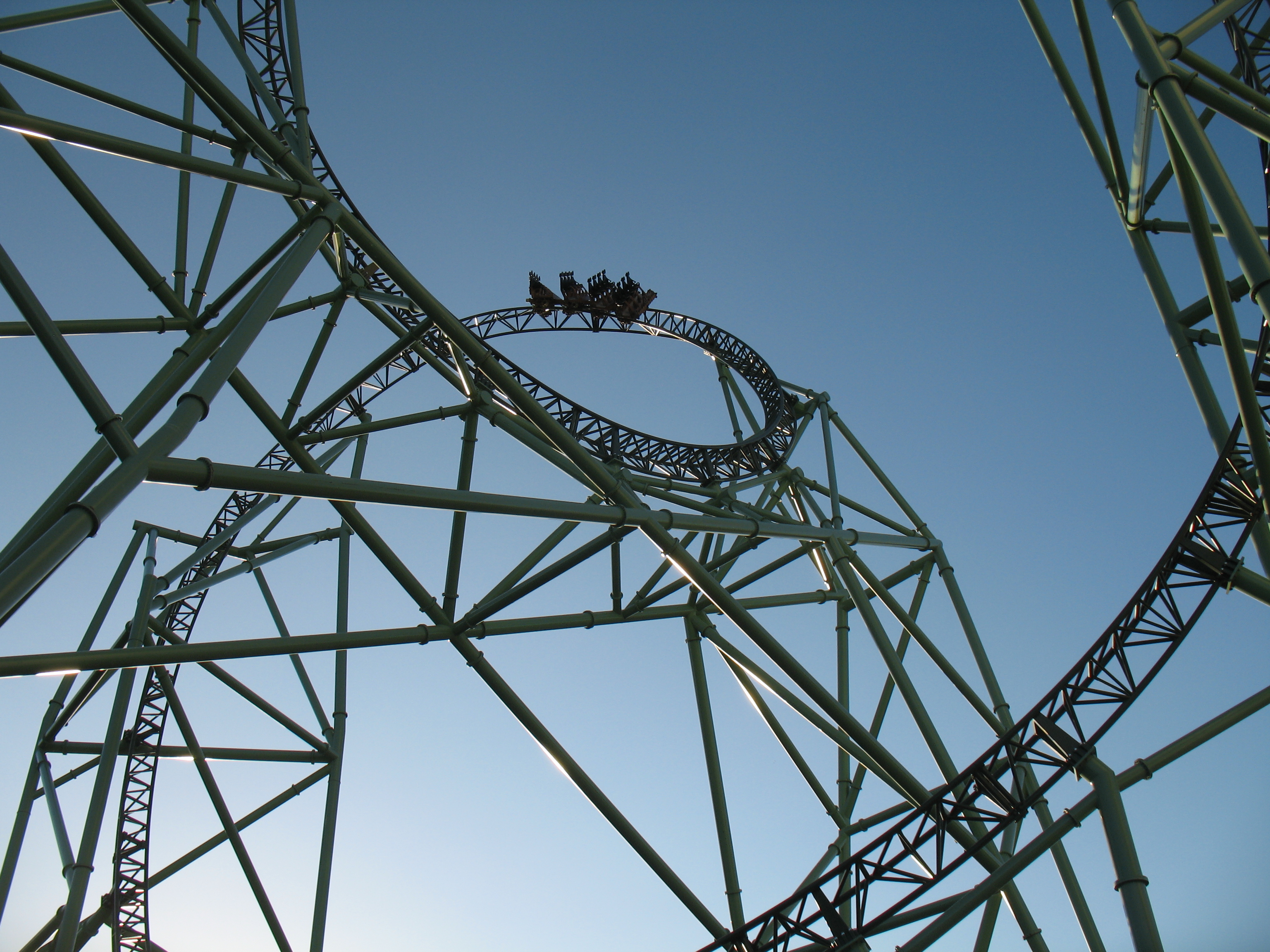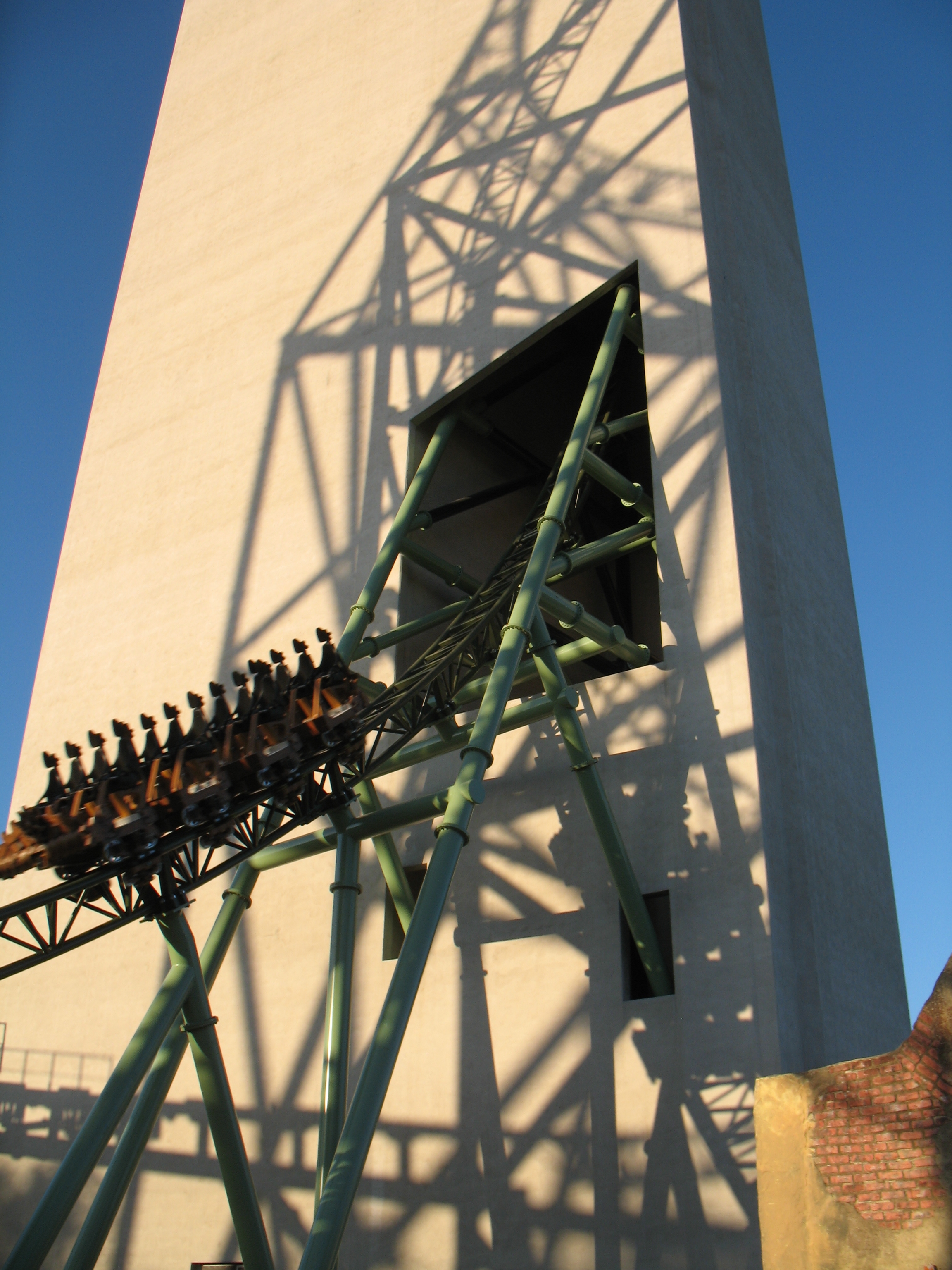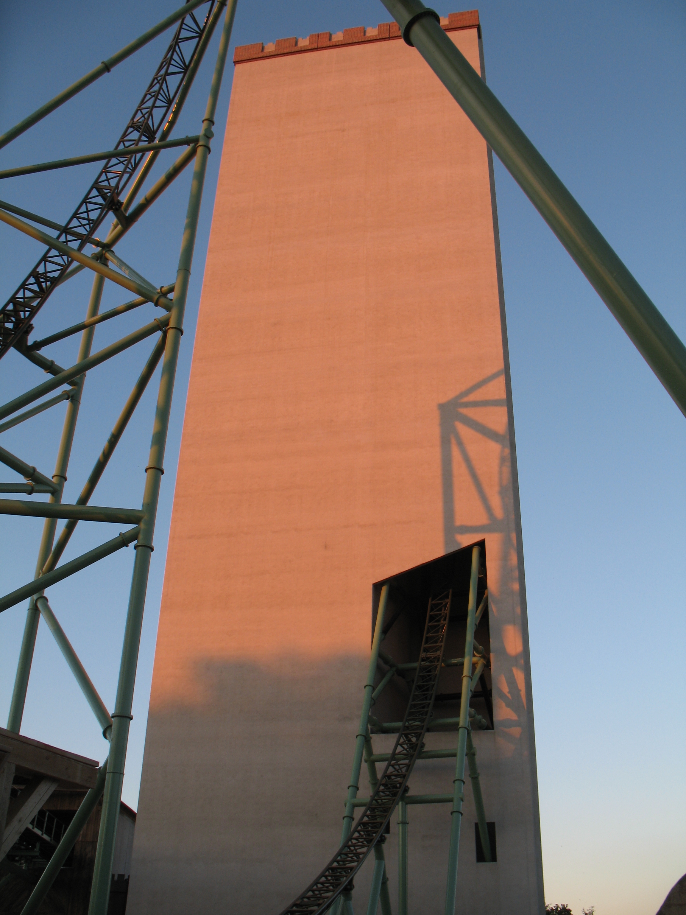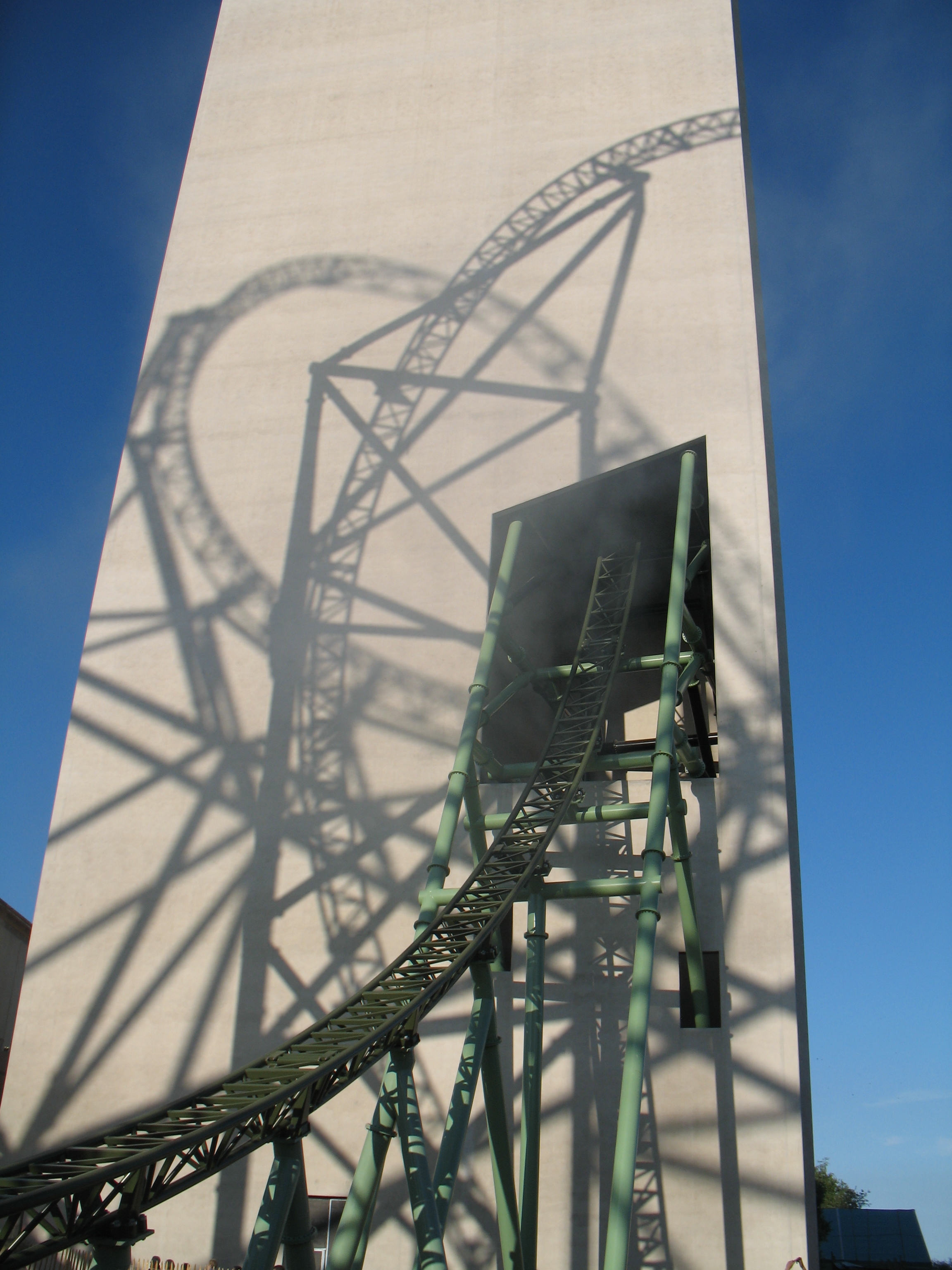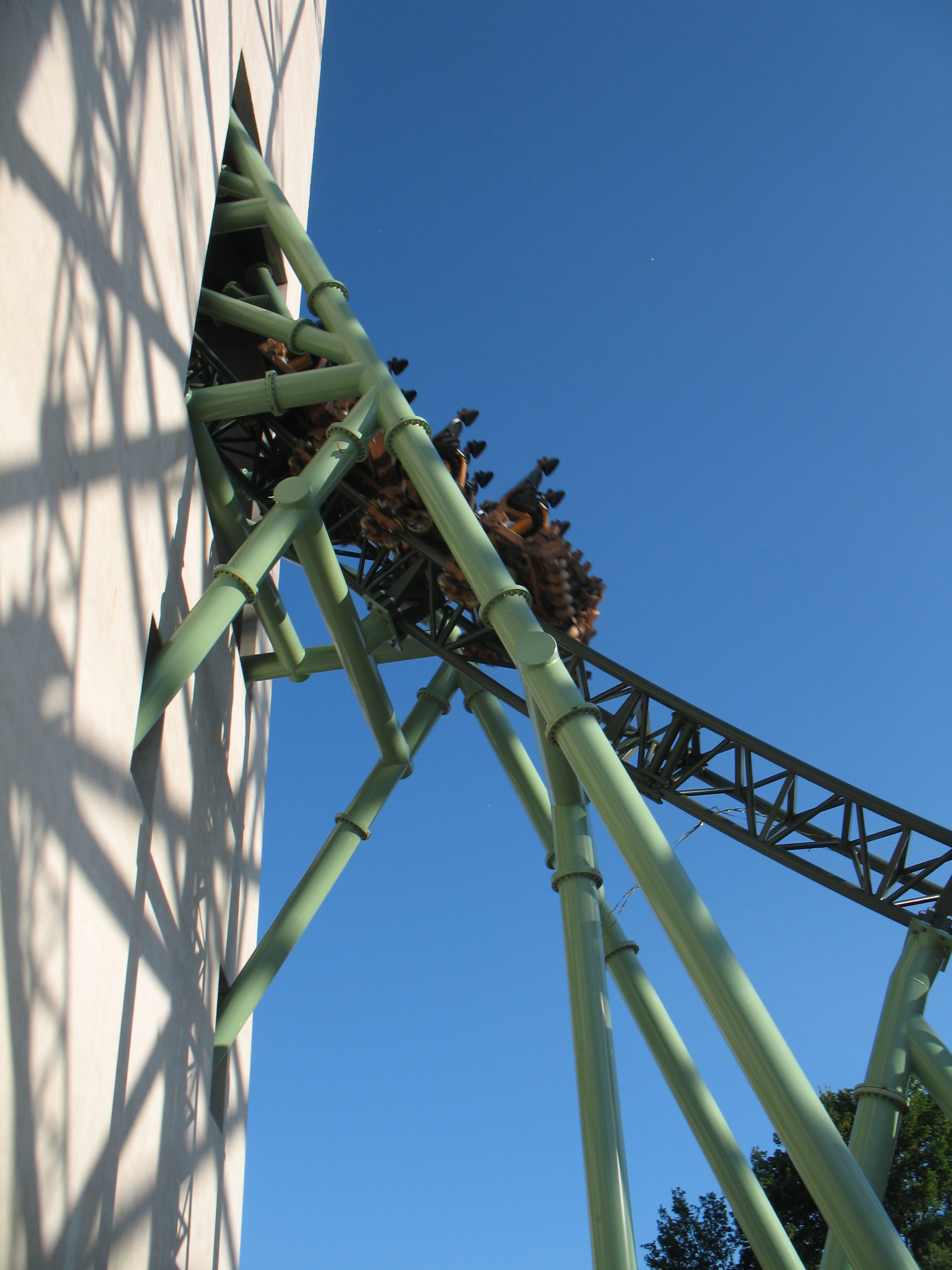 Heartline Roll und deren weiteren Verlauf sehen kann, an dessen Ende es abwärts geht. Man durchfährt eine Senke nach deren Verlassen es 90° nach links geht und man auf den Lift zufährt. Hier hält der Zug kurz an und wird in die Kette eingeklinkt. Jetzt geht es zügig auf dem Rücken liegend senkrecht nach oben. Ungefähr 15m vor dem höchsten Punkt stoppt der Zug. Man hört Bremsen zupacken und die Liftkette mit dem Mitnehmer fährt nach unten. Ein paar Sekunden nach dem Verstummen des Motors geht es dann unvorbereitet Rückwärts im freien Fall, der echt ist, nach unten. Nach geschätzten 7-8 Metern wird der Zug durch die Magnetbremsen sanft abgebremst. Ungefähr 15-20 Meter vor dem Beginn des Lifts hält der Zug wieder an. Man fällt also ca. 35 Meter nach unten, wobei dort die Bremsstrecke eingerechnet ist. Jetzt geht es wieder zügig nach oben und über die Kuppe. Dann folgt ein um 90° nach rechts gedrehter senkrechter Drop. Durch die kürzeren Züge wird man zwar nicht so stark herumgerissen wie bei der geForce, aber verstecken muss sich der Drop nicht. Durch die optisch zu kleine Austrittsöffnung (Headshopper garantiert), geht es dann an die tiefste und schnellste Stelle der Fahrt, die auch deutliche