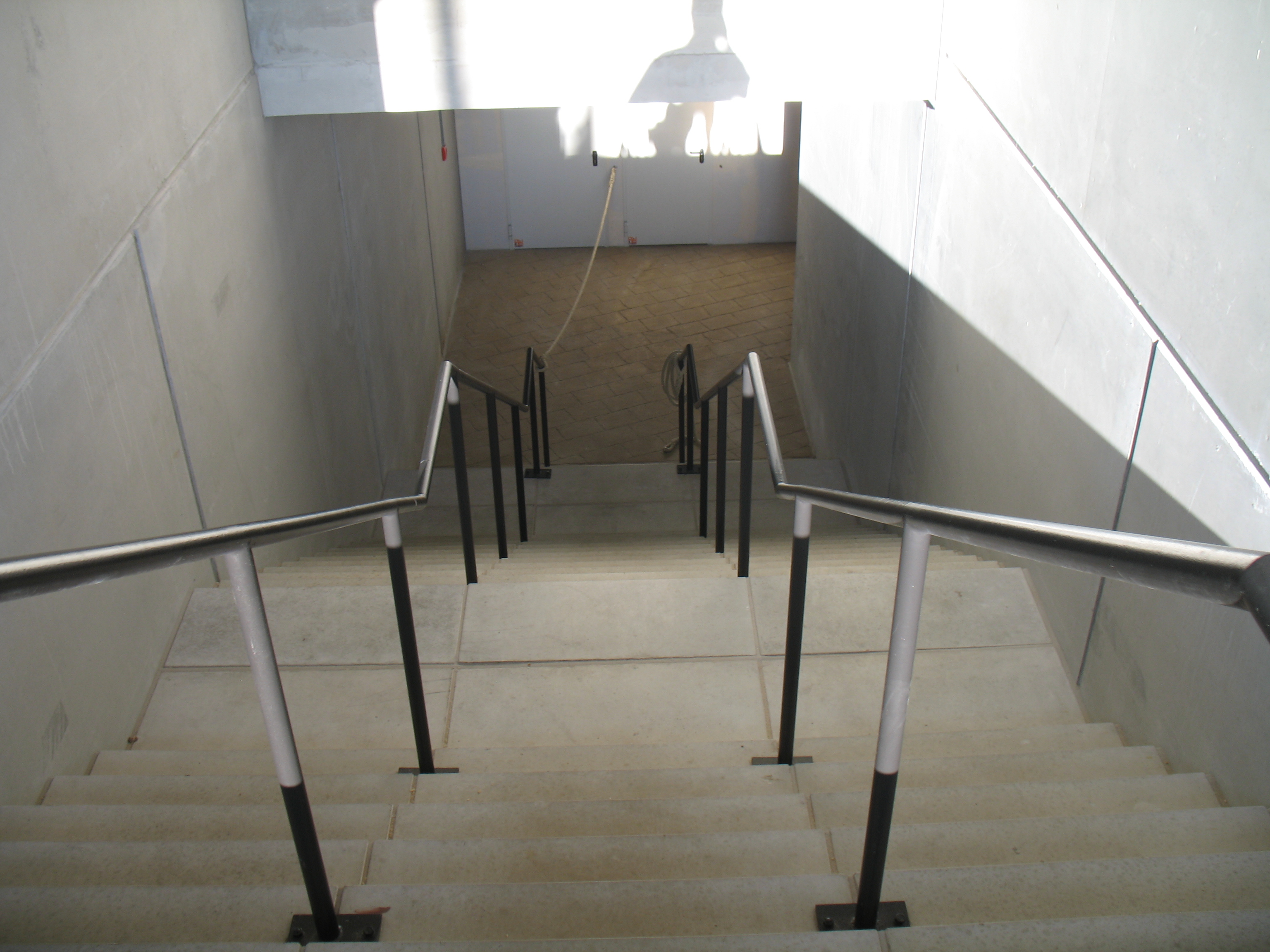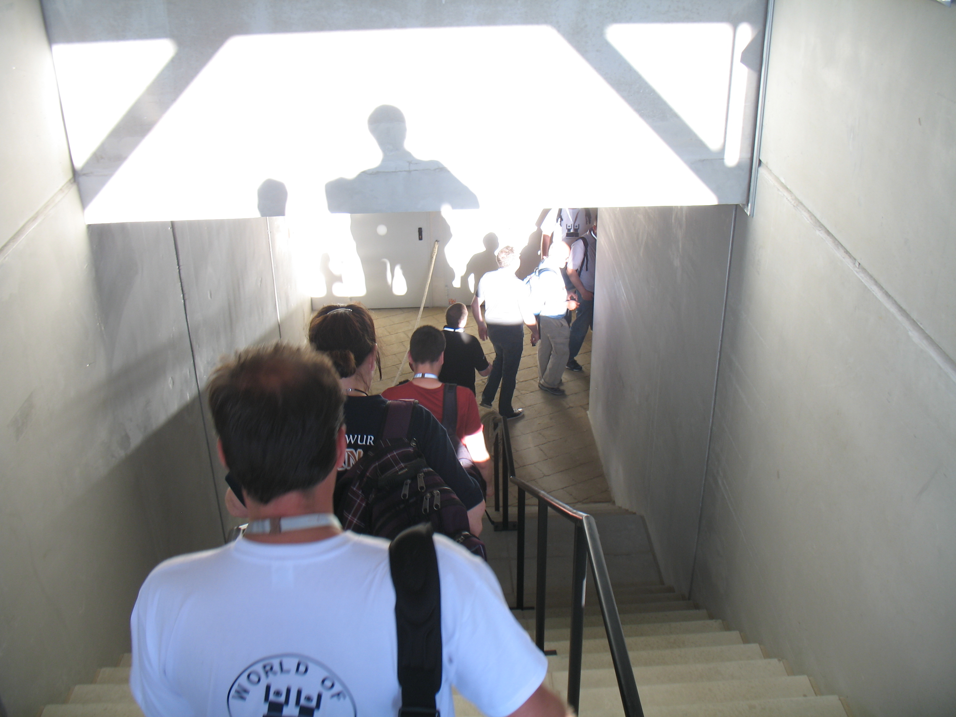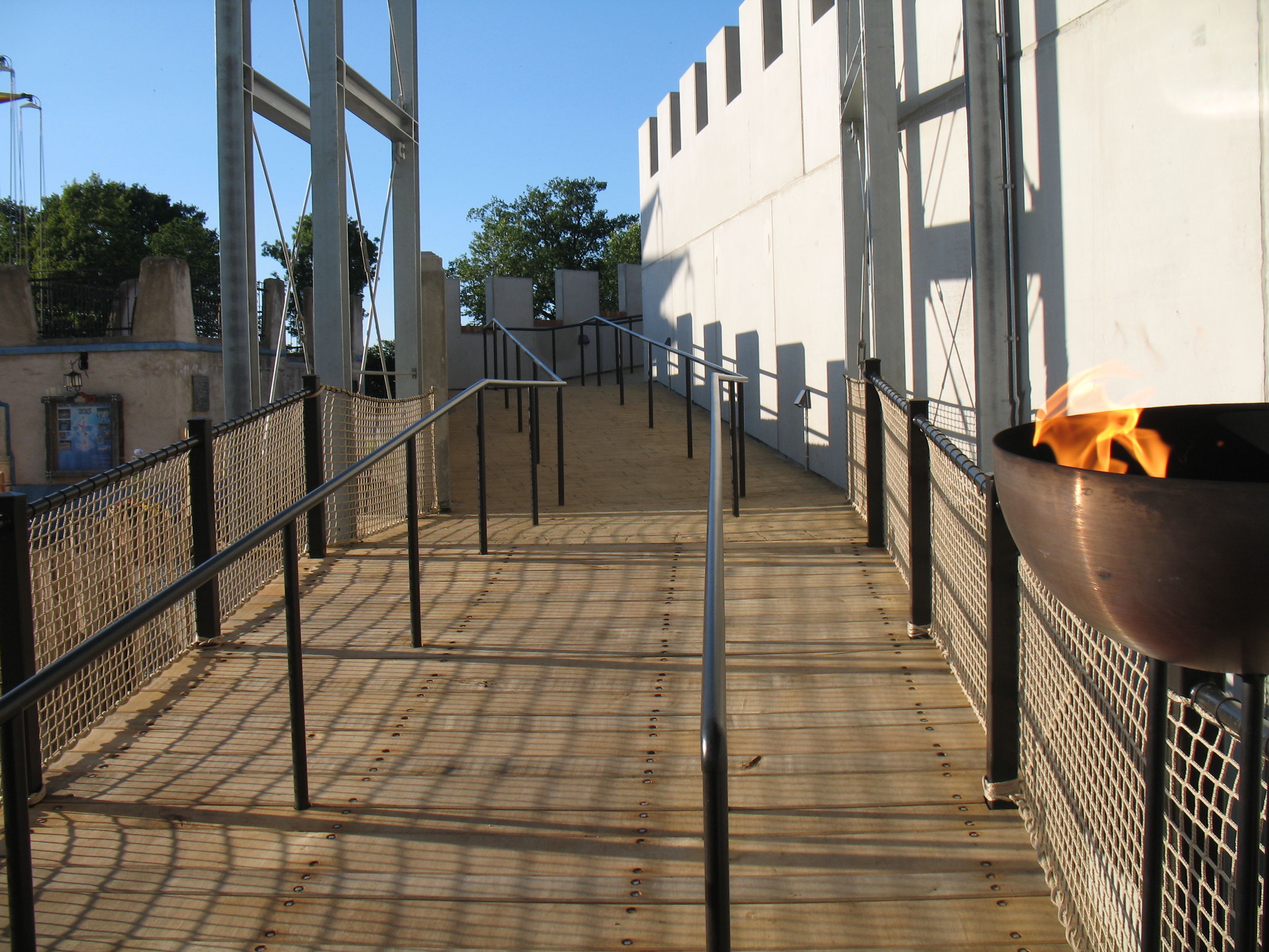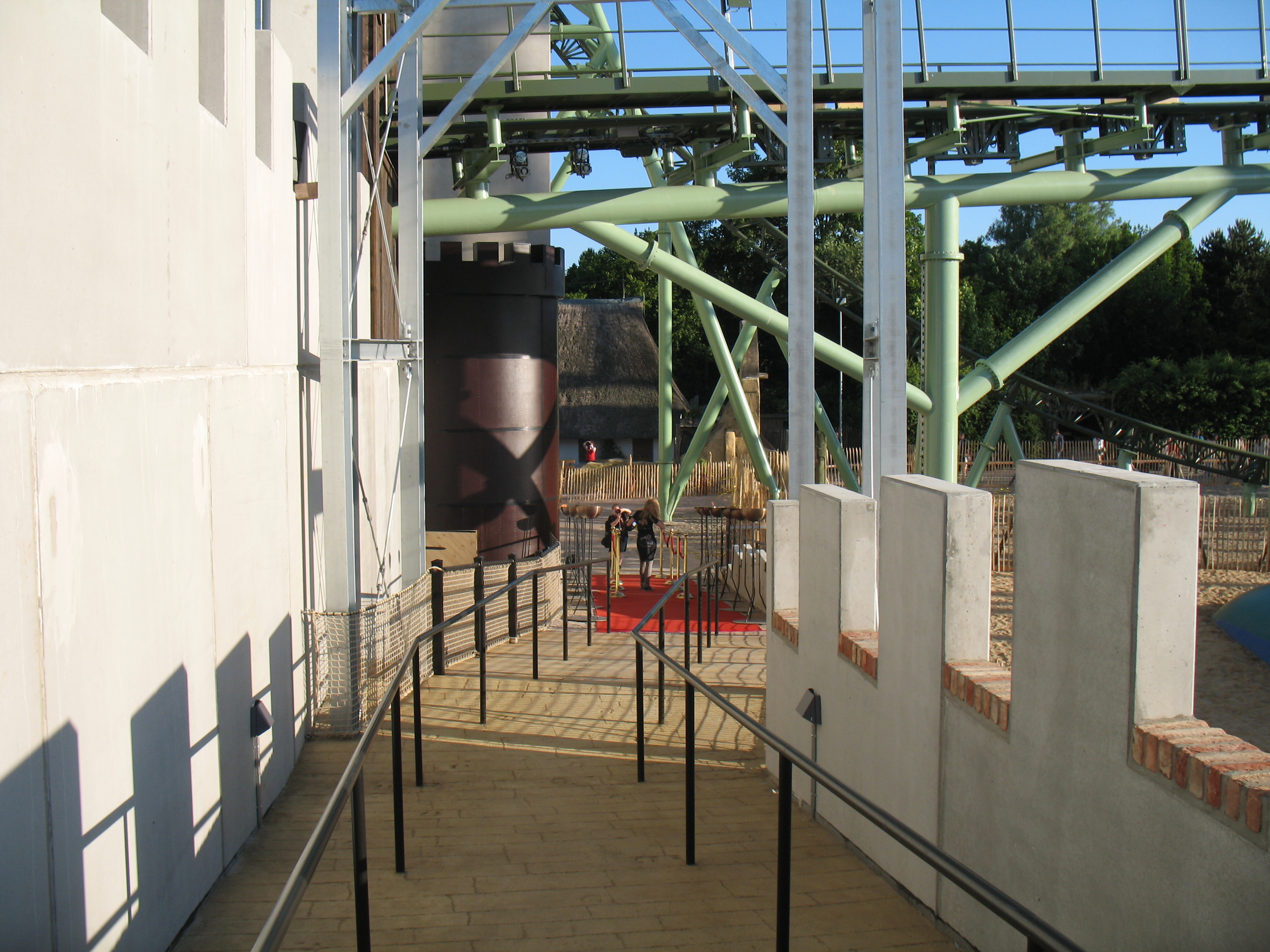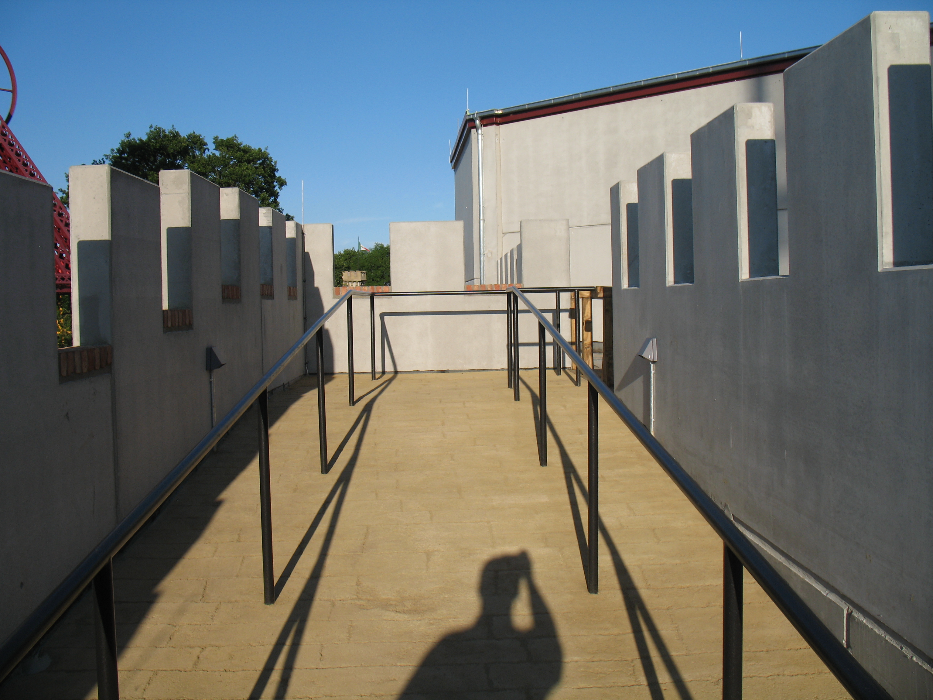 Die Aufgangsrampe ist, wie schon vorher zu erkennen war, in drei Reihen geteilt. Diese werden einmal für die nomale Warteschlange, einmal für die Single Rider und als Rettungs-/Fluchtweg benutzt. Hier fiel schon auf, das im Gegensatz zum Fluch die Reihen wesentlich breiter sind, man also aus den "Fehlern" gelernt hat und Optimierungen vorgenommen wurden. Die drei Reihen ziehen sich über das Dach und die Treppe ins Gebäude.