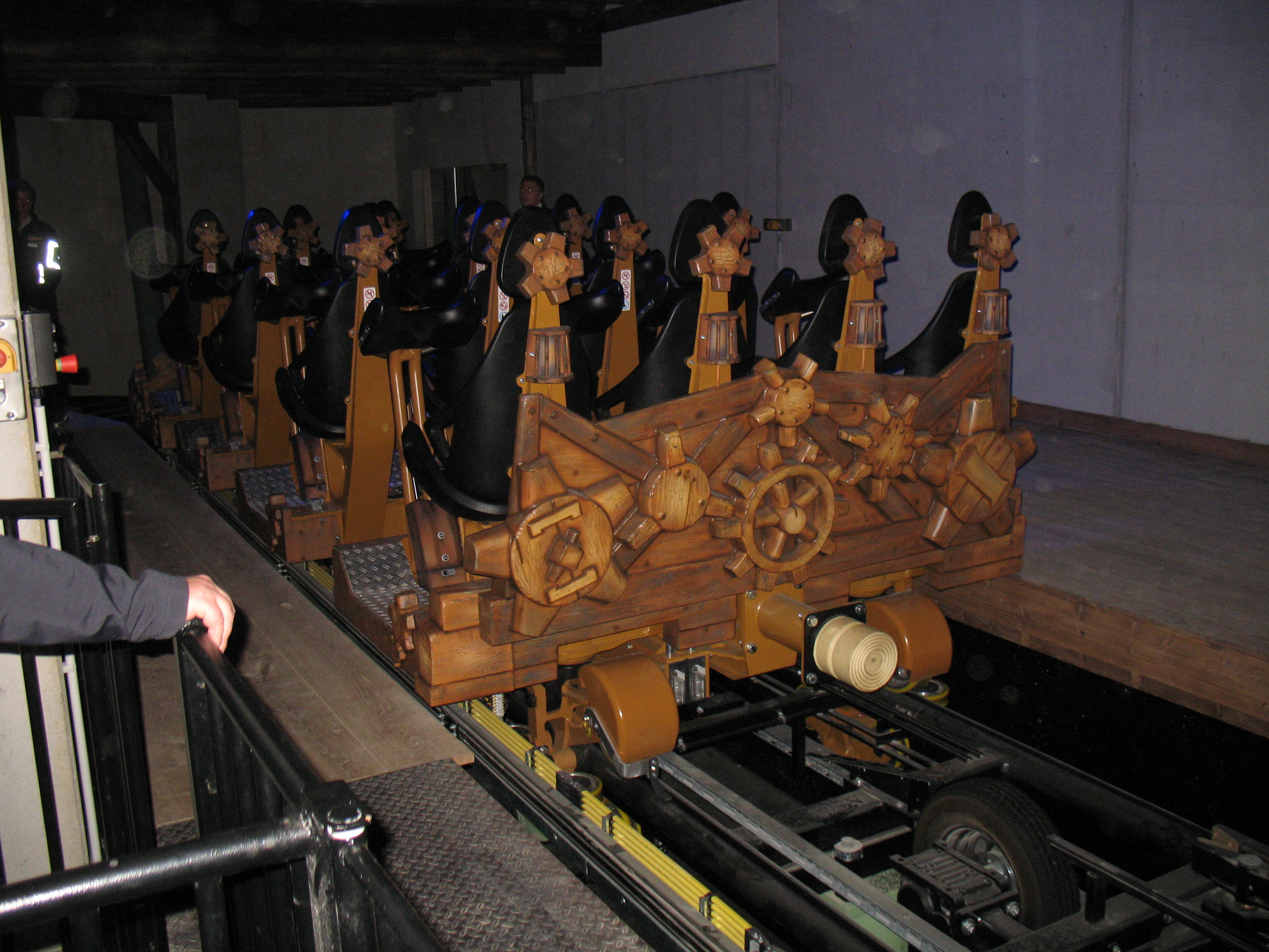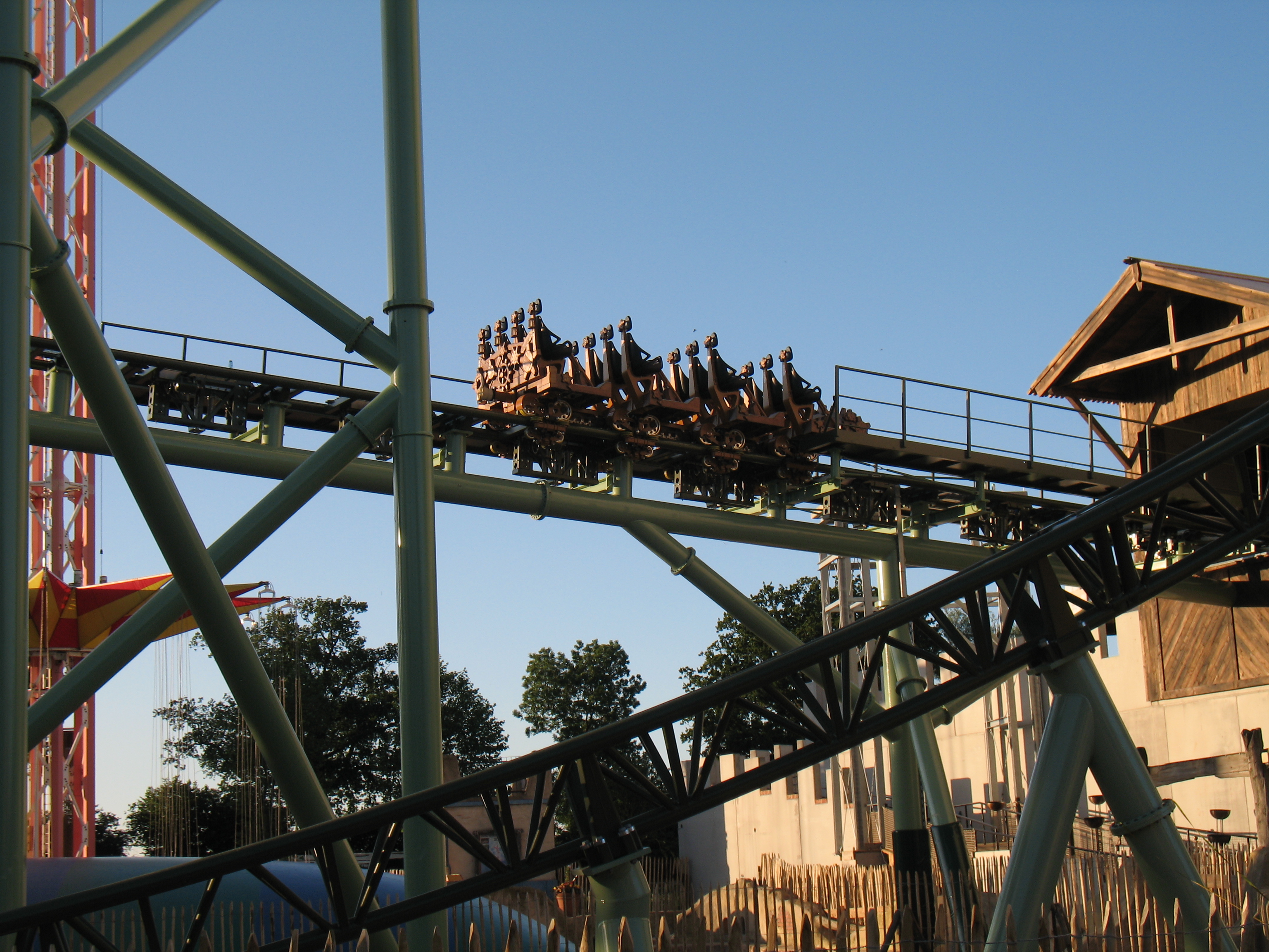 G-Kräfte enthält. Gerade nten angekommen geht es auch schon wieder fast senkrecht nach oben ins Herzelement. Dieses fährst sich sehr geschmeidig und relativ zügig. Nach der Ausfahrt geht es mit hoher geschwindigkeit in den Overbanked Turm an der Crazy Mine, dessen Ausfahrt einen kurzen, aber starken Richtungsrechsel enthält, bei dem die reinen Beckenbügel ihre freie Wirkung entfalten. Zusammen mit der erneuten starken Neigung bei der Überfahrt der Westerneisenbahn macht dieser Streckenabschnitt sehr viel Spaß und bietet ein Gefühl der Unkontolliertheit. Danach geht es in die Wende an der Barracuda Slide nach der sich eine sehr geschmeidige Kurvenkombination anschließt. Nach einer erneuten Wende geht es über den