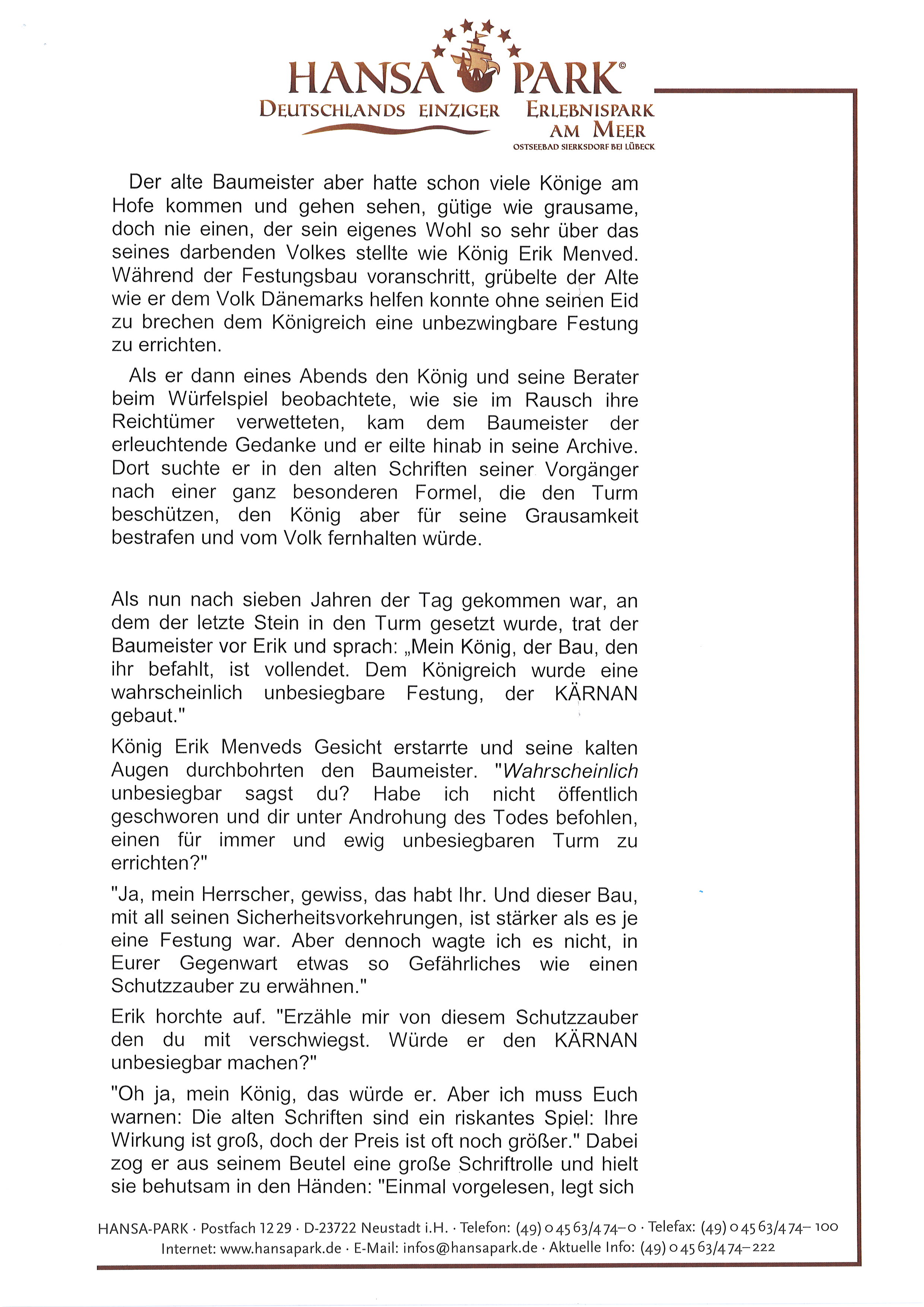 Fazit: Kärnan kanns... Die Bahn ist zwar in keiner Kategorie überlegen, aber bietet von allen spaßigen Elementen etwas. Hier wurde das Beste zu einer tollen Bahn kombiniert. Herausragend ist der freie Fall auf dem Lift, der für Erstbesucher sicher einen großen Schreckmoment bedeuten wird! Kärnan ist in meiner persönlichen Rangliste ganz weit oben und ich würde behaupten, dass Kärnan unter den Top 3 der besten Stahlcoaster Deutschlands ist. Diese Mischung an verschiedenen und einmaligen Elementen findet man nur hier!