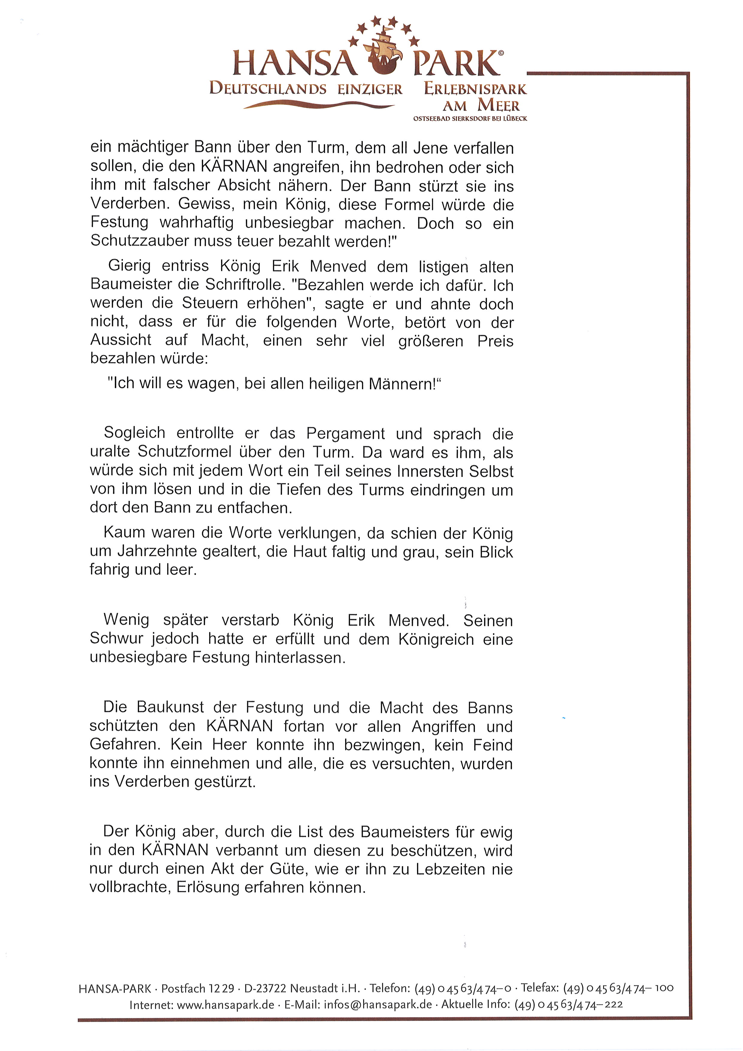 Herr Leicht begrüßte uns in charmanter und humorvoller Weise, bei der man Ihm seine Freude über die Eröffnung anmerkte. Der erste Punkt der Präsentation war nach der Nennung der reinen Bahnfakten die Backgroundstory von Kärnan, die uns durch einen Audiotrack nähergebracht wurde. Zur Fertigstellung der Thematisierung wird es noch eine Ridestory geben, die zwar auf der Bachgroundstory aufbauen wird, sich aber unterscheidet.