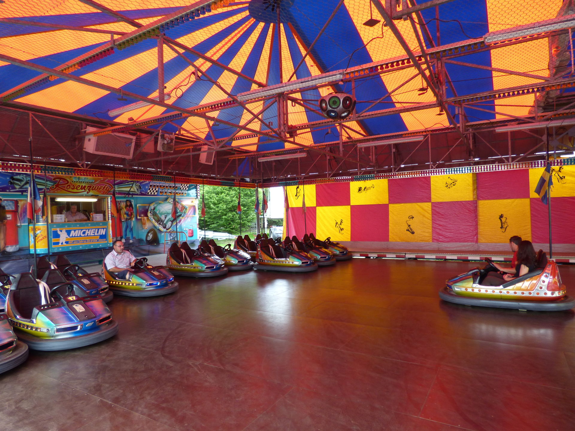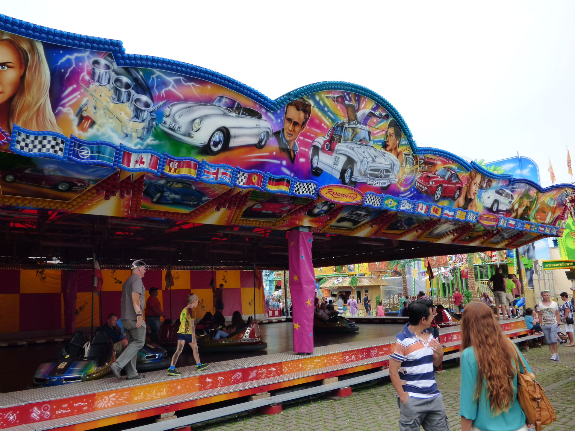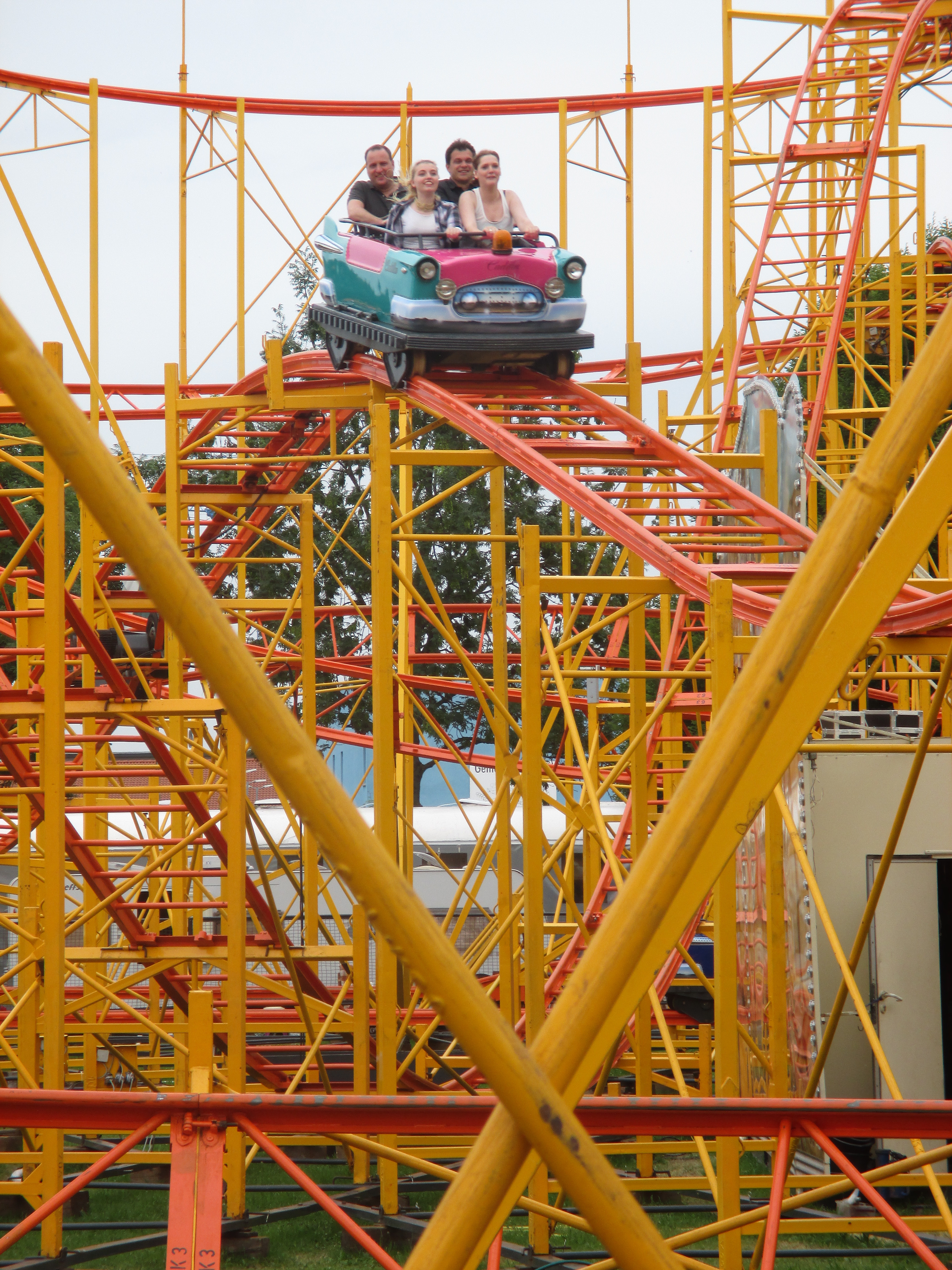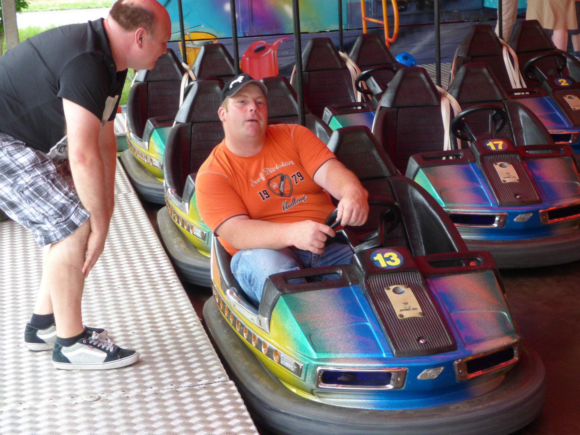 Beim Betreten des Platzes erblickten wir in der Ferne bereits Achterbahnenschienen. Wir begannen unserer Weg aber links herum und trafen somit vorbei an einem Kinderkarussell und einem Kinderflieger als erstes auf den Autoscooter von Rosenzweig. Thorsten nutzte die Gelegenheit zu einem Pläuschchen mit dem Schausteller über die Säulenkonstruktionen von Auto Scootern.