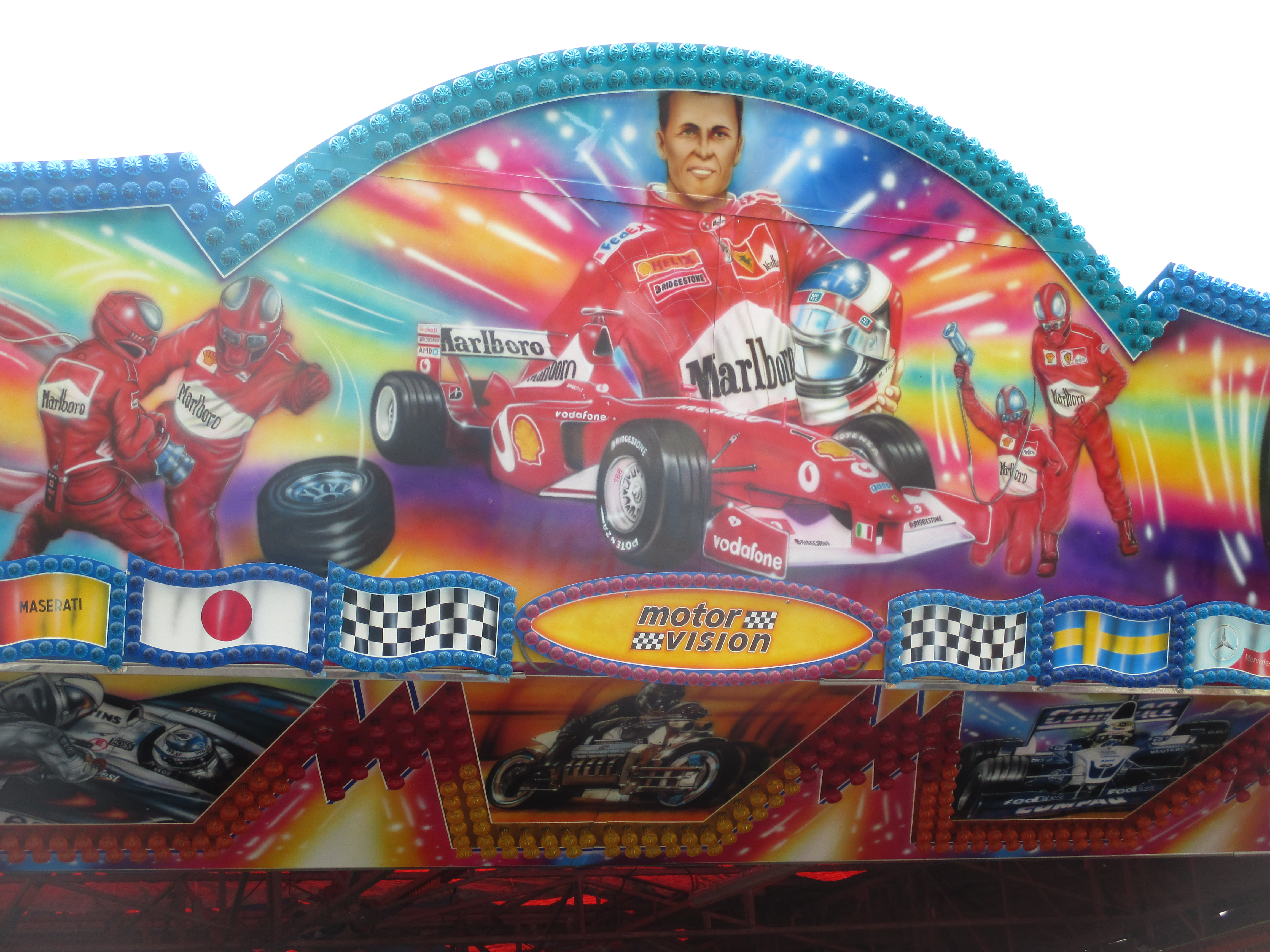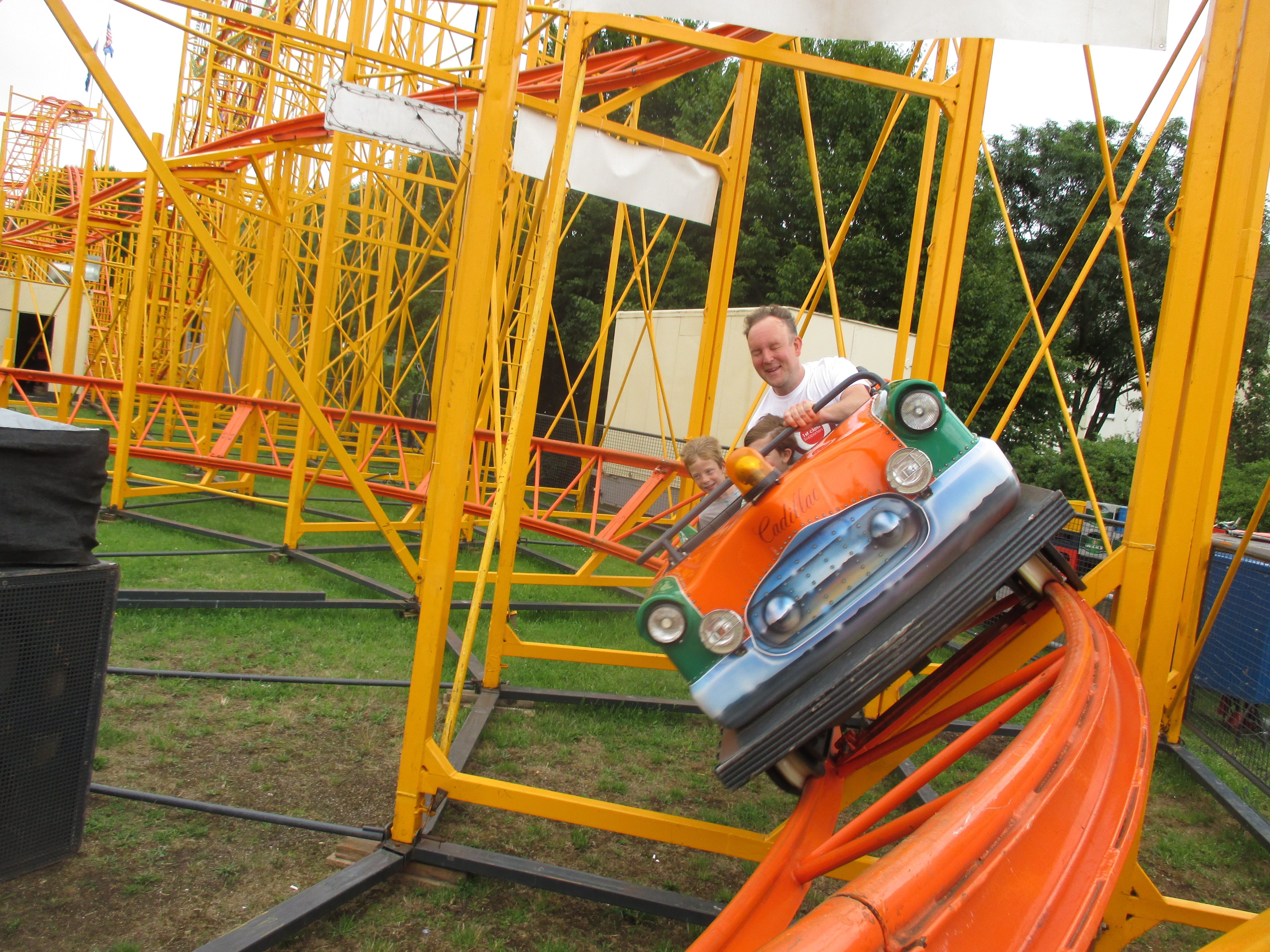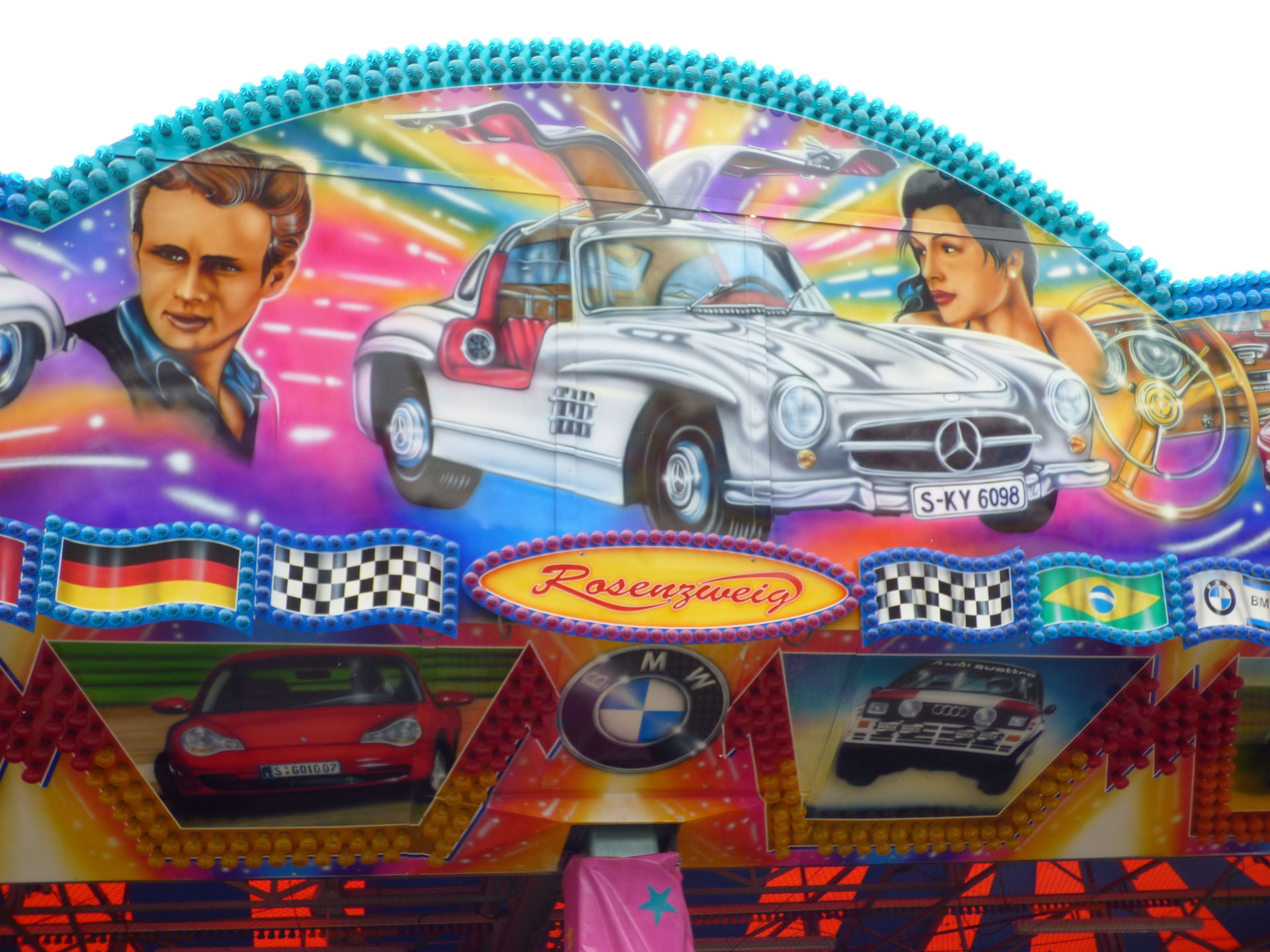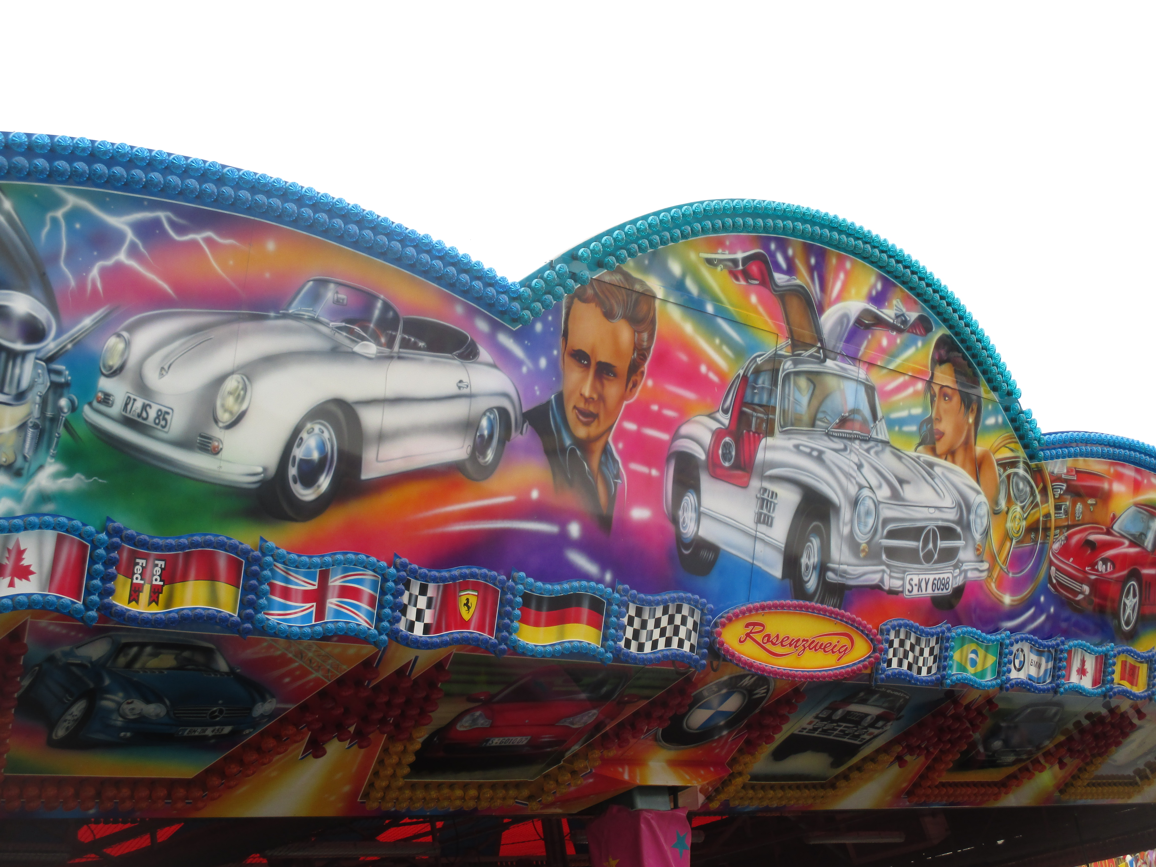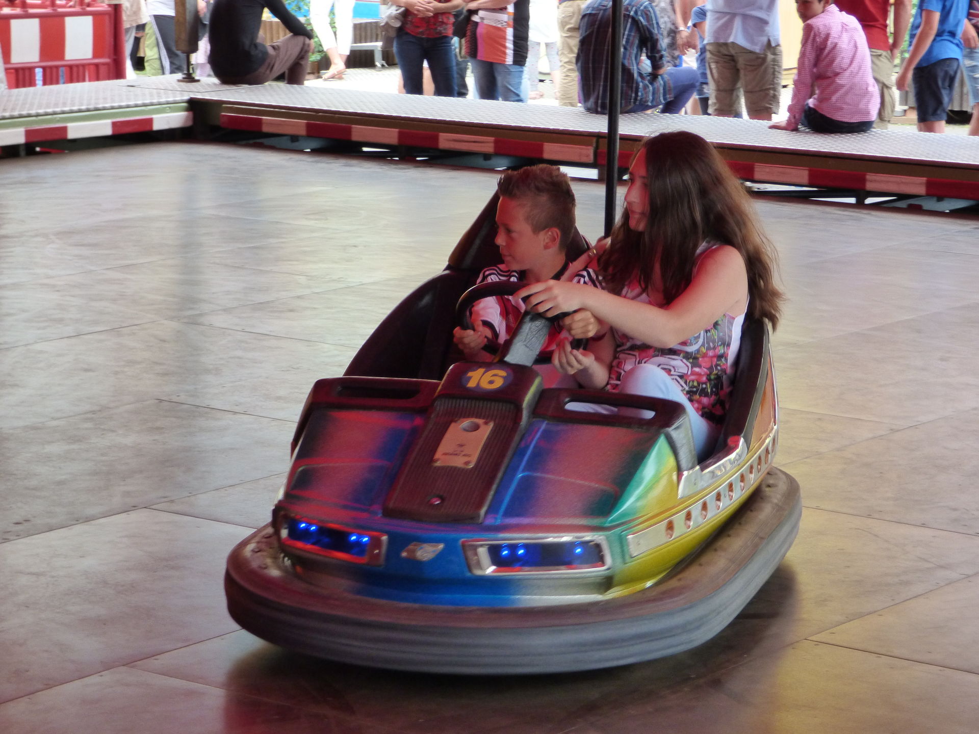Beim Betreten des Platzes erblickten wir in der Ferne bereits Achterbahnenschienen. Wir begannen unserer Weg aber links herum und trafen somit vorbei an einem Kinderkarussell und einem Kinderflieger als erstes auf den Autoscooter von Rosenzweig. Thorsten nutzte die Gelegenheit zu einem Pläuschchen mit dem Schausteller über die Säulenkonstruktionen von Auto Scootern.