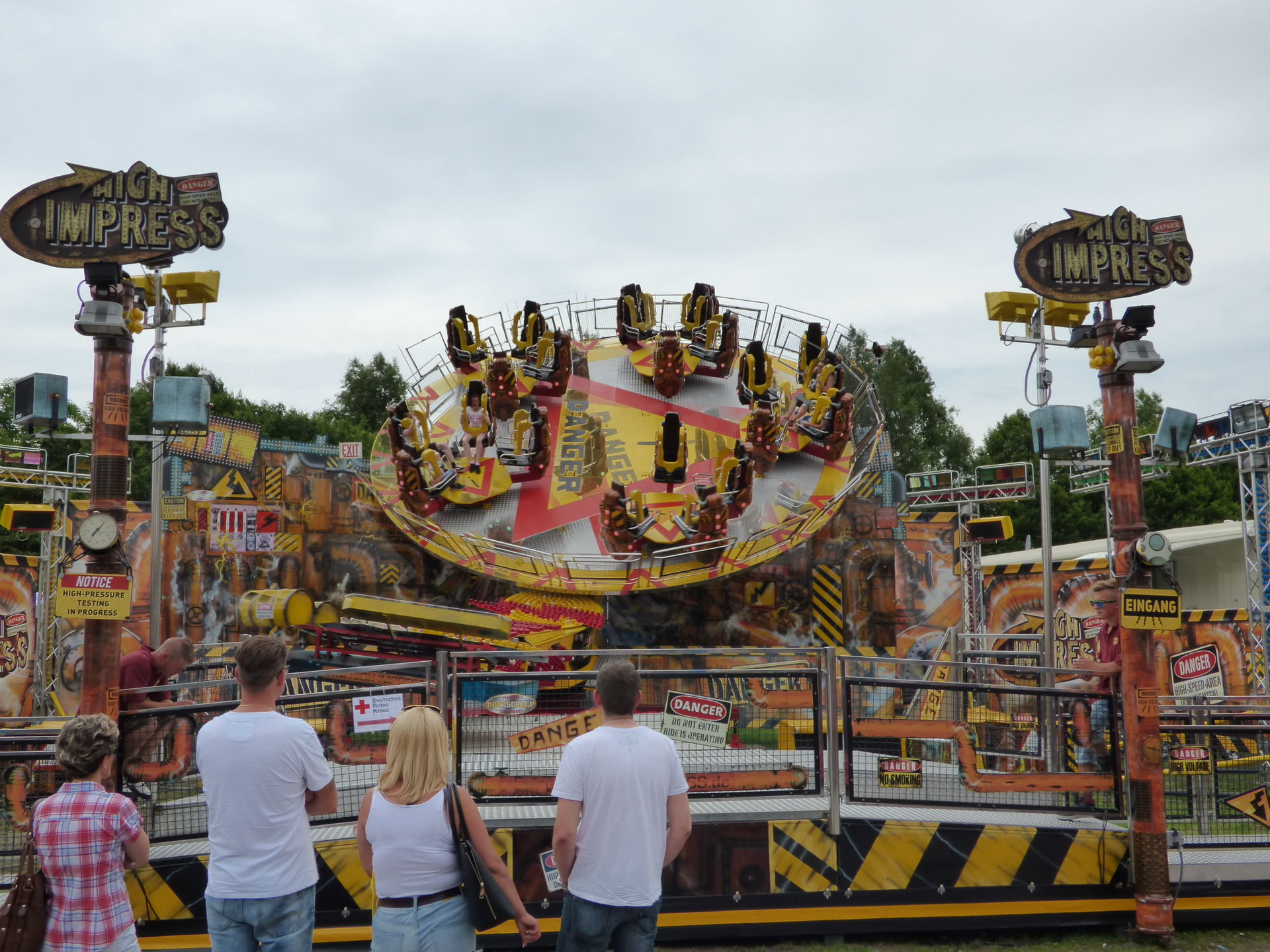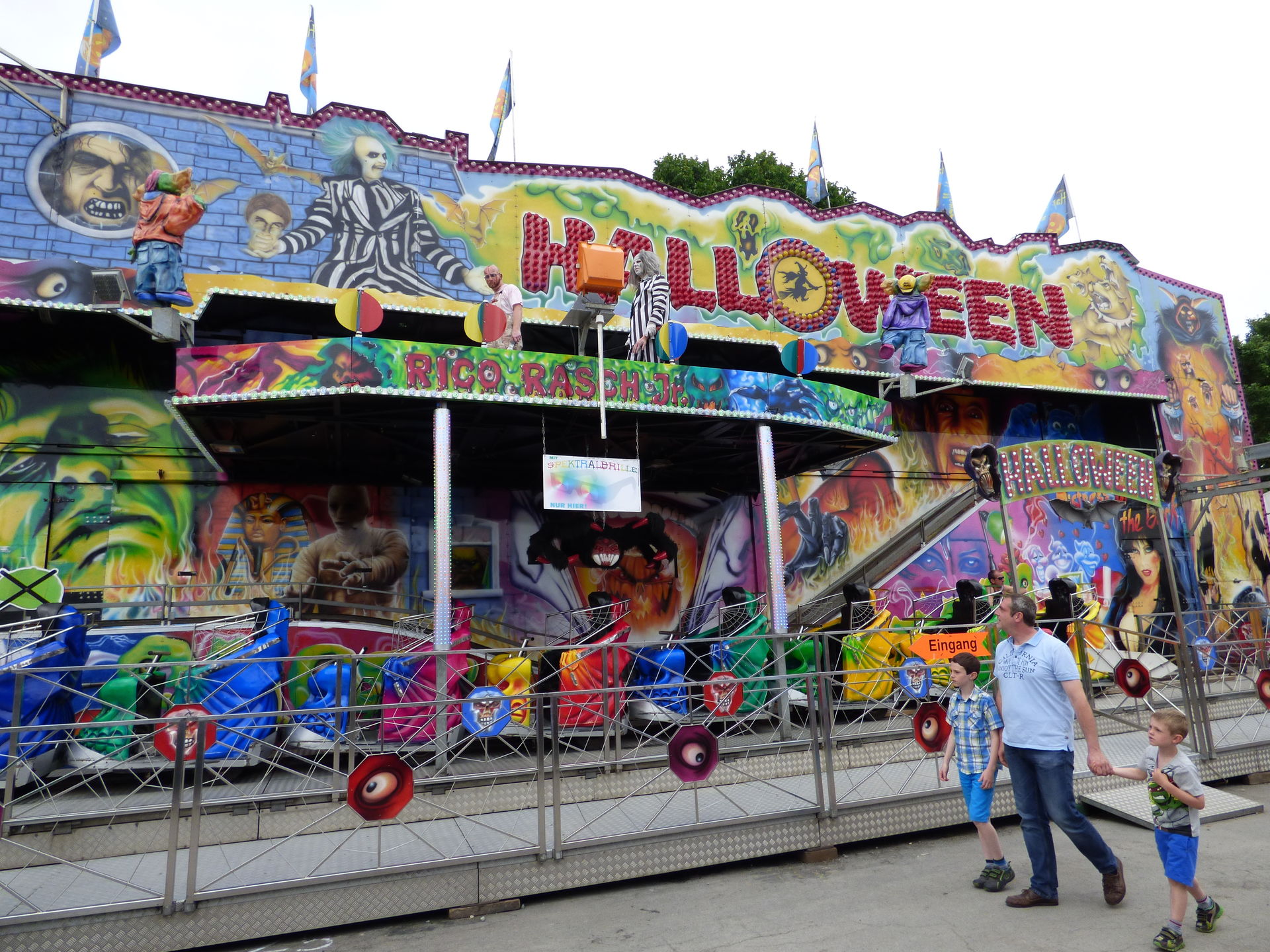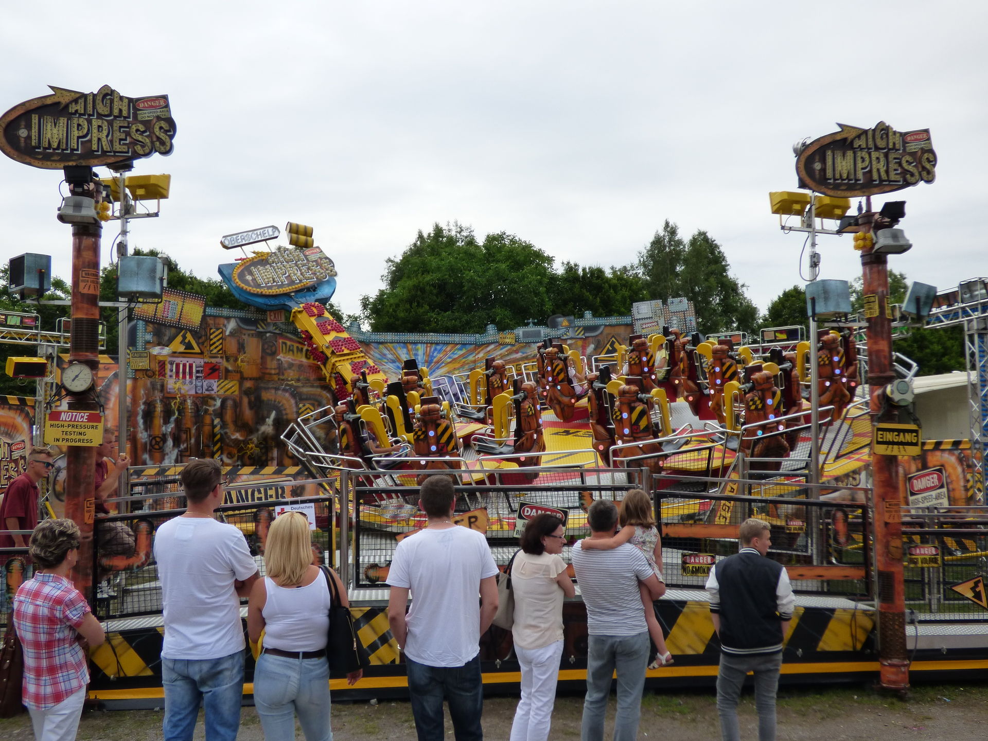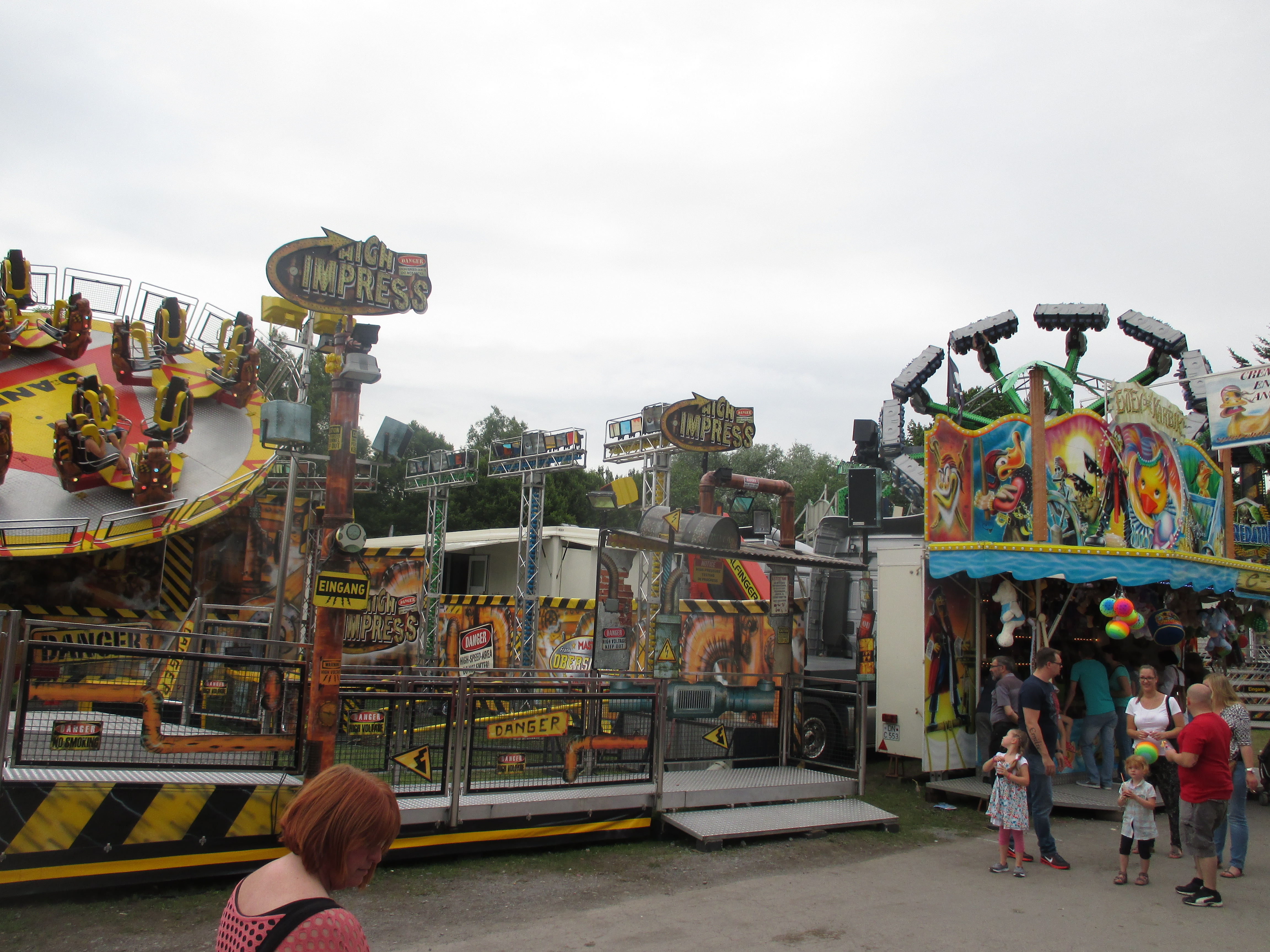 Der erste Eindruck im Vorbeifahren während der Parkplatzsuche war vielversprechend. Es waren Achterbahnschienen, Laufgeschäfte und wirbelnde Hochfahrgeschäfte zu erkennen. Scheint also ein recht gut bestückter Platz zu sein. Schnell den Wagen geparkt und dann konnte der erste Bummel über den Rummel an diesem Sonntag beginnen.